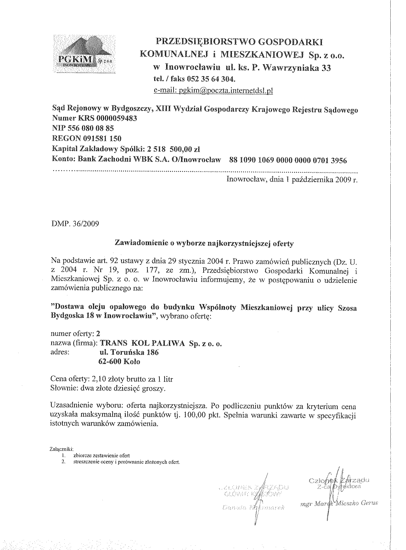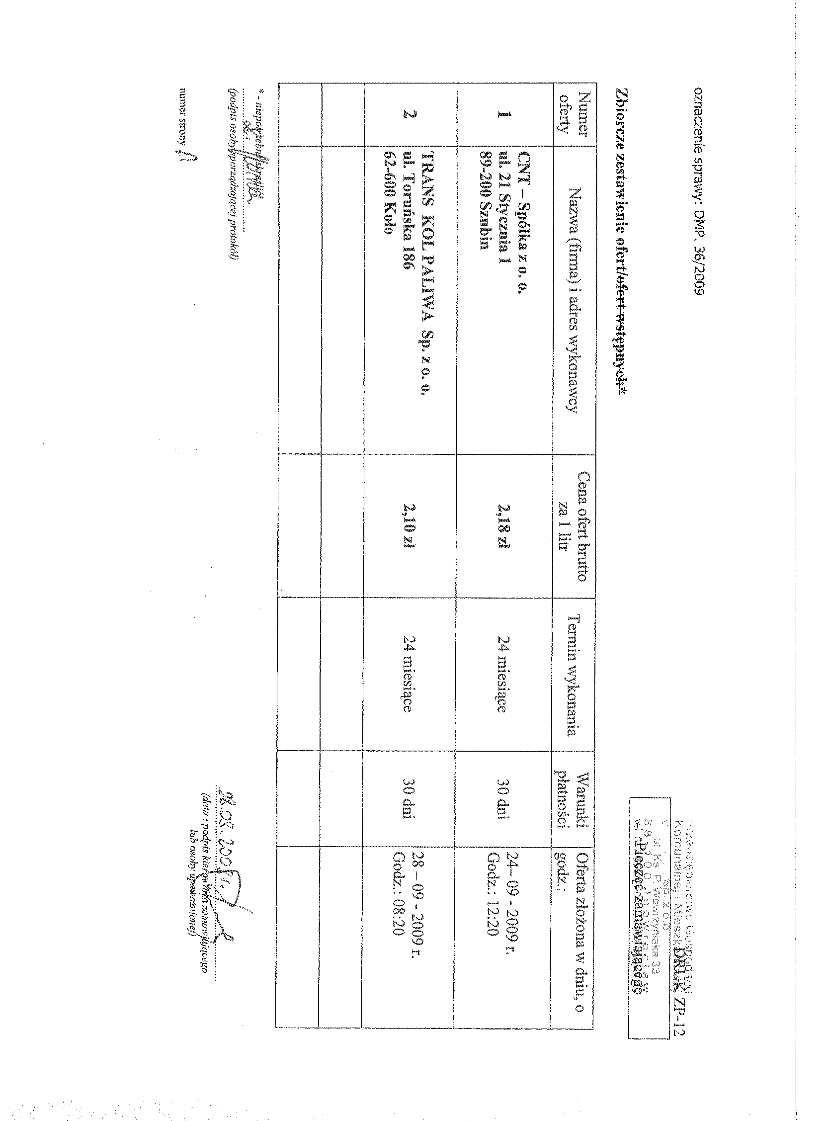 Znak sprawy: DMP. 36/2009聽聽聽聽聽聽聽聽聽聽聽聽Inowroc艂aw, dnia 11 wrze艣nia 2009 r.聽 聽
