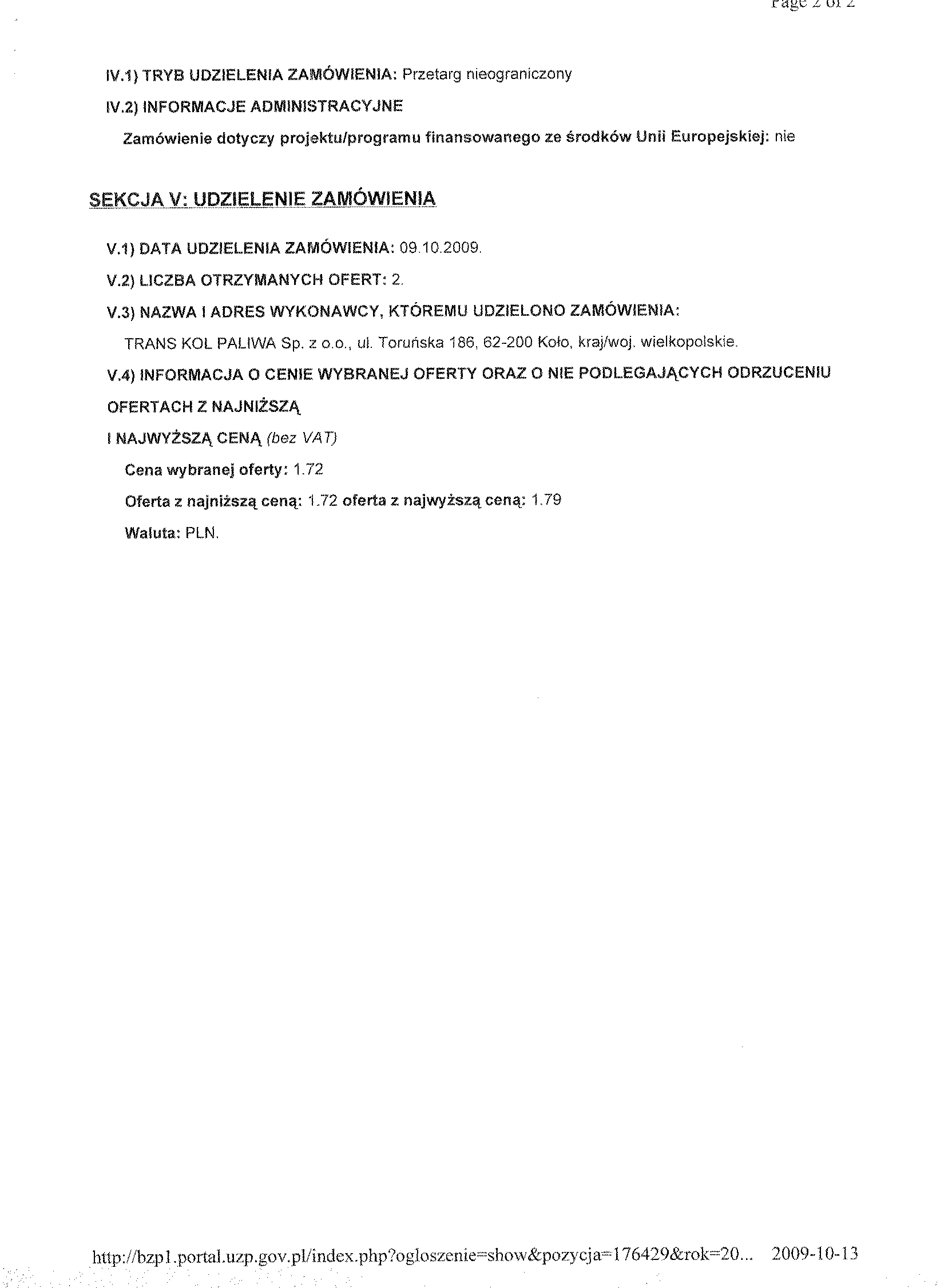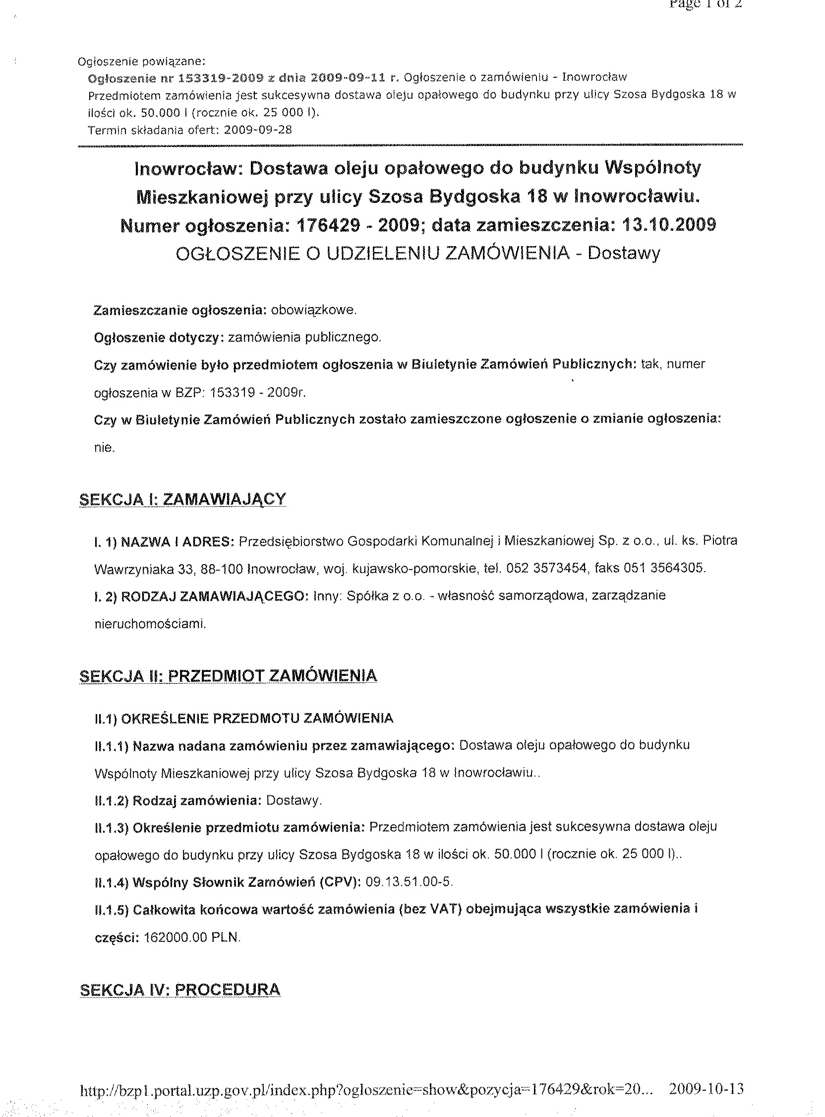 Numer og艂oszenia w BZP: 153319 - 2009; data zamieszczenia 11/09/2009 Na stronie internetowej: 11/09/2009 聽