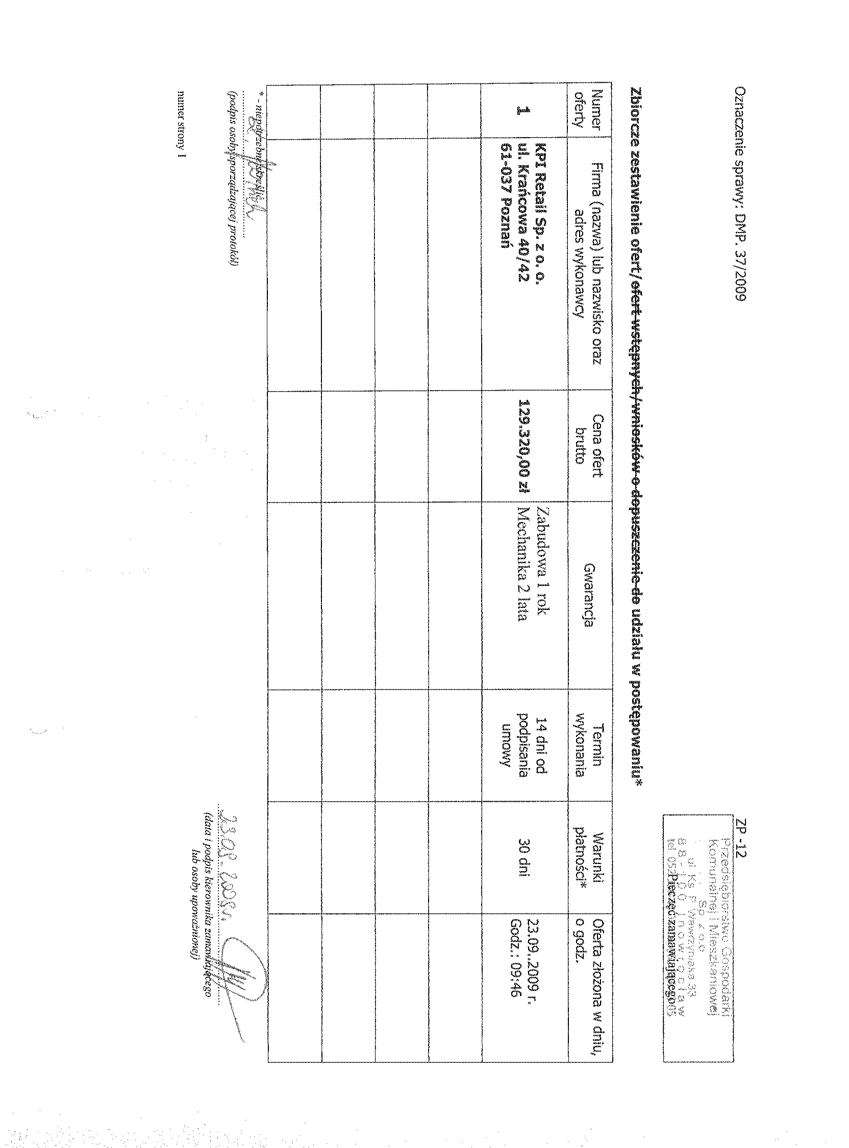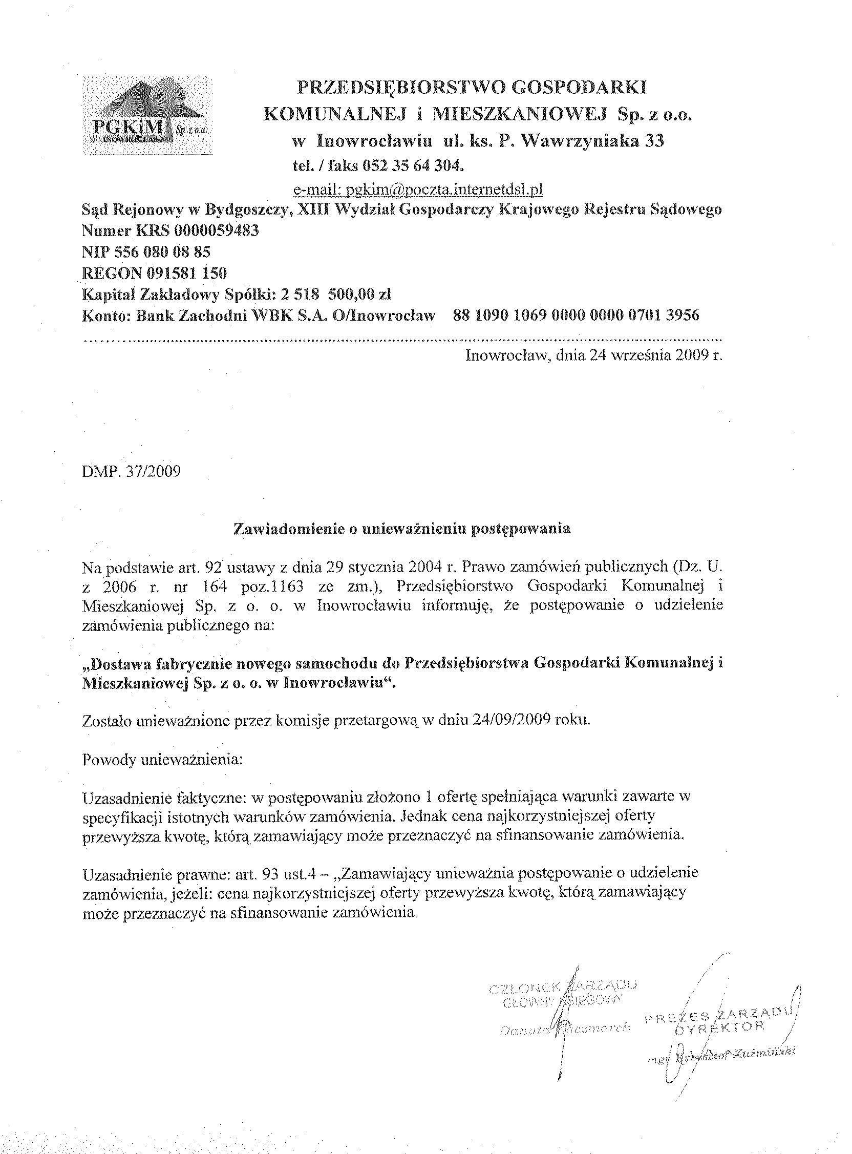 Numer sprawy: DMP. 37/2009聽聽聽聽聽聽聽聽聽聽Inowroc艂aw, dnia 14 marca 2009 r.聽聽 聽