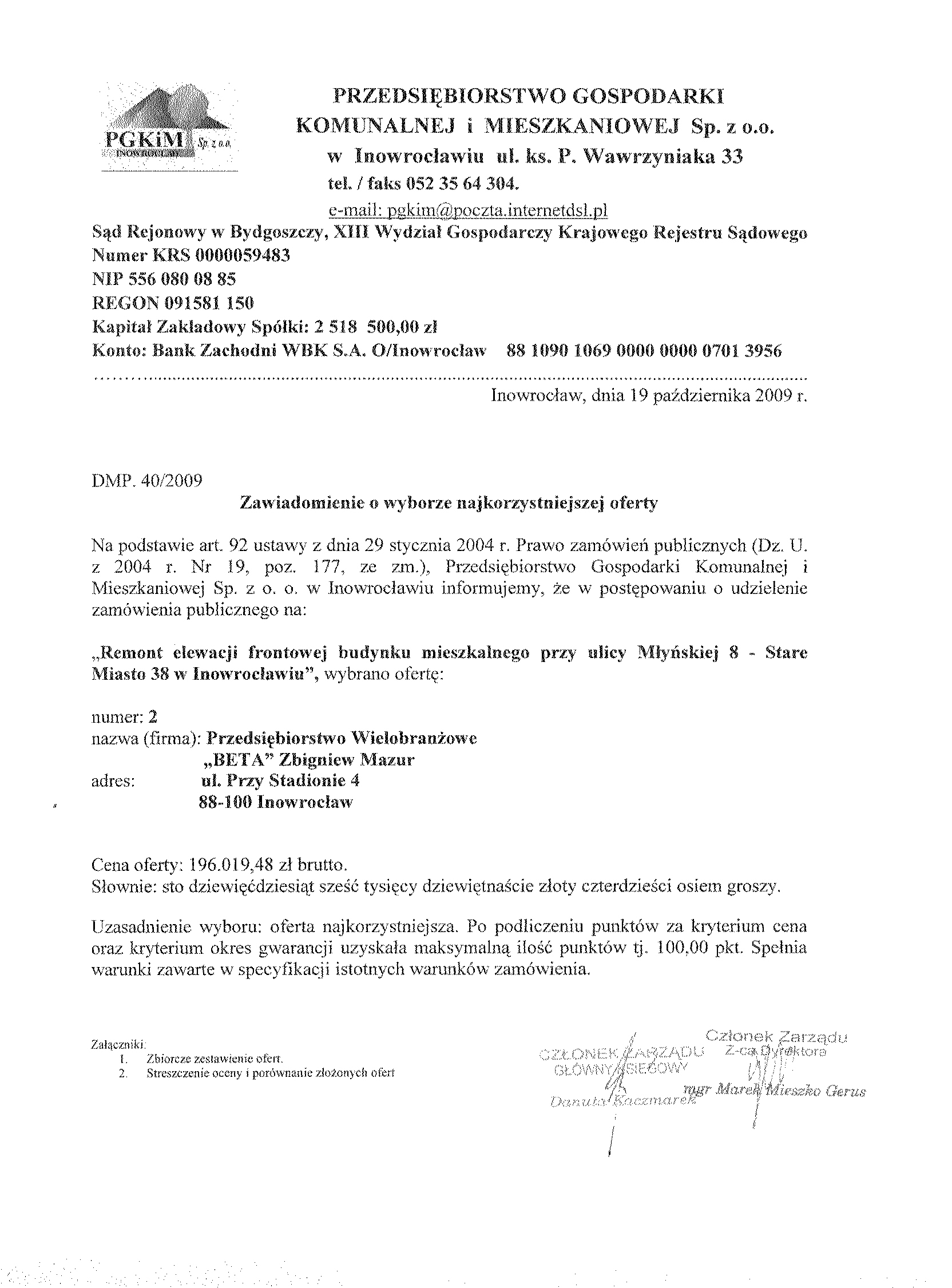 聽 Nazwa: Miasto Inowroc艂aw ul. Roosevelta 36/38, w imieniu i na rzecz, kt贸rego dzia艂a na mocy powierzenia, Przedsi臋biorstwo Gospodarki Komunalnej i Mieszkaniowej Sp. z o.o. w Inowroc艂awiu,