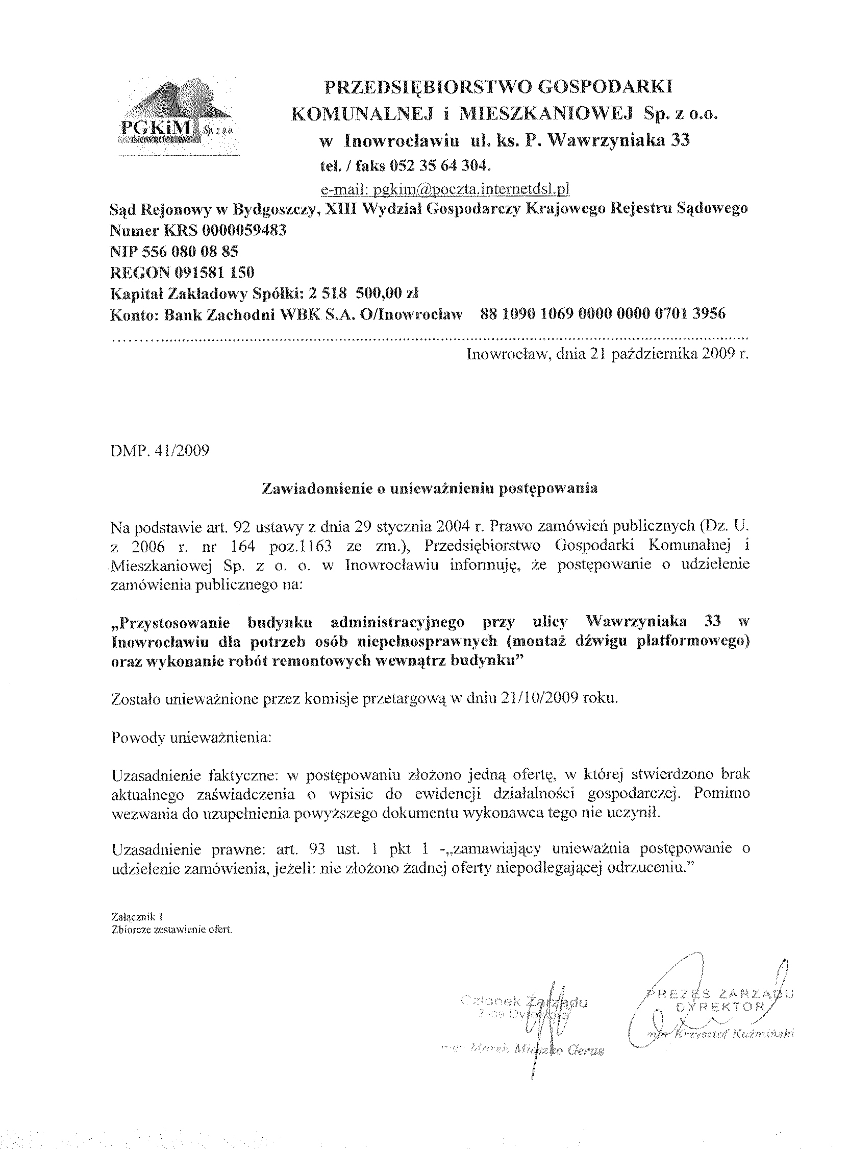 聽 1. Zamawiaj膮cy: Przedsi臋biorstwo Gospodarki Komunalnej i Mieszkaniowej Sp. z o.o. w Inowroc艂awiu 聽 Adres pocztowy: Ulica: ks. Piotra Wawrzyniaka 33 Kod: 88-100, Miejscowo艣膰: Inowroc艂aw Telefon / faks 052 35 64聽304 Adres strony internetowej: www.pgkimino.pl e-mail: pgkim@poczta.internetdsl.pl聽 聽