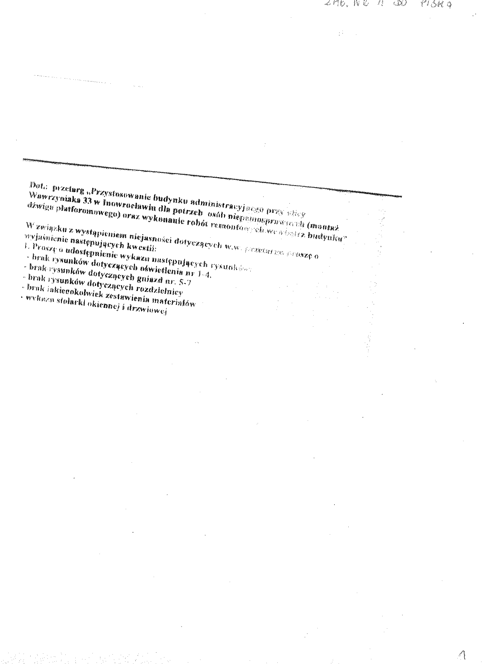 1.1. Osobami uprawnionymi do kontakt贸w z Wykonawcami s膮: a) w cz臋艣ci formalnej zam贸wienia - Krystyna Glonek, tel./ faks 052 35 64 304, b) w cz臋艣ci merytorycznej zam贸wienia - Anna Nawrocka, Mariusz Minta, tel. 052聽35 64聽325. 聽 1.2. Op艂ata za otrzymanie specyfikacji istotnych warunk贸w zam贸wienia b臋dzie pokrywa膰 jedynie koszty jej druku oraz przekazania. 1.3. Wykonawca zainteresowany post臋powaniem powinien z艂o偶y膰 wniosek u zamawiaj膮cego z podaniem wszystkich danych firmy - niezb臋dnych do przekazywania zmian i zapyta艅 dotycz膮cych powy偶szego post臋powania. 聽 2. Nazwa nadana zam贸wieniu: "Przystosowanie budynku administracyjnego przy ulicy Wawrzyniaka 33 w Inowroc艂awiu dla potrzeb os贸b niepe艂nosprawnych (monta偶 d藕wigu platformowego) oraz wykonanie rob贸t remontowych wewn膮trz budynku".
