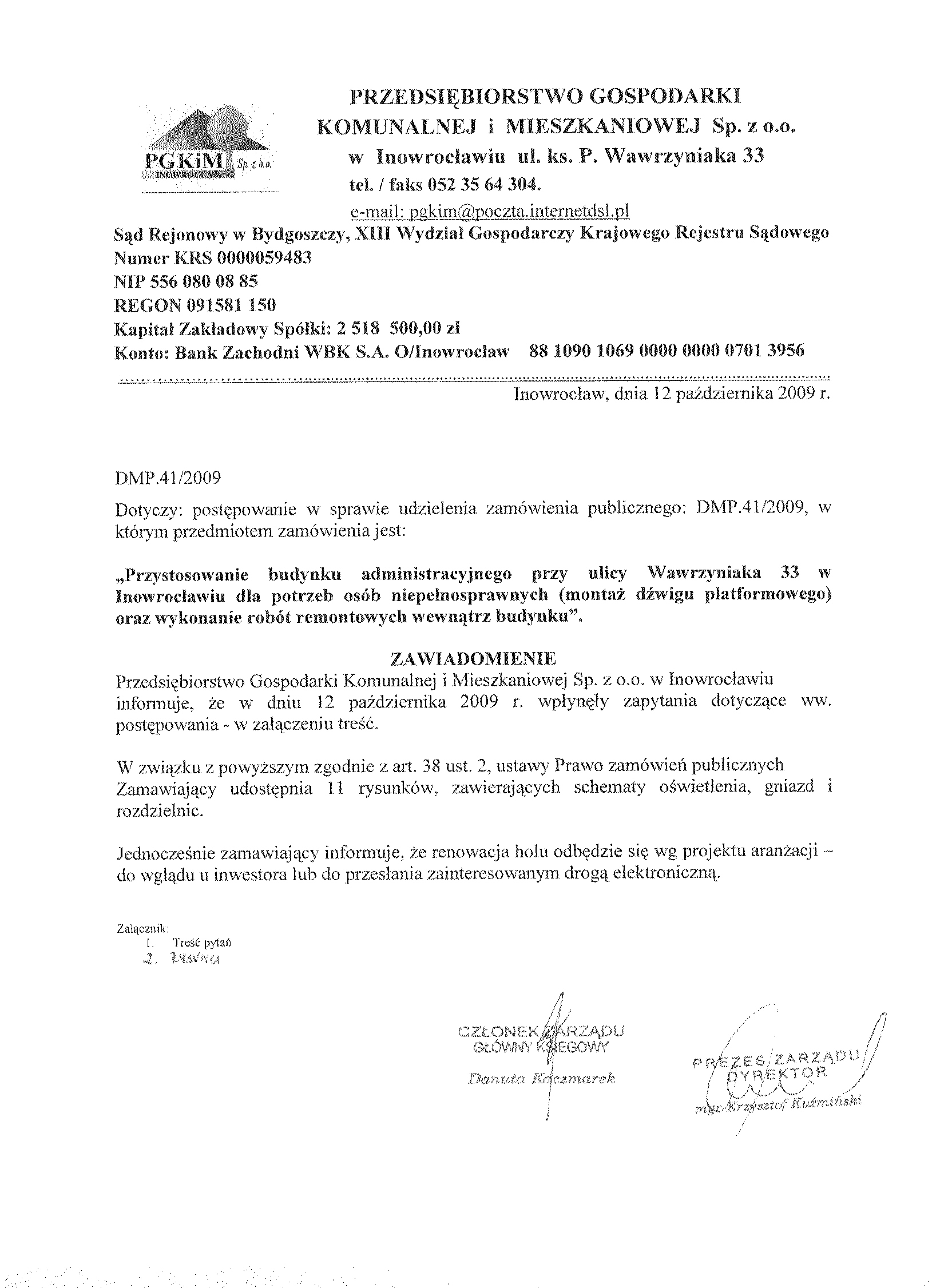 8. Miejsce i termin otwarcia ofert: Przedsi臋biorstwo Gospodarki Komunalnej i Mieszkaniowej Sp. z o.o., ul. ks. Piotra Wawrzyniaka 33, 88-100 Inowroc艂aw, dnia 20 pa藕dziernika 2009 r. o godzinie 10:00 聽 9. Termin zwi膮zania ofert膮: 30 dni . 聽