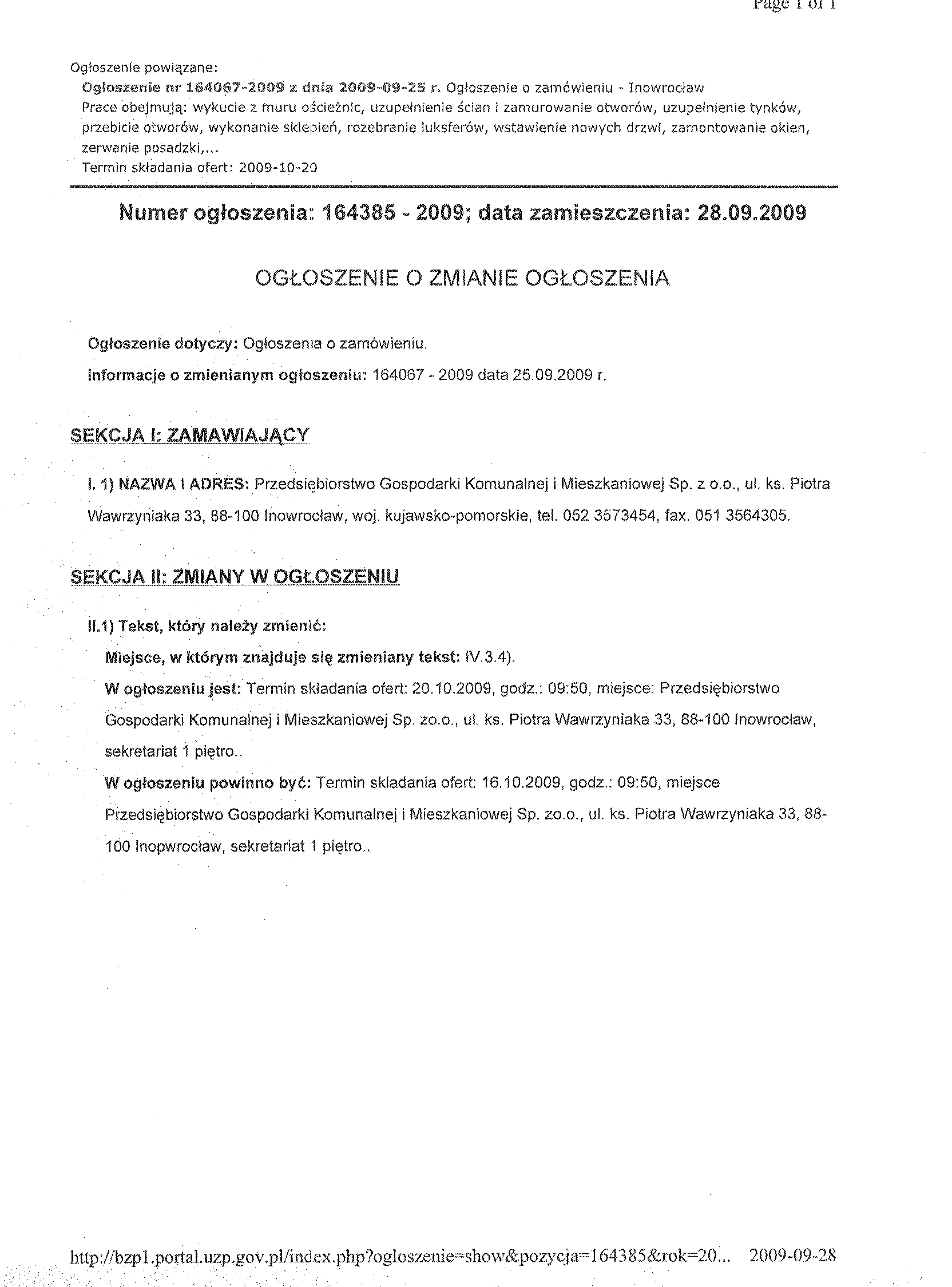 Numer og艂oszenia w BZP: 164067 - 2009; data zamieszczenia 25/09/2009 r. 聽