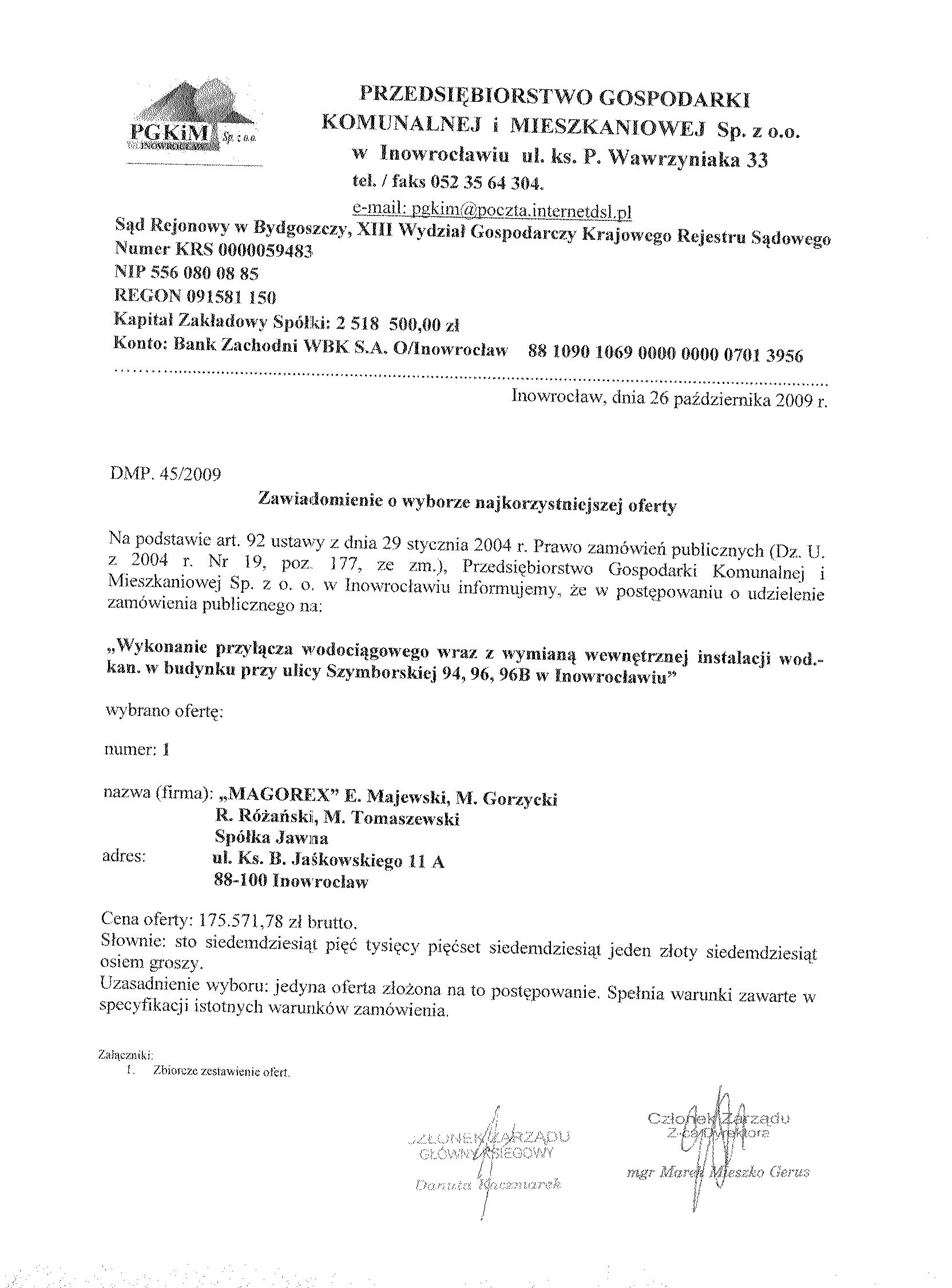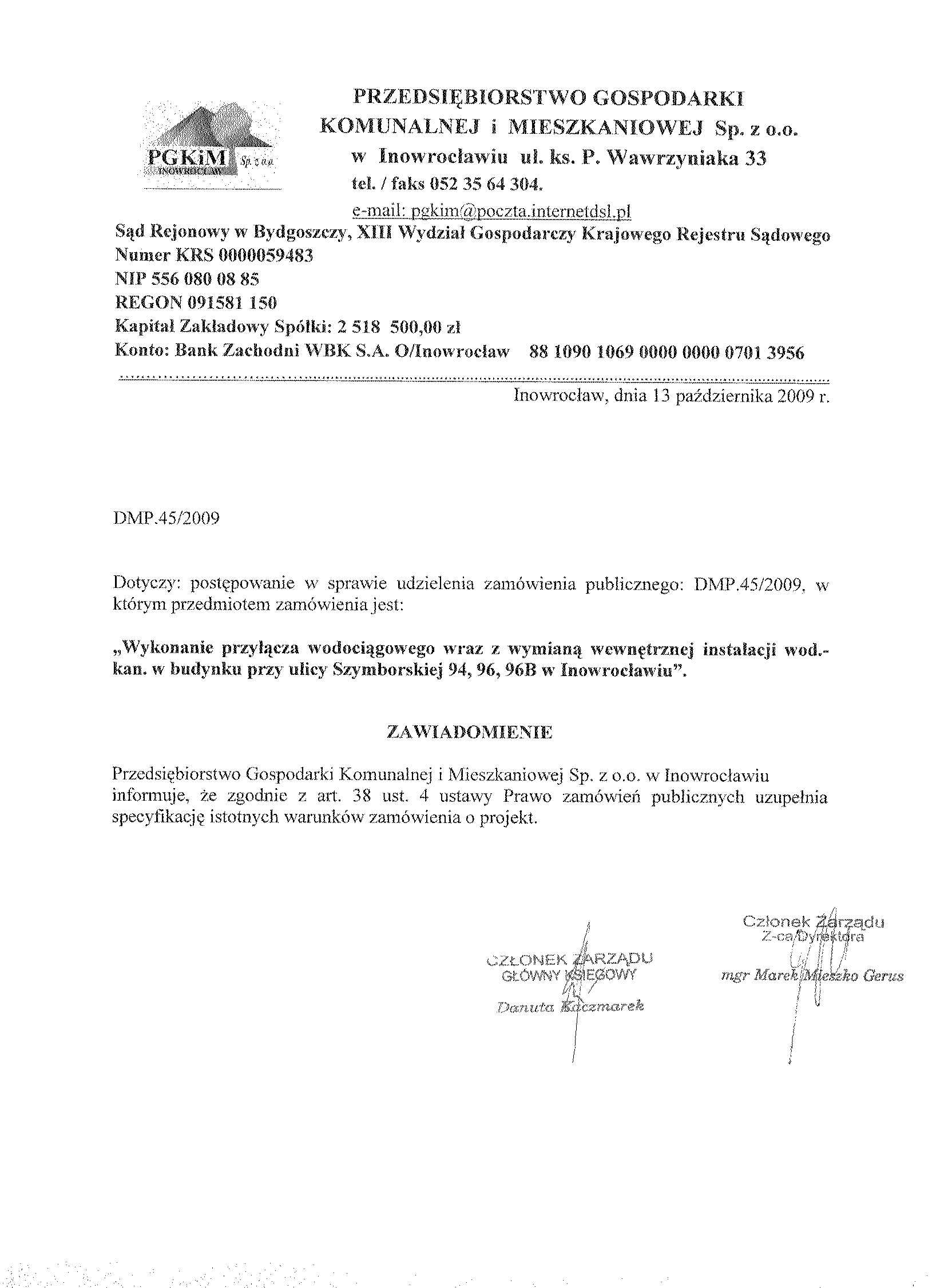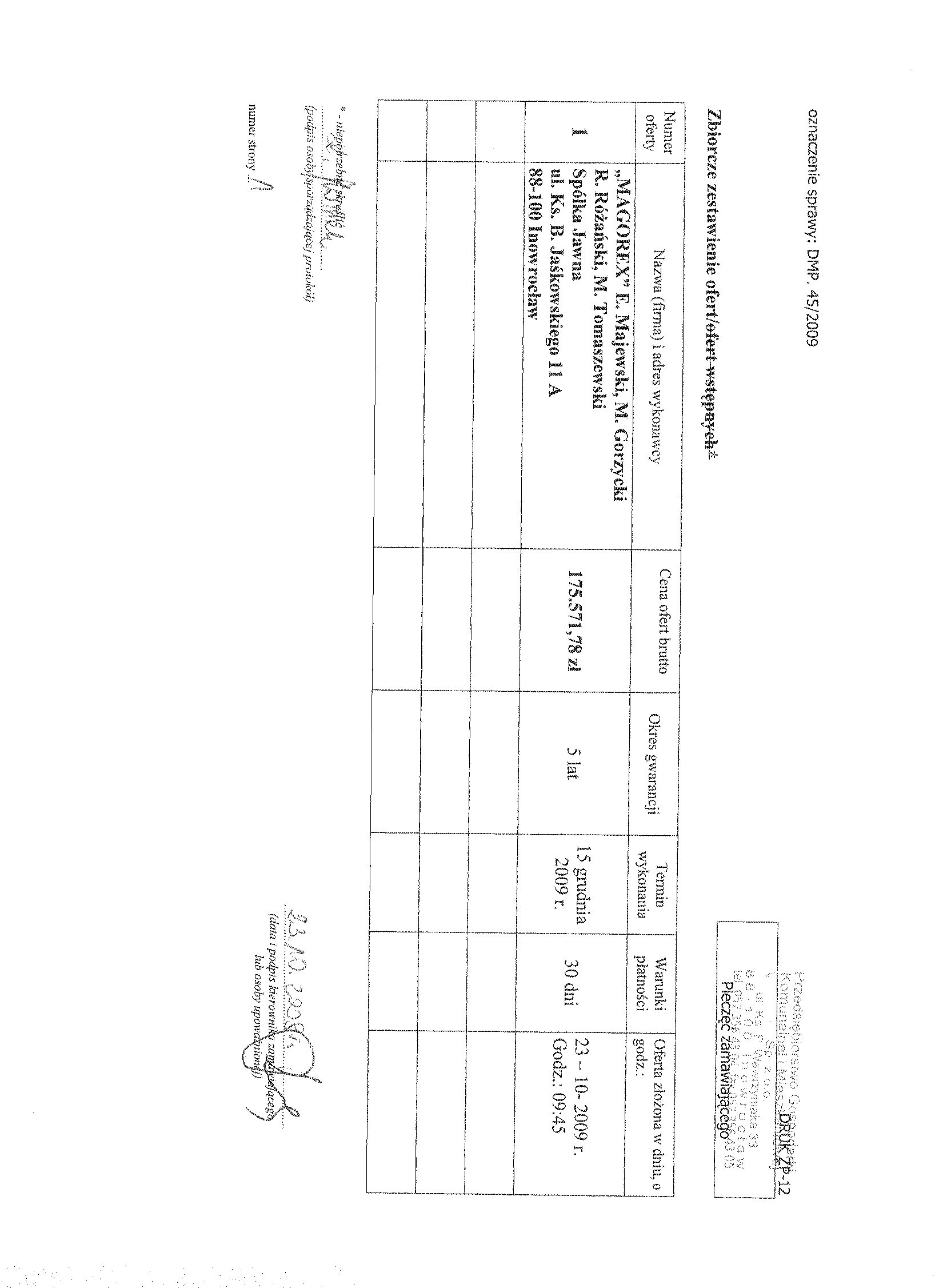 Numer sprawy: DMP. 45/2009聽聽聽聽聽聽聽聽聽聽聽聽聽聽聽聽聽聽聽聽聽聽聽聽聽聽聽聽Inowroc艂aw, dnia 2 pa藕dziernika 2009 r.聽聽 聽