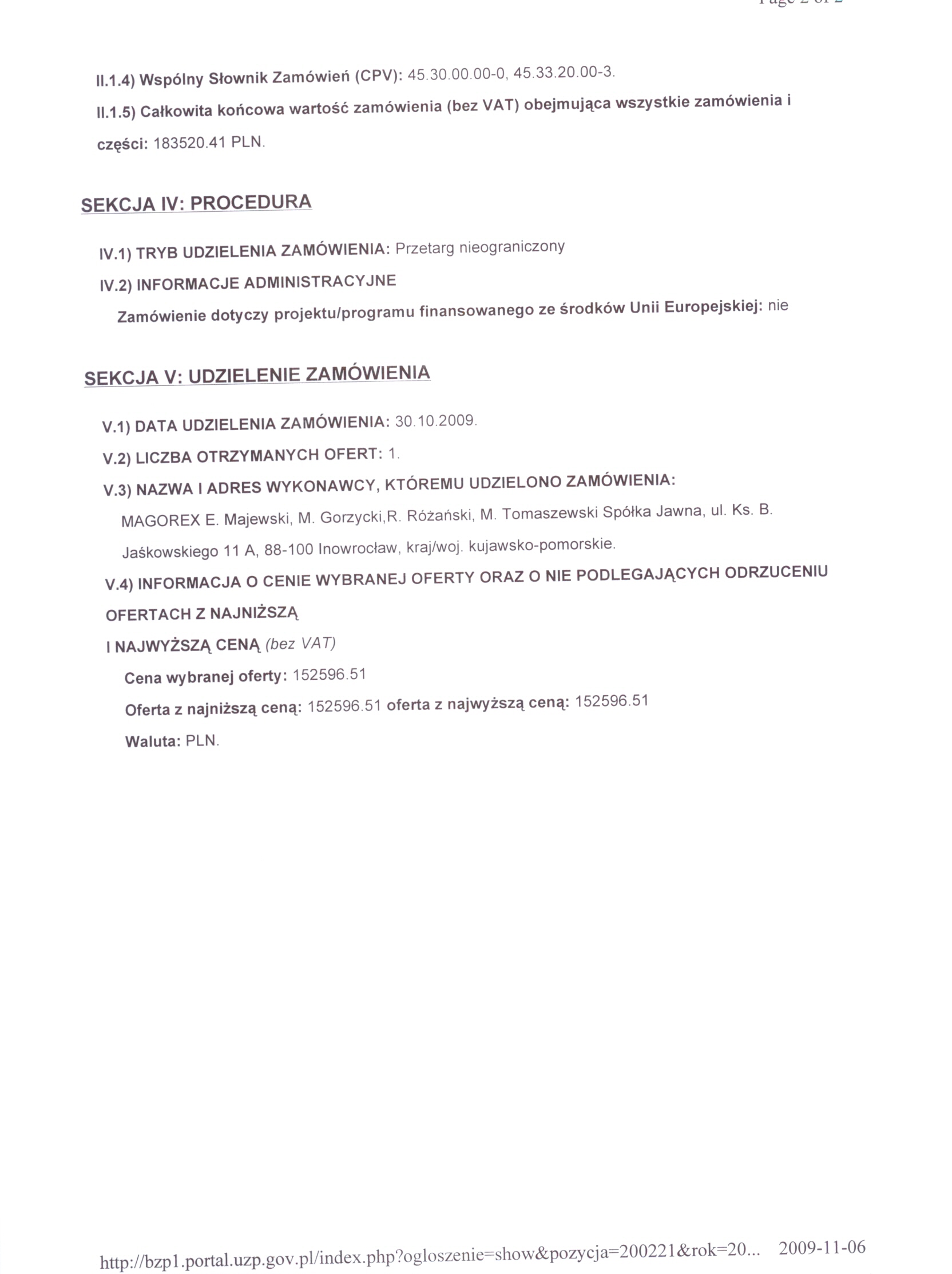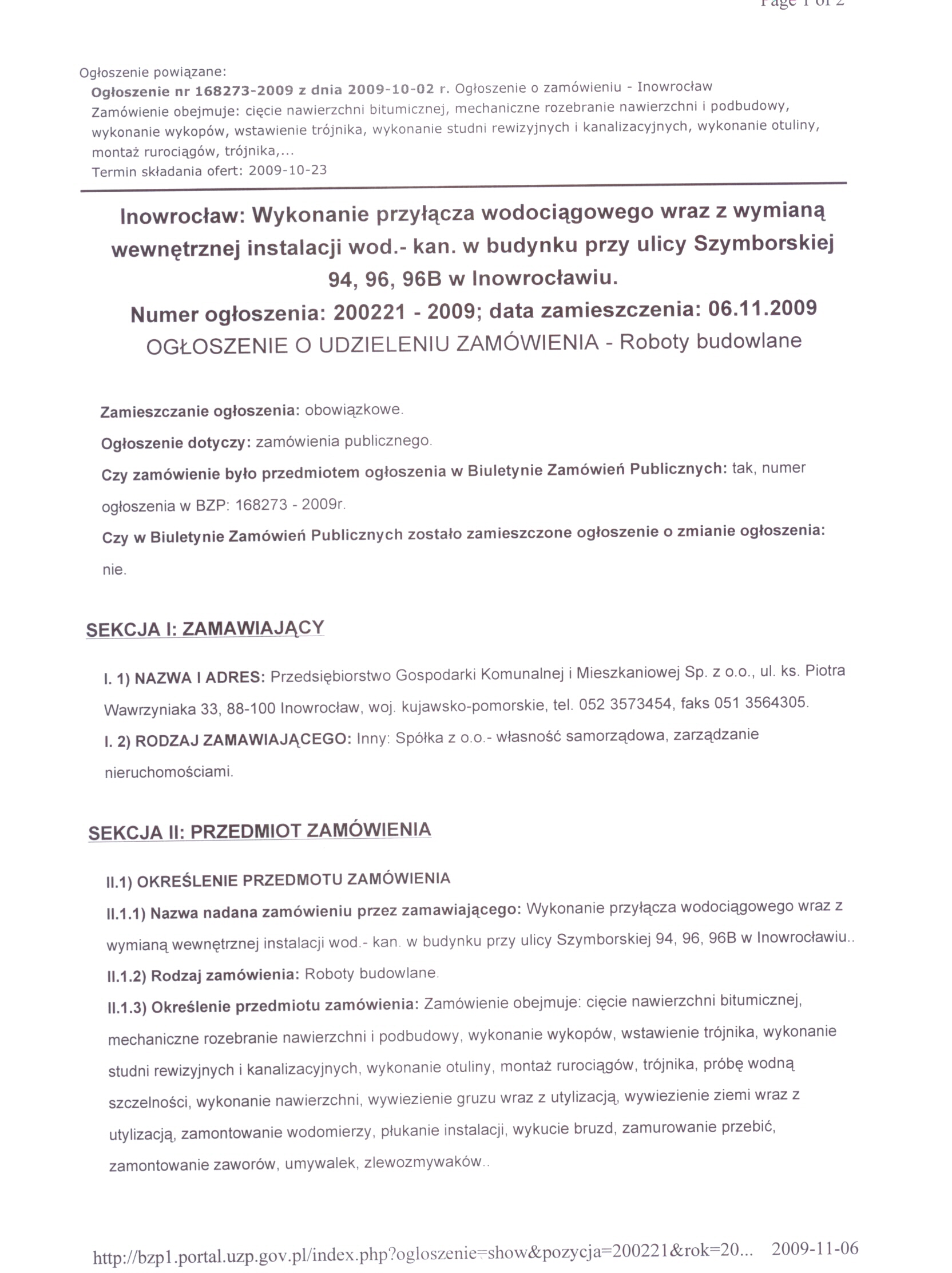 Numer og艂oszenia w BZP: 168273 - 2009; data zamieszczenia 02/10/2009 r. 聽