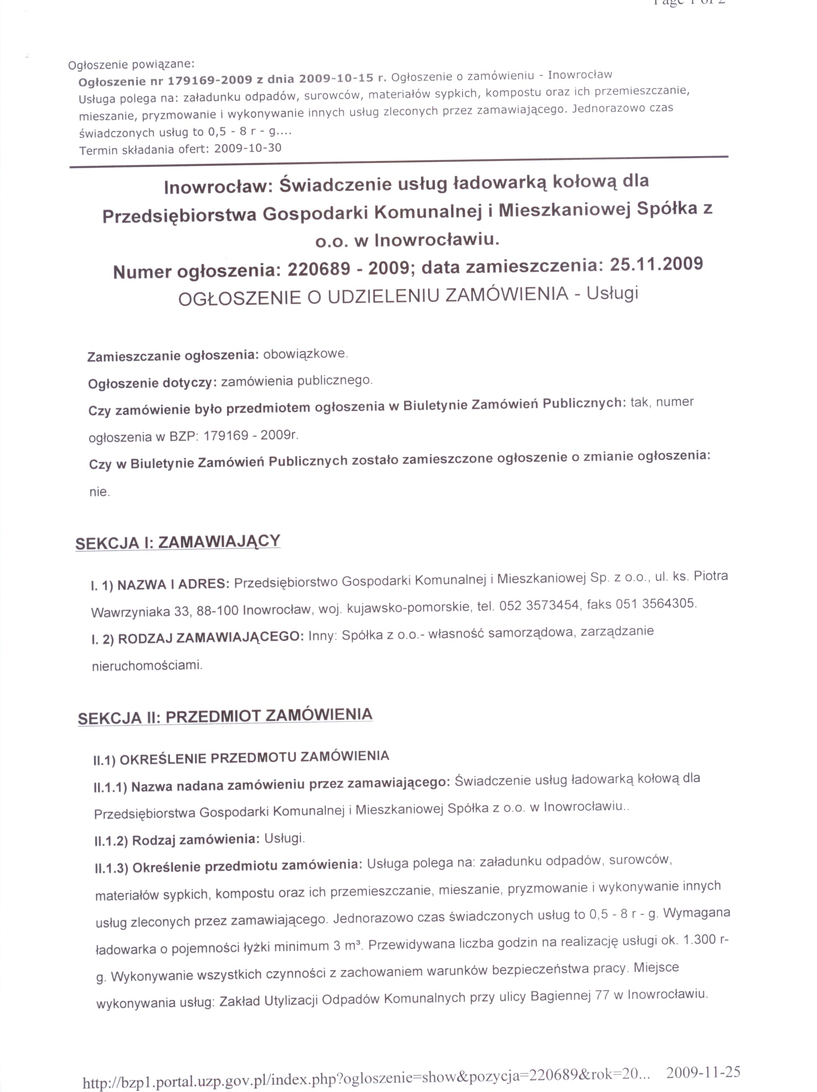 Nazwa nadana zam贸wieniu: "艢wiadczenie us艂ug 艂adowark膮 ko艂ow膮 dla Przedsi臋biorstwa Gospodarki Komunalnej i Mieszkaniowej Sp贸艂ka z o.o. w Inowroc艂awiu". 聽