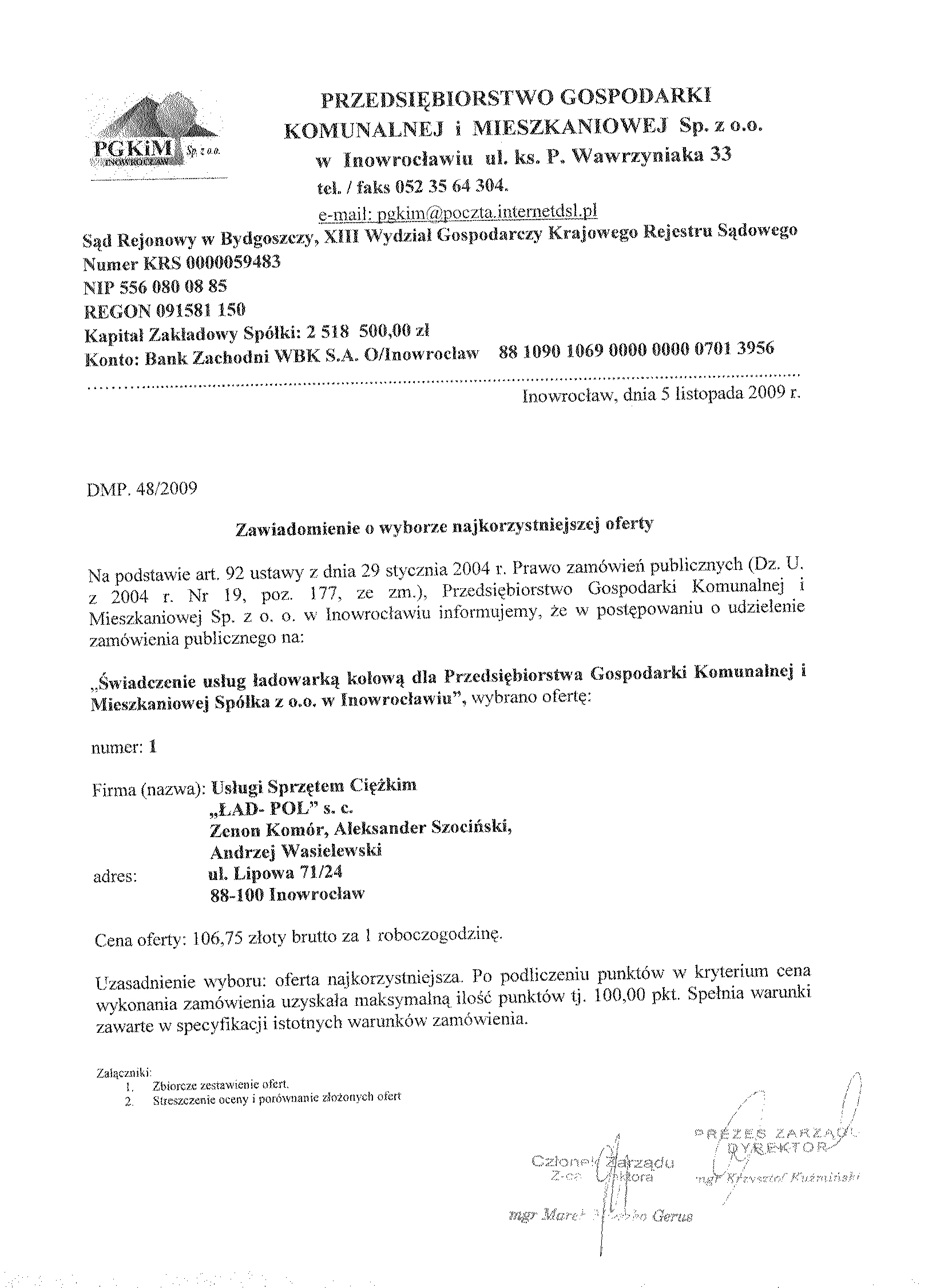 Numer sprawy: DMP. 48/2009聽聽聽聽聽聽聽聽聽聽聽聽聽聽聽聽聽聽聽聽聽聽Inowroc艂aw, dnia 15 pa藕dziernika 2009 r.聽聽 聽