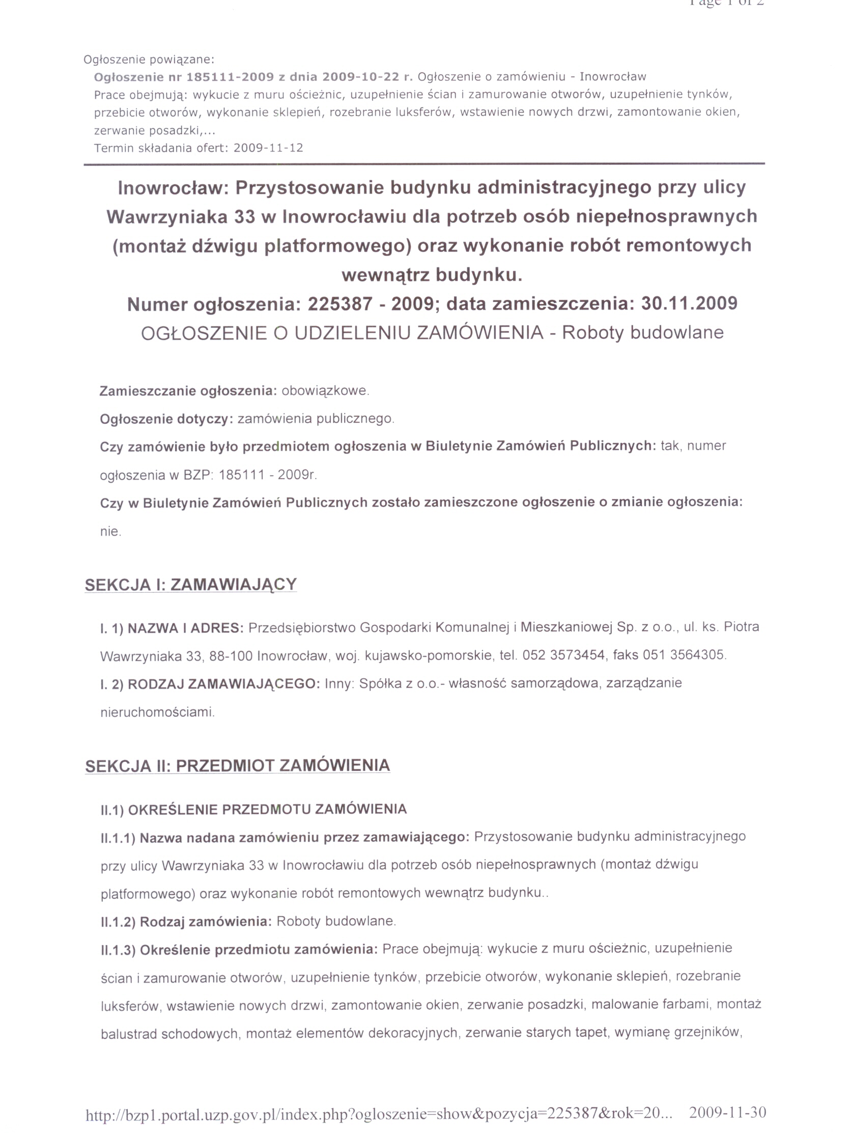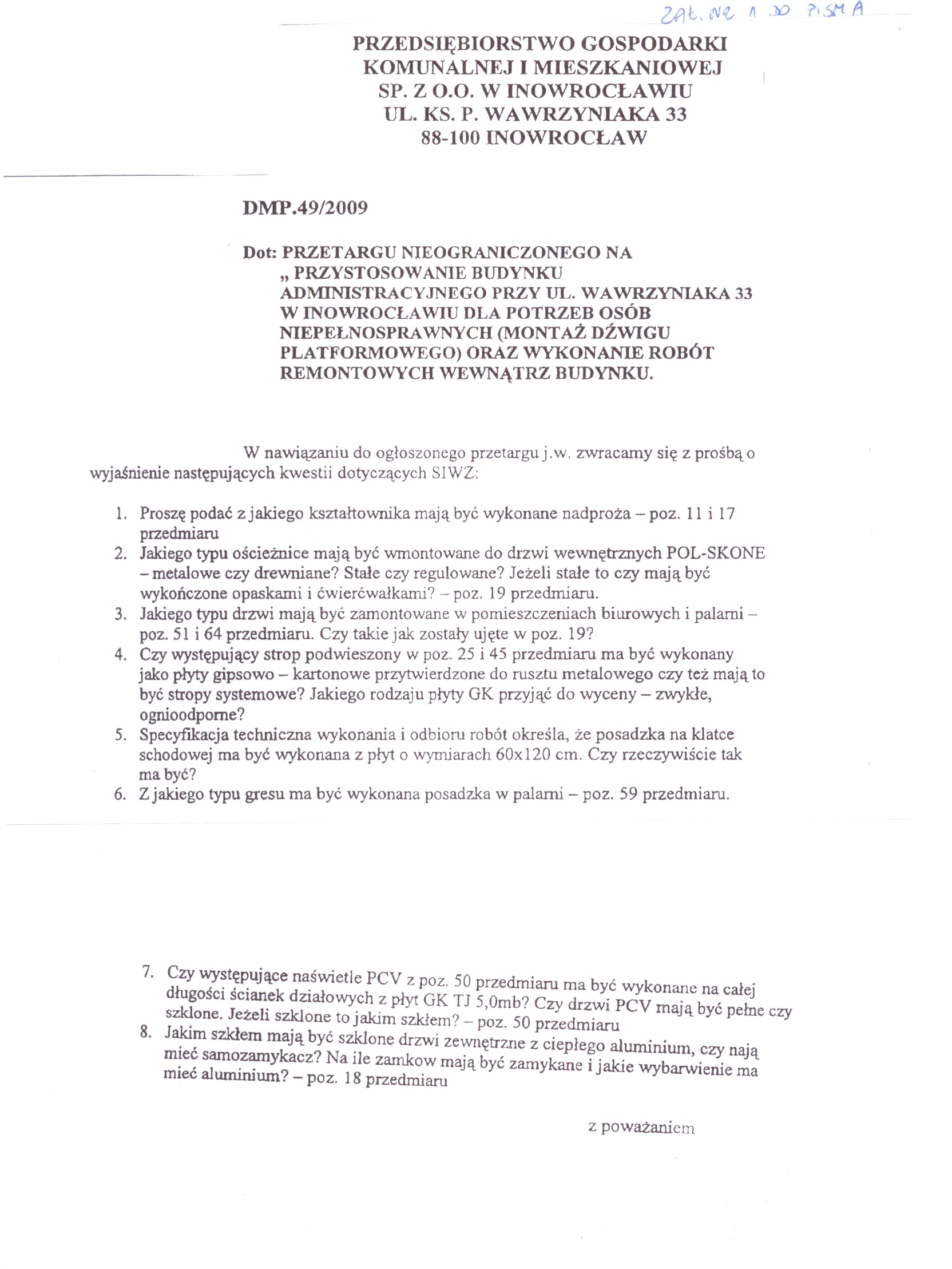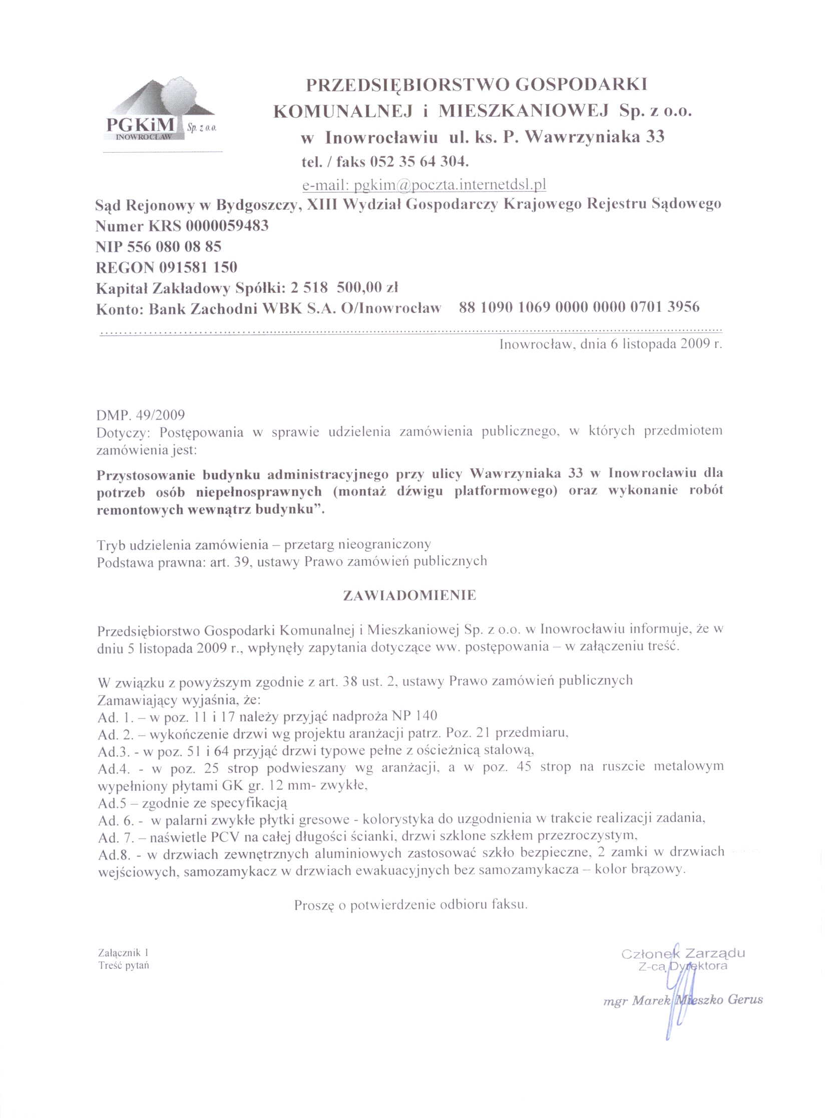 Numer sprawy: DMP. 49/2009聽聽聽聽聽聽聽聽聽聽聽聽聽聽聽聽聽聽聽聽聽聽聽 Inowroc艂aw, dnia 22 pa藕dziernika 2009 r.聽聽 聽OG艁OSZENIE O WSZCZ臉CIU POST臉POWANIA 聽 Numer og艂oszenia w BZP: 185111- 2009; 聽 data zamieszczenia 22/10/2009 r. Zamieszczenie obowi膮zkowe 聽 Zam贸wienia publiczne 1. Zamawiaj膮cy:聽Przedsi臋biorstwo Gospodarki Komunalnej i Mieszkaniowej Sp. z o.o. w Inowroc艂awiu Adres pocztowy: Ulica: ks. Piotra Wawrzyniaka 33 Kod: 88-100, Miejscowo艣膰: Inowroc艂aw Telefon / faks 052 35 64聽304 Adres strony internetowej: www.pgkimino.pl e-mail: pgkim@poczta.internetdsl.pl聽 Adres strony internetowej, na kt贸rej dost臋pna jest specyfikacja istotnych warunk贸w zam贸wienia: http://pgkim-inowroclaw.samorzady.pl Rodzaj zamawiaj膮cego: Sp贸艂ka z o. o. - w艂asno艣膰 samorz膮dowa, zarz膮dzanie nieruchomo艣ciami 1.1. Osobami uprawnionymi do kontakt贸w z Wykonawcami s膮: a) w cz臋艣ci formalnej zam贸wienia - Krystyna Glonek, tel./ faks 052 35 64 304, b) w cz臋艣ci merytorycznej zam贸wienia - Anna Nawrocka, Mariusz Minta, tel. 052聽35 64聽325. 1.2. Op艂ata za otrzymanie specyfikacji istotnych warunk贸w zam贸wienia b臋dzie pokrywa膰 jedynie koszty jej druku oraz przekazania. 1.3. Wykonawca zainteresowany post臋powaniem powinien z艂o偶y膰 wniosek u zamawiaj膮cego z podaniem wszystkich danych firmy - niezb臋dnych do przekazywania zmian i zapyta艅 dotycz膮cych powy偶szego post臋powania. 2. Nazwa nadana zam贸wieniu: "Przystosowanie budynku administracyjnego przy ulicy Wawrzyniaka 33 w Inowroc艂awiu dla potrzeb os贸b niepe艂nosprawnych (monta偶 d藕wigu platformowego) oraz wykonanie rob贸t remontowych wewn膮trz budynku". Rodzaj zam贸wienia: robota budowlana 2.1. Prace obejmuj膮: wykucie z muru o艣cie偶nic, uzupe艂nienie 艣cian i zamurowanie otwor贸w, uzupe艂nienie tynk贸w, przebicie otwor贸w, wykonanie sklepie艅, rozebranie luksfer贸w, wstawienie nowych drzwi, zamontowanie okien, zerwanie posadzki, malowanie farbami, monta偶 balustrad schodowych, monta偶 element贸w dekoracyjnych, zerwanie starych tapet, wymian臋 grzejnik贸w, wykonanie fundament贸w, wymurowanie 艣cian, monta偶 d藕wigu platformowego, demonta偶 i monta偶 puszek, 艂膮cznik贸w instalacyjnych, gniazd wtyczkowych, tablic bezpiecznikowych, opraw, pomiar rezystancji, sprawdzenie zasilania. Renowacja holu - wg projektu aran偶acji (do wgl膮du u Zamawiaj膮cego lub do przes艂ania zainteresowanym drog膮 elektroniczn膮). 2.2.Wsp贸lny S艂ownik Zam贸wie艅 (CPV):聽45.21.00.00 - 2, 45.41.00.00 - 4, 45.44.21.00 - 8, 45.43.00.00 -0, 45.31.00.00 - 3. Nie dopuszcza si臋 sk艂adania ofert cz臋艣ciowych. Nie dopuszcza si臋 sk艂adania ofert wariantowych. Zamawiaj膮cy nie przewiduje zawarcia umowy ramowej, jak r贸wnie偶 nie dokona wyboru oferty najkorzystniejszej z zastosowaniem aukcji elektronicznej. Zamawiaj膮cy nie przewiduje mo偶liwo艣ci ustanowienia dynamicznego systemu zakup贸w. 2.3. Termin (okres) realizacji zam贸wienia: 15 luty 2010 r. 3. O udzielenie zam贸wienia mog膮 ubiega膰 si臋 wy艂膮cznie Wykonawcy, kt贸rzy: a) posiadaj膮 uprawnienia do wykonywania okre艣lonej dzia艂alno艣ci lub czynno艣ci, je偶eli ustawy nak艂adaj膮 obowi膮zek posiadania takich uprawnie艅, b) posiadaj膮 niezb臋dn膮 wiedz臋 i do艣wiadczenie oraz dysponuj膮 potencja艂em techniczny i osobami zdolnymi do wykonania zam贸wienia lub przedstawi膮 pisemne zobowi膮zanie innych podmiot贸w do udost臋pnienia potencja艂u technicznego i os贸b zdolnych do wykonania zam贸wienia, c) znajduj膮 si臋 w sytuacji ekonomicznej i finansowej zapewniaj膮cej wykonanie zam贸wienia, d) nie podlegaj膮 wykluczeniu z post臋powania o udzielenie zam贸wienia. Zamawiaj膮cy oceni spe艂nienie warunk贸w wymienionych w niniejszym rozdziale na podstawie z艂o偶onych przez Wykonawc臋 do oferty, o艣wiadcze艅 i dokument贸w. Ocena spe艂niania warunk贸w dokonana zostanie na zasadzie:聽聽聽聽聽聽聽聽聽聽聽聽聽聽聽聽聽聽聽聽聽聽聽聽聽聽聽聽聽聽聽聽聽聽聽聽聽聽聽聽聽聽聽聽聽 spe艂nia/ nie spe艂nia 4. W celu potwierdzenia, 偶e Wykonawca posiada uprawnienie do wykonywania okre艣lonej dzia艂alno艣ci lub czynno艣ci oraz nie podlega wykluczeniu na podstawie art. 24 ustawy z dnia 29 stycznia 2004 r. - Prawo zam贸wie艅 publicznych, zamawiaj膮cy 偶膮da, nast臋puj膮cych dokument贸w: a) aktualnego odpisu z w艂a艣ciwego rejestru albo aktualnego za艣wiadczenia o wpisie do ewidencji dzia艂alno艣ci gospodarczej, je偶eli odr臋bne przepisy wymagaj膮 wpisu do rejestru lub zg艂oszenia do ewidencji dzia艂alno艣ci gospodarczej, wystawionego nie wcze艣niej ni偶 6 miesi臋cy przed up艂ywem terminu sk艂adania ofert; b) o艣wiadczenie wykonawcy, 偶e nie posiada zaleg艂o艣ci podatkowej wobec Naczelnika Urz臋du Skarbowego, c) o艣wiadczenie wykonawcy, 偶e nie posiada zaleg艂o艣ci wobec Zak艂adu Ubezpiecze艅 Spo艂ecznych w op艂acaniu sk艂adek na ubezpieczenie spo艂eczne, zdrowotne oraz Fundusz Pracy. 4.1.W celu potwierdzenia posiadania przez wykonawc臋 niezb臋dnej wiedzy i do艣wiadczenia oraz os贸b zdolnych do wykonania zam贸wienia, zamawiaj膮cy 偶膮da nast臋puj膮cych dokument贸w: a)聽wykazu wykonanych rob贸t budowlanych w okresie ostatniego 1 roku, przed dniem wszcz臋cia post臋powania o udzielenie zam贸wienia, z podaniem ich warto艣ci oraz daty i miejsca wykonania oraz za艂膮czeniem dokument贸w potwierdzaj膮cych, 偶e roboty te zosta艂y wykonane nale偶ycie, z艂. nr 2 do siwz (minimum 2 referencje),a) zamawiaj膮cy 偶膮da za艂膮czenia kserokopii uprawnie艅 budowlanych w specjalno艣ciach obj臋tych przedmiotem zam贸wienia, w zakresie rob贸t og贸lnobudowlanych i instalacji elektrycznych,b) 艣wiadectwa kwalifikacyjnego E - eksp instalacji elektrycznej do 1 kV, c) aktualnego wpisu do w艂a艣ciwych Izb Zawodowych. 4.2. W celu potwierdzenia, 偶