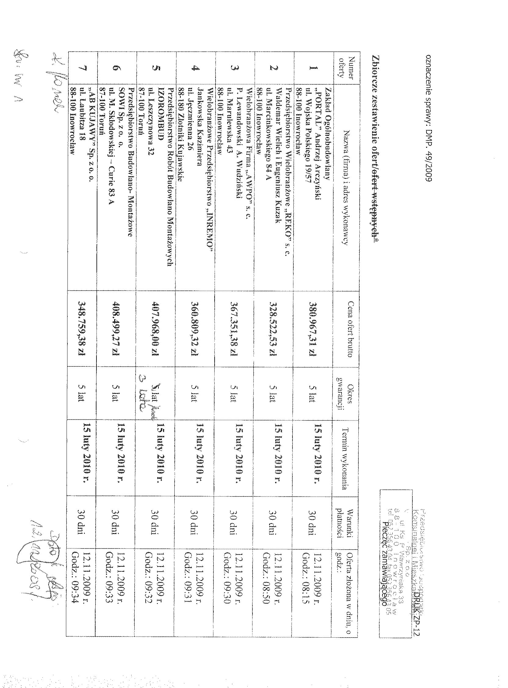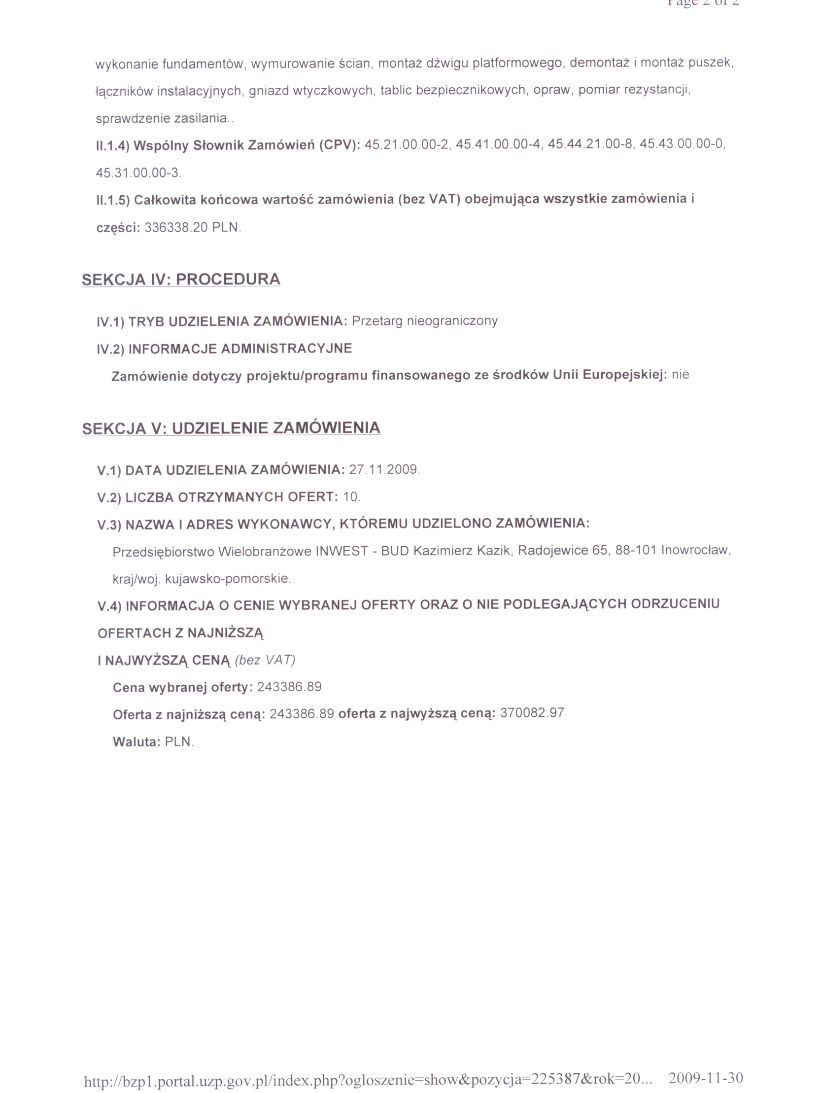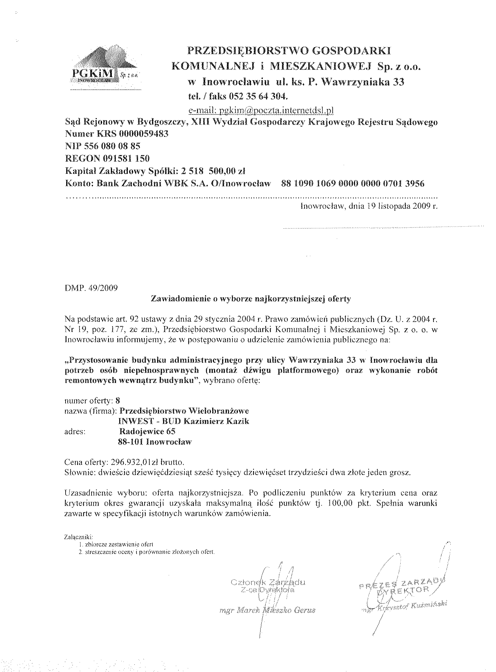Numer sprawy: DMP. 49/2009聽聽聽聽聽聽聽聽聽聽聽聽聽聽聽聽聽聽聽聽聽聽聽 Inowroc艂aw, dnia 22 pa藕dziernika 2009 r.聽聽 聽OG艁OSZENIE O WSZCZ臉CIU POST臉POWANIA 聽 Numer og艂oszenia w BZP: 185111- 2009; 聽 data zamieszczenia 22/10/2009 r. Zamieszczenie obowi膮zkowe 聽 Zam贸wienia publiczne 1. Zamawiaj膮cy:聽Przedsi臋biorstwo Gospodarki Komunalnej i Mieszkaniowej Sp. z o.o. w Inowroc艂awiu Adres pocztowy: Ulica: ks. Piotra Wawrzyniaka 33 Kod: 88-100, Miejscowo艣膰: Inowroc艂aw Telefon / faks 052 35 64聽304 Adres strony internetowej: www.pgkimino.pl e-mail: pgkim@poczta.internetdsl.pl聽 Adres strony internetowej, na kt贸rej dost臋pna jest specyfikacja istotnych warunk贸w zam贸wienia: http://pgkim-inowroclaw.samorzady.pl Rodzaj zamawiaj膮cego: Sp贸艂ka z o. o. - w艂asno艣膰 samorz膮dowa, zarz膮dzanie nieruchomo艣ciami 1.1. Osobami uprawnionymi do kontakt贸w z Wykonawcami s膮: a) w cz臋艣ci formalnej zam贸wienia - Krystyna Glonek, tel./ faks 052 35 64 304, b) w cz臋艣ci merytorycznej zam贸wienia - Anna Nawrocka, Mariusz Minta, tel. 052聽35 64聽325. 1.2. Op艂ata za otrzymanie specyfikacji istotnych warunk贸w zam贸wienia b臋dzie pokrywa膰 jedynie koszty jej druku oraz przekazania. 1.3. Wykonawca zainteresowany post臋powaniem powinien z艂o偶y膰 wniosek u zamawiaj膮cego z podaniem wszystkich danych firmy - niezb臋dnych do przekazywania zmian i zapyta艅 dotycz膮cych powy偶szego post臋powania. 2. Nazwa nadana zam贸wieniu: "Przystosowanie budynku administracyjnego przy ulicy Wawrzyniaka 33 w Inowroc艂awiu dla potrzeb os贸b niepe艂nosprawnych (monta偶 d藕wigu platformowego) oraz wykonanie rob贸t remontowych wewn膮trz budynku". Rodzaj zam贸wienia: robota budowlana 2.1. Prace obejmuj膮: wykucie z muru o艣cie偶nic, uzupe艂nienie 艣cian i zamurowanie otwor贸w, uzupe艂nienie tynk贸w, przebicie otwor贸w, wykonanie sklepie艅, rozebranie luksfer贸w, wstawienie nowych drzwi, zamontowanie okien, zerwanie posadzki, malowanie farbami, monta偶 balustrad schodowych, monta偶 element贸w dekoracyjnych, zerwanie starych tapet, wymian臋 grzejnik贸w, wykonanie fundament贸w, wymurowanie 艣cian, monta偶 d藕wigu platformowego, demonta偶 i monta偶 puszek, 艂膮cznik贸w instalacyjnych, gniazd wtyczkowych, tablic bezpiecznikowych, opraw, pomiar rezystancji, sprawdzenie zasilania. Renowacja holu - wg projektu aran偶acji (do wgl膮du u Zamawiaj膮cego lub do przes艂ania zainteresowanym drog膮 elektroniczn膮). 2.2.Wsp贸lny S艂ownik Zam贸wie艅 (CPV):聽45.21.00.00 - 2, 45.41.00.00 - 4, 45.44.21.00 - 8, 45.43.00.00 -0, 45.31.00.00 - 3. Nie dopuszcza si臋 sk艂adania ofert cz臋艣ciowych. Nie dopuszcza si臋 sk艂adania ofert wariantowych. Zamawiaj膮cy nie przewiduje zawarcia umowy ramowej, jak r贸wnie偶 nie dokona wyboru oferty najkorzystniejszej z zastosowaniem aukcji elektronicznej. Zamawiaj膮cy nie przewiduje mo偶liwo艣ci ustanowienia dynamicznego systemu zakup贸w. 2.3. Termin (okres) realizacji zam贸wienia: 15 luty 2010 r. 3. O udzielenie zam贸wienia mog膮 ubiega膰 si臋 wy艂膮cznie Wykonawcy, kt贸rzy: a) posiadaj膮 uprawnienia do wykonywania okre艣lonej dzia艂alno艣ci lub czynno艣ci, je偶eli ustawy nak艂adaj膮 obowi膮zek posiadania takich uprawnie艅, b) posiadaj膮 niezb臋dn膮 wiedz臋 i do艣wiadczenie oraz dysponuj膮 potencja艂em techniczny i osobami zdolnymi do wykonania zam贸wienia lub przedstawi膮 pisemne zobowi膮zanie innych podmiot贸w do udost臋pnienia potencja艂u technicznego i os贸b zdolnych do wykonania zam贸wienia, c) znajduj膮 si臋 w sytuacji ekonomicznej i finansowej zapewniaj膮cej wykonanie zam贸wienia, d) nie podlegaj膮 wykluczeniu z post臋powania o udzielenie zam贸wienia. Zamawiaj膮cy oceni spe艂nienie warunk贸w wymienionych w niniejszym rozdziale na podstawie z艂o偶onych przez Wykonawc臋 do oferty, o艣wiadcze艅 i dokument贸w. Ocena spe艂niania warunk贸w dokonana zostanie na zasadzie:聽聽聽聽聽聽聽聽聽聽聽聽聽聽聽聽聽聽聽聽聽聽聽聽聽聽聽聽聽聽聽聽聽聽聽聽聽聽聽聽聽聽聽聽聽 spe艂nia/ nie spe艂nia 4. W celu potwierdzenia, 偶e Wykonawca posiada uprawnienie do wykonywania okre艣lonej dzia艂alno艣ci lub czynno艣ci oraz nie podlega wykluczeniu na podstawie art. 24 ustawy z dnia 29 stycznia 2004 r. - Prawo zam贸wie艅 publicznych, zamawiaj膮cy 偶膮da, nast臋puj膮cych dokument贸w: a) aktualnego odpisu z w艂a艣ciwego rejestru albo aktualnego za艣wiadczenia o wpisie do ewidencji dzia艂alno艣ci gospodarczej, je偶eli odr臋bne przepisy wymagaj膮 wpisu do rejestru lub zg艂oszenia do ewidencji dzia艂alno艣ci gospodarczej, wystawionego nie wcze艣niej ni偶 6 miesi臋cy przed up艂ywem terminu sk艂adania ofert; b) o艣wiadczenie wykonawcy, 偶e nie posiada zaleg艂o艣ci podatkowej wobec Naczelnika Urz臋du Skarbowego, c) o艣wiadczenie wykonawcy, 偶e nie posiada zaleg艂o艣ci wobec Zak艂adu Ubezpiecze艅 Spo艂ecznych w op艂acaniu sk艂adek na ubezpieczenie spo艂eczne, zdrowotne oraz Fundusz Pracy. 4.1.W celu potwierdzenia posiadania przez wykonawc臋 niezb臋dnej wiedzy i do艣wiadczenia oraz os贸b zdolnych do wykonania zam贸wienia, zamawiaj膮cy 偶膮da nast臋puj膮cych dokument贸w: a)聽wykazu wykonanych rob贸t budowlanych w okresie ostatniego 1 roku, przed dniem wszcz臋cia post臋powania o udzielenie zam贸wienia, z podaniem ich warto艣ci oraz daty i miejsca wykonania oraz za艂膮czeniem dokument贸w potwierdzaj膮cych, 偶e roboty te zosta艂y wykonane nale偶ycie, z艂. nr 2 do siwz (minimum 2 referencje),a) zamawiaj膮cy 偶膮da za艂膮czenia kserokopii uprawnie艅 budowlanych w specjalno艣ciach obj臋tych przedmiotem zam贸wienia, w zakresie rob贸t og贸lnobudowlanych i instalacji elektrycznych,b) 艣wiadectwa kwalifikacyjnego E - eksp instalacji elektrycznej do 1 kV, c) aktualnego wpisu do w艂a艣ciwych Izb Zawodowych. 4.2. W celu potwierdzenia, 偶