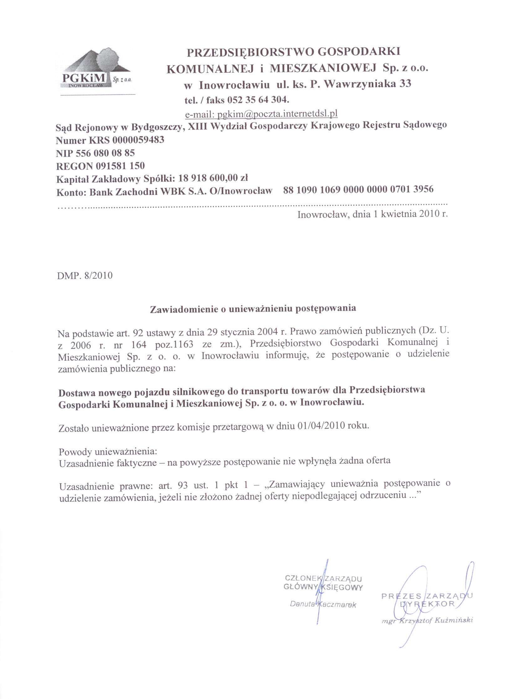 II.1.3) Okre艣lenie przedmiotu oraz wielko艣ci lub zakresu zam贸wienia: Przedmiotem zam贸wienia jest dostawa fabrycznie nowego pojazdu silnikowego przeznaczonego do transportu towar贸w. Rok produkcji 2010. Minimalne wymagania to: kabina kr贸tka 3 miejscowa (wraz z kierowc膮), moc silnika do 110 KM, silnik diesel 4 cylindrowy, emisja spalin Euro 4, skrzynia 5 biegowa zsynchronizowana 1 bieg wsteczny, rozstaw osi do 2600 mm, regulowana kierownica, uk艂ad hamulcowy hydrauliczny, skrzynia 艂adunkowa z mo偶liwo艣ci膮 wywrotu tr贸jstronnego, burty boczne aluminiowe, konstrukcja skrzyni 艂adunkowej ocynkowana i dwukrotnie malowana. Minimalne wymagania gwarancyjnego: 1 rok na ca艂y pojazd, 1 rok na napraw臋 awarii, 2 lata na elementy uk艂adu nap臋dowego (mechanika), 1 rok na zabudow臋. Dostarczony pojazd musi spe艂nia膰 warunki dopuszczenia do ruchu drogowego zgodnie z ustaw膮 Prawo o ruchu drogowym (Dz. U. z dnia 19 sierpnia 1997 r. z p贸藕n. zm.) oraz szczeg贸lowe warunki opisane w specyfikacji istotnych warunk贸w zam贸wienia. Dostawca zobowi膮zuje si臋 dostarczy膰 przedmiot umowy zgodnie z wymaganiami posiadanego 艣wiadectwa homologacji dla pojazd贸w skompletowanych upowa偶niaj膮cego poruszanie si臋 po drogach publicznych kraju. Wymagane warunki techniczne, organizacyjne wykonania zam贸wienia: a) wykaz najbli偶szych punkt贸w serwisowych z godzinami pracy serwisu i magazynu, b) gwarantowany czas naprawy od momentu zg艂oszenia awarii- max do 5 dni, c) zapewnienie serwisu pogwarancyjnego, d) dostawa b臋dzie realizowana do obiektu zamawiaj膮cego mieszcz膮cego si臋 przy ulicy bagiennej 77 w Inowroc艂awiu - Zak艂ad Utylizacji Odpad贸w Komunalnych, e) warunki finansowania zam贸wienia: na podstawie umowy leasingowej. f) p艂atno艣膰 nast膮pi przelewem (po protokole zdawczo odbiorczym), na konto wybranego dostawcy w terminie 30 dni.. II.1.4) Czy przewiduje si臋 udzielenie zam贸wie艅 uzupe艂niaj膮cych: nie. II.1.5) Wsp贸lny S艂ownik Zam贸wie艅 (CPV): 34.13.00.00-7. II.1.6) Czy dopuszcza si臋 z艂o偶enie oferty cz臋艣ciowej: nie. II.1.7) Czy dopuszcza si臋 z艂o偶enie oferty wariantowej: nie. II.2) CZAS TRWANIA ZAM脫WIENIA LUB TERMIN WYKONANIA: Okres w miesi膮cach: 3. SEKCJA III: INFORMACJE O CHARAKTERZE PRAWNYM, EKONOMICZNYM, FINANSOWYM I TECHNICZNYM III.1) WADIUM Informacja na temat wadium: Zamawiaj膮cy nie wymaga wadium. III.2) ZALICZKI Czy przewiduje si臋 udzielenie zaliczek na poczet wykonania zam贸wienia: nie III.3) WARUNKI UDZIA艁U W POST臉POWANIU ORAZ OPIS SPOSOBU DOKONYWANIA OCENY SPE艁NIANIA TYCH WARUNK脫W III.3.2) Wiedza i do艣wiadczenie Opis sposobu dokonywania oceny spe艂niania tego warunku Warunek ten b臋dzie spe艂niony przez Wykonawc臋, je偶eli za艂膮czy do oferty wykaz potwierdzaj膮cy, 偶e zrealizowa艂 minimum 2 dostawy pojazdu o warto艣ci 60.000,00 z艂 netto ka偶da, plus 2 referencje. Ocena spe艂niania warunku udzia艂u w post臋powaniu odbywa膰 si臋 b臋dzie na podstawie dokument贸w i o艣wiadcze艅 przed艂o偶onych przez wykonawc臋 na zasadzie spe艂nia/ nie spe艂nia - za艂膮cznik nr 4 do siwz. III.4) INFORMACJA O O艢WIADCZENIACH LUB DOKUMENTACH, JAKIE MAJ膭 DOSTARCZY膯 WYKONAWCY W CELU POTWIERDZENIA SPE艁NIANIA WARUNK脫W UDZIA艁U W POST臉POWANIU ORAZ NIEPODLEGANIA WYKLUCZENIU NA PODSTAWIE ART. 24 UST. 1 USTAWY III.4.1) W zakresie wykazania spe艂niania przez wykonawc臋 warunk贸w, o kt贸rych mowa w art. 22 ust. 1 ustawy, opr贸cz o艣wiadczenia o spe艂nieniu warunk贸w udzia艂u w post臋powaniu, nale偶y przed艂o偶y膰: III.4.2) W zakresie potwierdzenia niepodlegania wykluczeniu na podstawie art. 24 ust. 1 ustawy, nale偶y przed艂o偶y膰: a) o艣wiadczenie o braku podstaw do wykluczenia b) aktualny odpis z w艂a艣ciwego rejestru, je偶eli odr臋bne przepisy wymagaj膮 wpisu do rejestru, w celu wykazania braku podstaw do wykluczenia w oparciu o art. 24 ust. 1 pkt 2 ustawy, wystawiony nie wcze艣niej ni偶 6 miesi臋cy przed up艂ywem terminu sk艂adania wniosk贸w o dopuszczenie do udzia艂u w post臋powaniu o udzielenie zam贸wienia albo sk艂adania ofert, a w stosunku do os贸b fizycznych o艣wiadczenie w zakresie art. 24 ust. 1 pkt 2 ustawy III.4.3) Dokumenty podmiot贸w zagranicznych Je偶eli wykonawca ma siedzib臋 lub miejsce zamieszkania poza terytorium Rzeczypospolitej Polskiej, przedk艂ada: III.4.3.1) dokument wystawiony w kraju, w kt贸rym ma siedzib臋 lub miejsce zamieszkania potwierdzaj膮cy, 偶e: a) nie otwarto jego likwidacji ani nie og艂oszono upad艂o艣ci - wystawiony nie wcze艣niej ni偶 6 miesi臋cy przed up艂ywem terminu sk艂adania wniosk贸w o dopuszczenie do udzia艂u w post臋powaniu o udzielenie zam贸wienia albo sk艂adania ofert b) nie orzeczono wobec niego zakazu ubiegania si臋 o zam贸wienie - wystawiony nie wcze艣niej ni偶 6 miesi臋cy przed up艂ywem terminu sk艂adania wniosk贸w o dopuszczenie do udzia艂u w post臋powaniu o udzielenie zam贸wienia albo sk艂adania ofert III.6) INNE DOKUMENTY Inne dokumenty niewymienione w pkt III.4) albo w pkt III.5) a) Formularz ofertowy - za艂膮cznik nr 1 do siwz, b) o艣wiadczenie o spe艂nianiu warunk贸w udzia艂u post臋powaniu zgodnie z art. 22, ustawy Prawo zam贸wie艅 publicznych - za艂膮cznik nr 2 do siwz, c) o艣wiadczenie o braku podstaw do wykluczenia zgodnie z art. 24, ustawy Prawo zam贸wie艅 publicznych - za艂膮cznik nr 3 do siwz, d) wykaz zrealizowanych dostaw - za艂膮cznik nr 4 do siwz, e) szczeg贸艂ow膮 charakterystyk臋 oferowanego pojazdu zgodnie z opisem umieszczonym w rozdziale III siwz. III.7) Czy ogranicza si臋 mo偶liwo艣膰 ubiegania si臋 o zam贸wienie publiczne tylko dla wykonawc贸w, u kt贸rych ponad 50 % pracownik贸w stanowi膮 osoby niepe艂nosprawne: nie SEKCJA IV: PROCEDURA