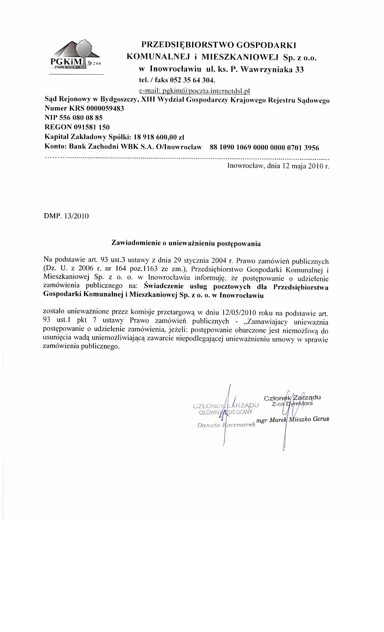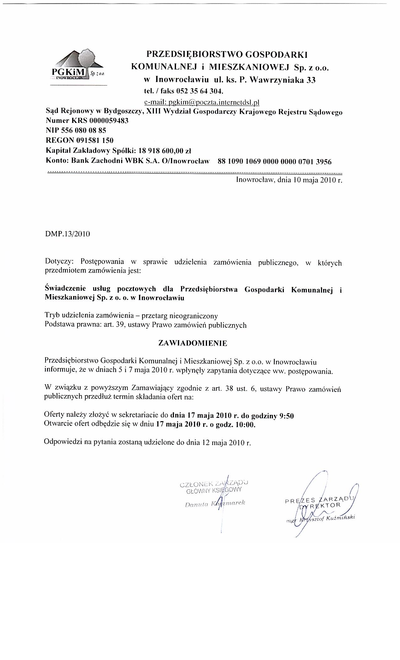 Inowroc艂aw: 艢wiadczenie us艂ug pocztowych dla Przedsi臋biorstwa Gospodarki Komunalnej i Mieszkaniowej Sp. z o. o. w Inowroc艂awiu Numer og艂oszenia: 100617 - 2010; data zamieszczenia: 28.04.2010