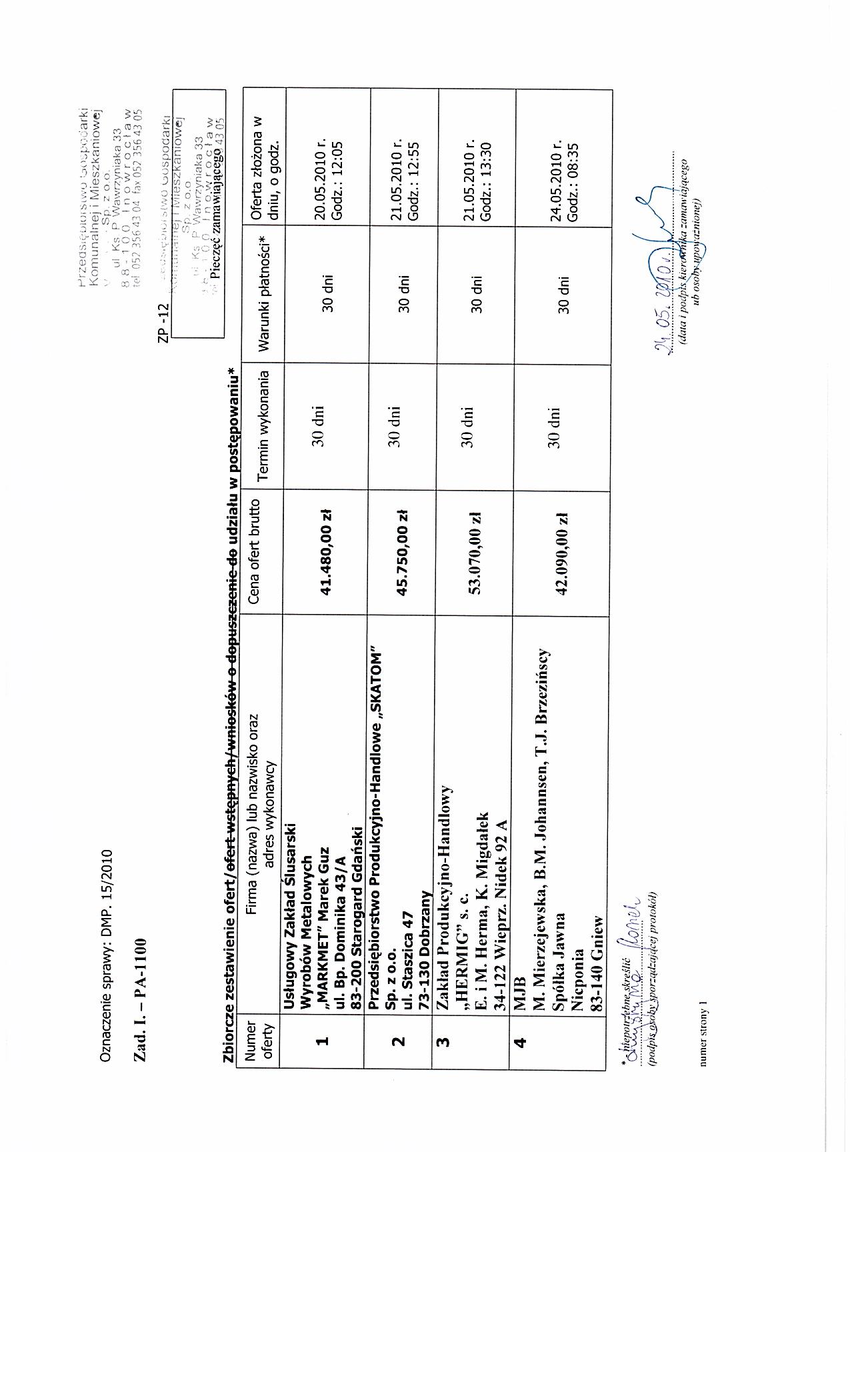 IV.4.4) Termin sk艂adania wniosk贸w o dopuszczenie do udzia艂u w post臋powaniu lub ofert: 24.05.2010 godzina 09:50, miejsce: Przedsi臋biorstwo Gospodarki Komunalnej i Mieszkaniowej sp. z o. o., ul. ks. Piotra Wawrzyniak 33, 88-100 Inowroc艂aw, sekretariat 1 pi臋tro.. IV.4.5) Termin zwi膮zania ofert膮: okres w dniach: 30 (od ostatecznego terminu sk艂adania ofert). IV.4.17) Czy przewiduje si臋 uniewa偶nienie post臋powania o udzielenie zam贸wienia, w przypadku nieprzyznania 艣rodk贸w pochodz膮cych z bud偶etu Unii Europejskiej oraz niepodlegaj膮cych zwrotowi 艣rodk贸w z pomocy udzielonej przez pa艅stwa cz艂onkowskie Europejskiego Porozumienia o Wolnym Handlu (EFTA), kt贸re mia艂y by膰 przeznaczone na sfinansowanie ca艂o艣ci lub cz臋艣ci zam贸wienia: nie ZA艁膭CZNIK I - INFORMACJE DOTYCZ膭CE OFERT CZ臉艢CIOWYCH CZ臉艢膯 Nr: 1 NAZWA: Zad. I. - PA 1100. 1) Kr贸tki opis ze wskazaniem wielko艣ci lub zakresu zam贸wienia: Zakres zam贸wienia - 50 szt. 2) Wsp贸lny S艂ownik Zam贸wie艅 (CPV): 34.92.84.80-6. 3) Czas trwania lub termin wykonania: Okres w dniach: 30. 4) Kryteria oceny ofert: najni偶sza cena.