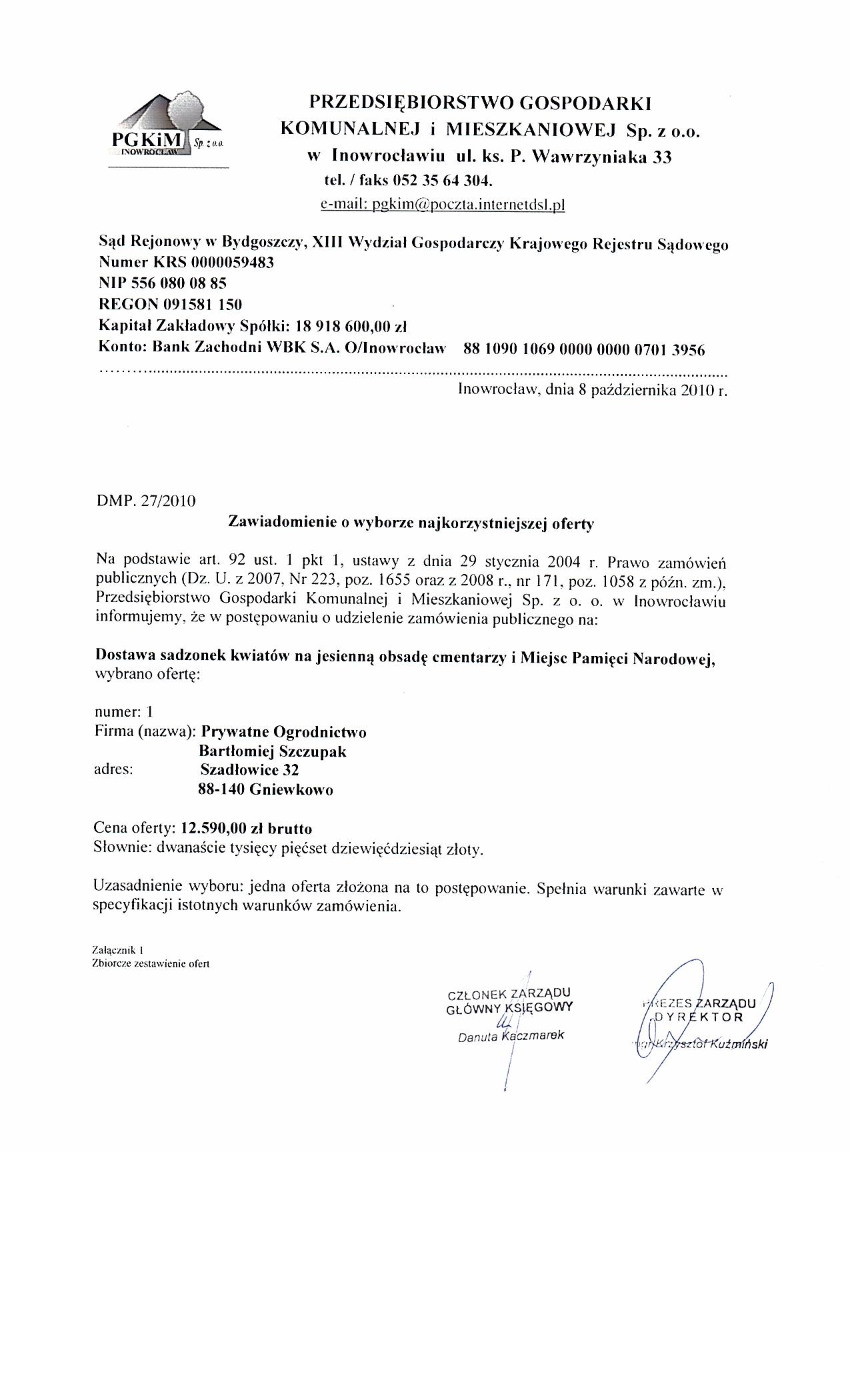 I. 1) NAZWA I ADRES: Przedsi臋biorstwo Gospodarki Komunalnej i Mieszkaniowej Sp. z o.o. , ul. ks. Piotra Wawrzyniaka 33, 88-100 Inowroc艂aw, woj. kujawsko-pomorskie, tel. 052 3573454, faks 051 3564305.