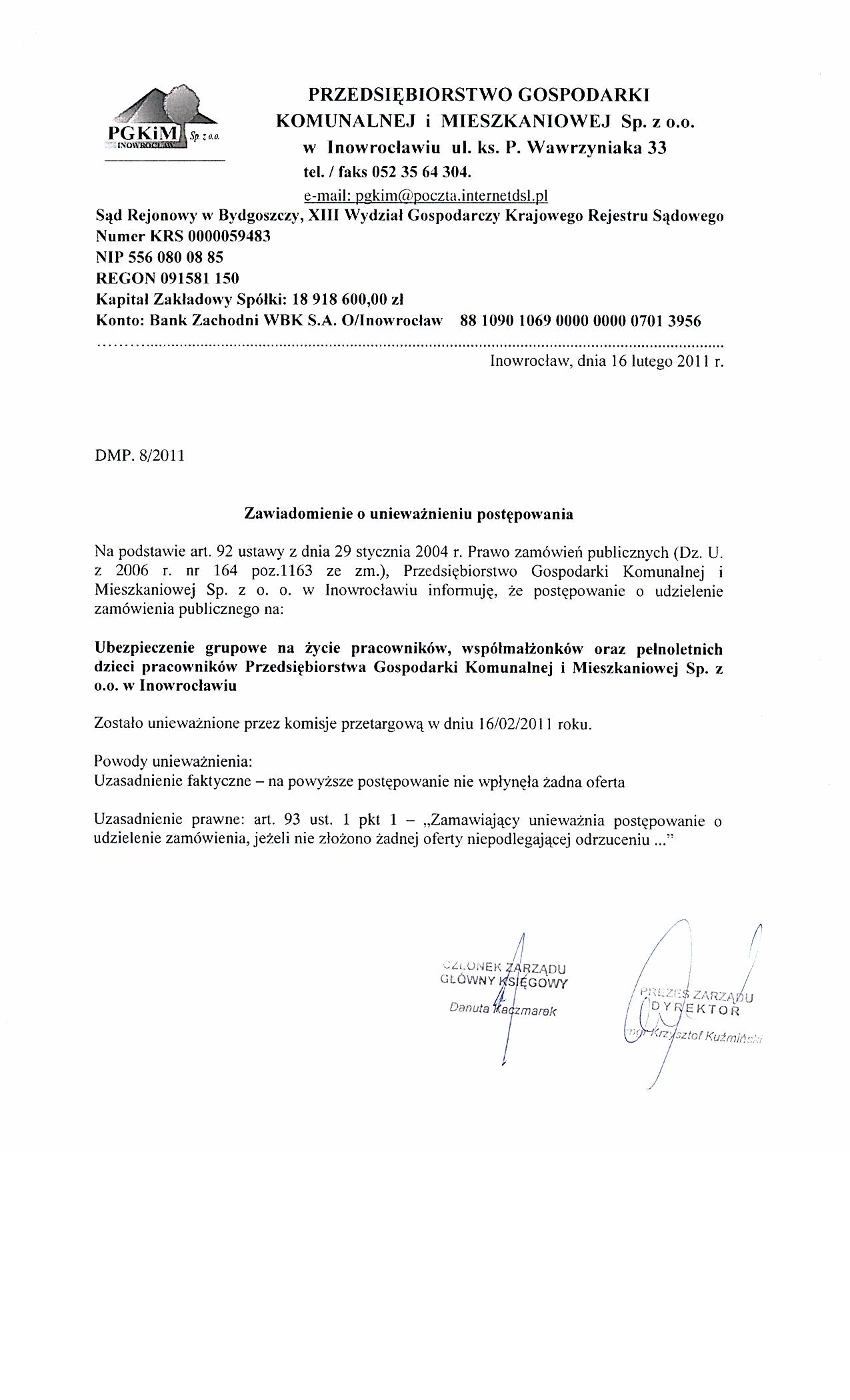 Ubezpieczenie grupowe na 偶ycie pracownik贸w, wsp贸艂ma艂偶onk贸w oraz pe艂noletnich dzieci pracownik贸w Przedsi臋biorstwa Gospodarki Komunalnej i Mieszkaniowej Sp. z o.o. w Inowroc艂awiu