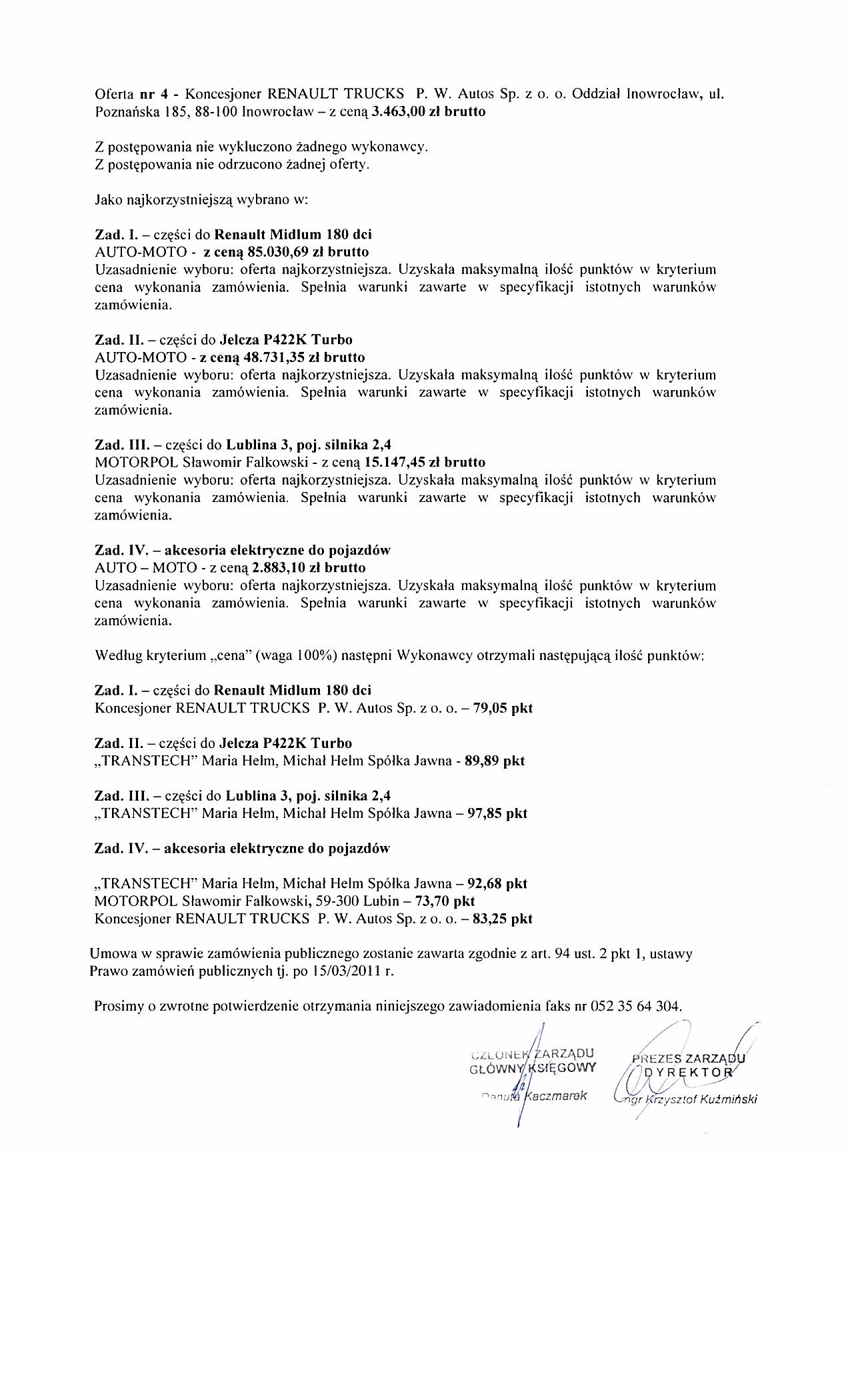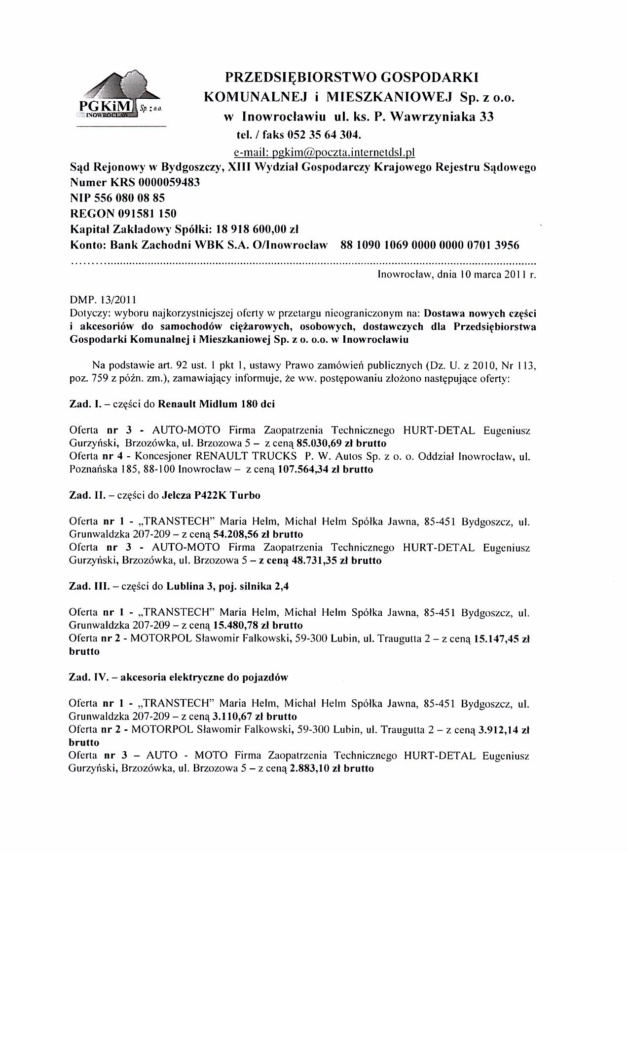 Dostawa nowych cz臋艣ci i akcesori贸w do samochod贸w ci臋偶arowych, osobowych, dostawczych dla Przedsi臋biorstwa Gospodarki Komunalnej i Mieszkaniowej Sp. z o. o. w Inowroc艂awiu