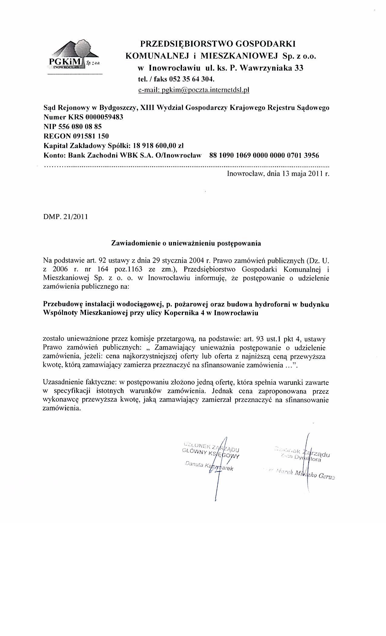 Przebudowa instalacji wodociągowej, p.pożarowej oraz budowa hydroforni w budynku Wspólnoty Mieszkaniowej przy ulicy Kopernika 4 w Inowrocławiu