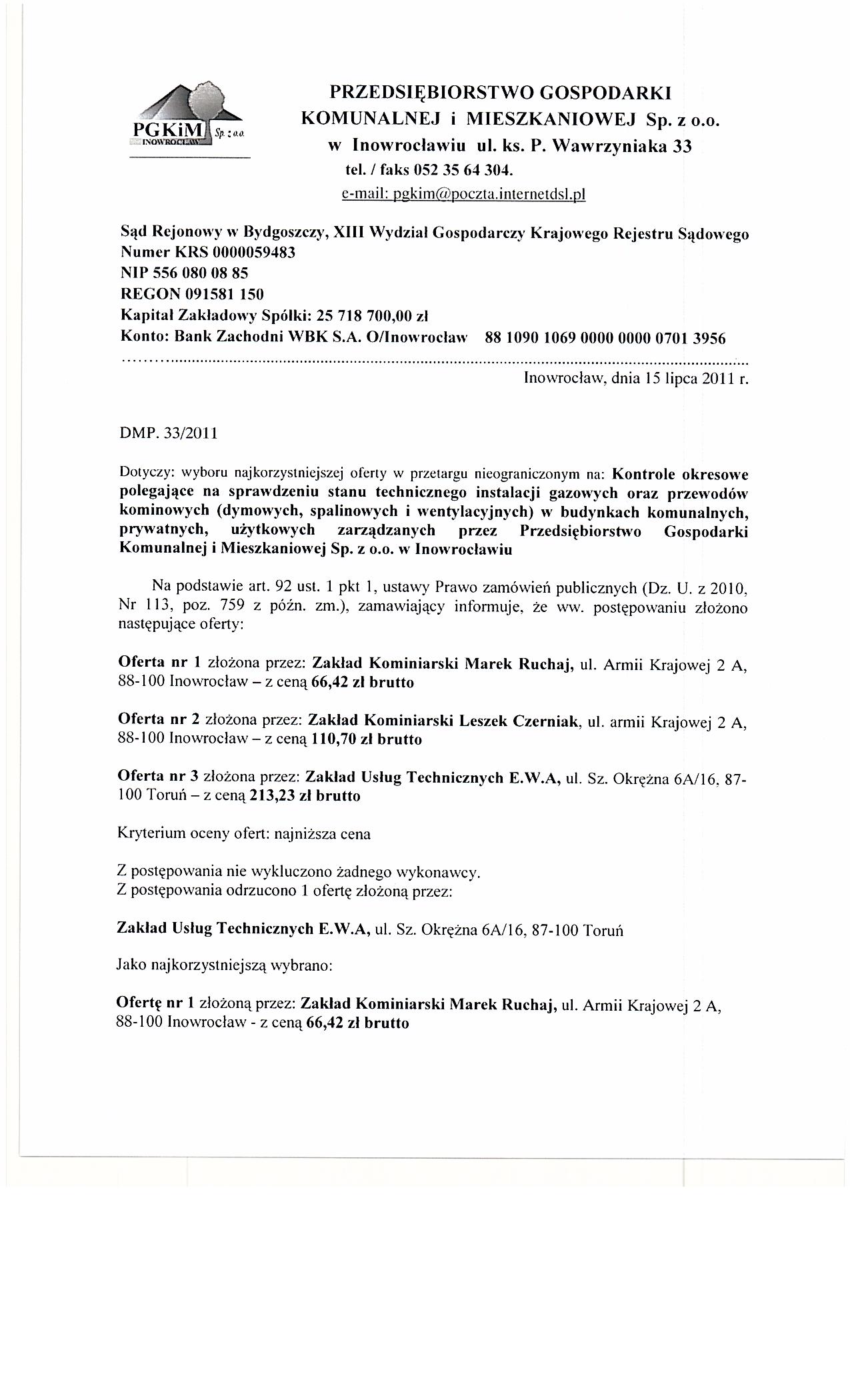 Kontrole okresowe polegaj膮ce na sprawdzeniu stanu technicznego instalacji gazowych oraz przewod贸w kominowych (dymowych, spalinowych i wentylacyjnych) w budynkach komunalnych, prywatnych, u偶ytkowych zarz膮dzanych przez Przedsi臋biorstwo Gospodarki Komunalnej i Mieszkaniowej Sp. z o. o. w Inowroc艂awiu