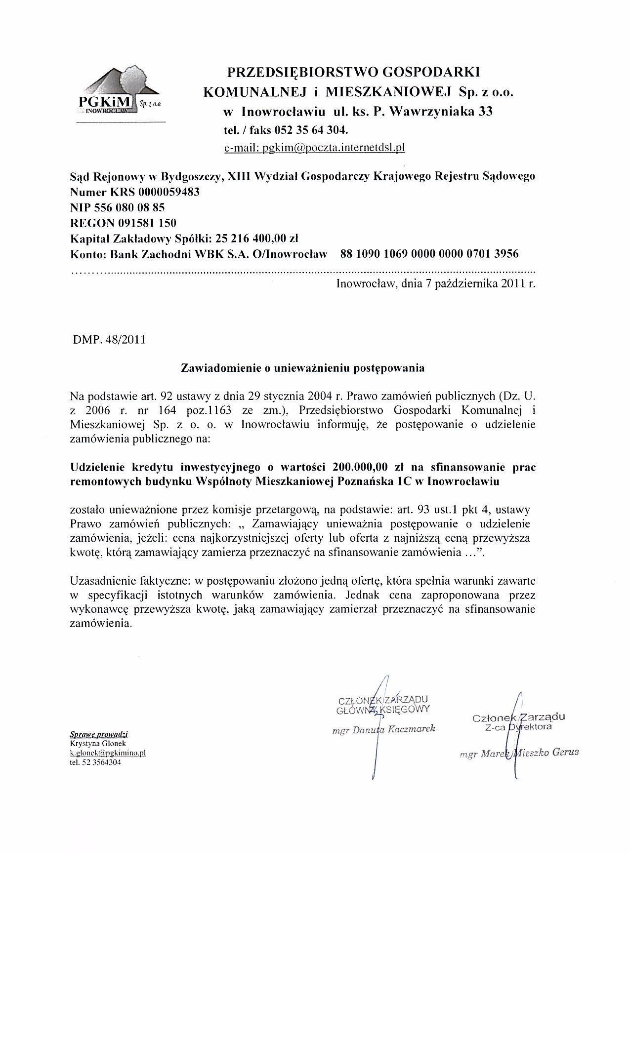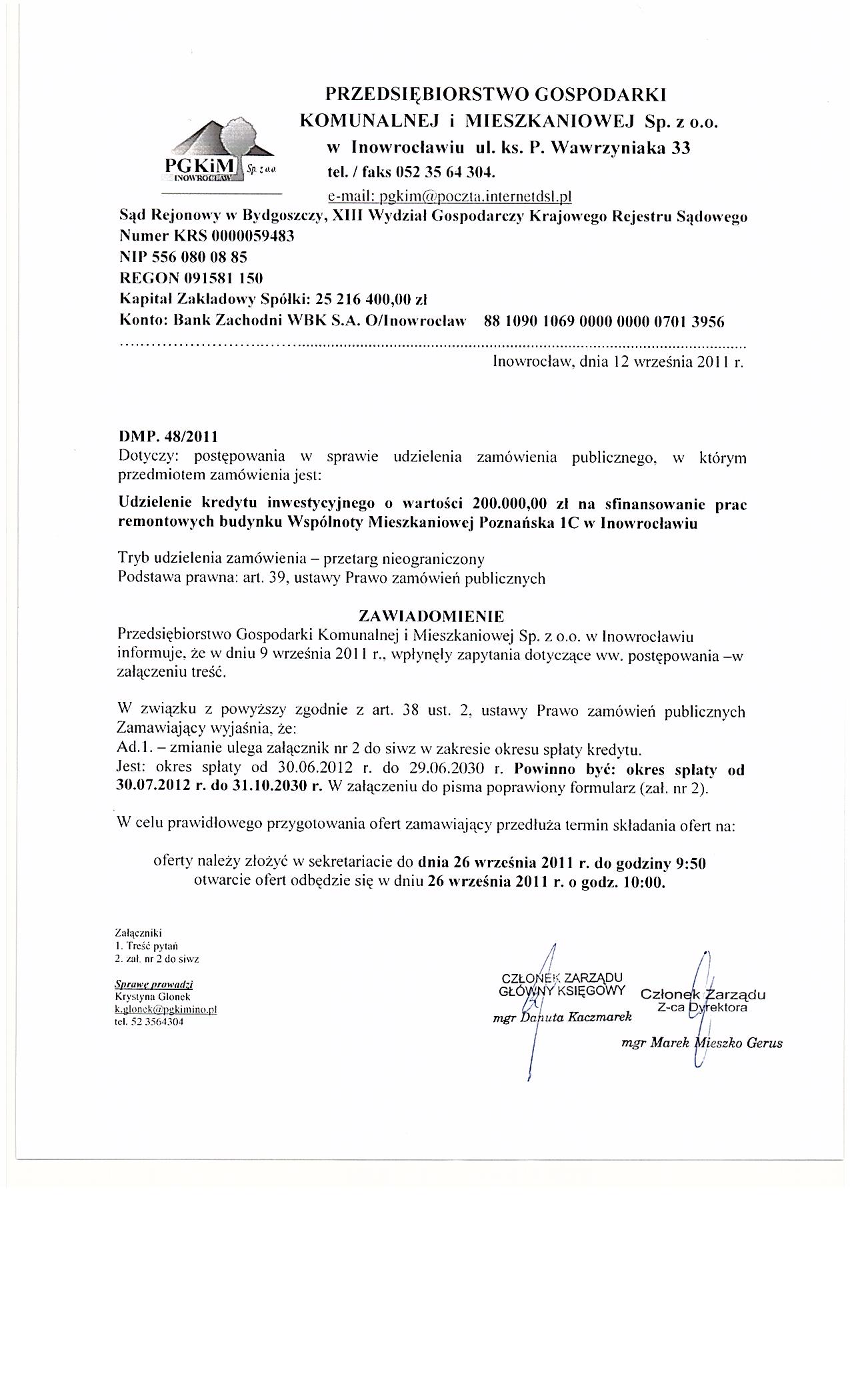 Udzielenie kredytu inwestycyjnego o wartości 200.000,00 zł na sfinansowanie prac remontowych budynku Współnoty Mieszkaniowej Poznańska 1 C w Inowrocławiu