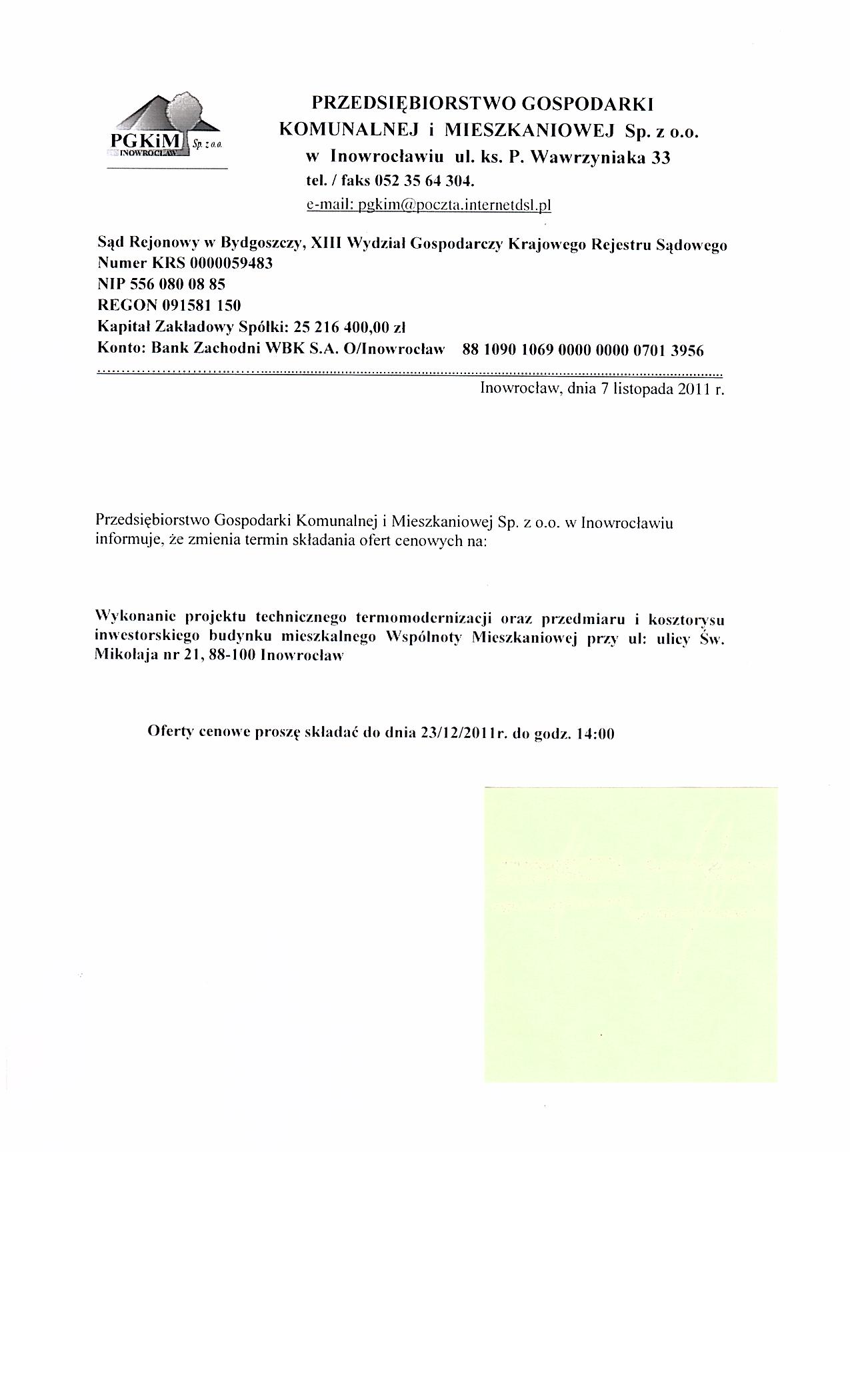 |  Przedsiębiorstwo Gospodarki Komunalnej i Mieszkaniowej Sp. z o.o. w Inowrocławiu zaprasza do składania ofert na wykonanie Projektu technicznego termomodernizacji oraz przedmiaru i kosztorysu inwestorskiego budynku mieszkalnego Wspólnoty Mieszkaniowej przy ul: ulicy Św. Mikołaja nr 21, 88-100 Inowrocław. . Zainteresowane osoby mogą uzyskać dodatkowe informacje w siedzibie Rejonu Obsługi Wspólnot Mieszkaniowych bądź telefonicznie pod numerem tel: 52 35-64-335. Oferty (z podaniem ceny netto) można składać zainteresowanym osobom w terminie do dnia 18-11-2011r. do godz. 14 |