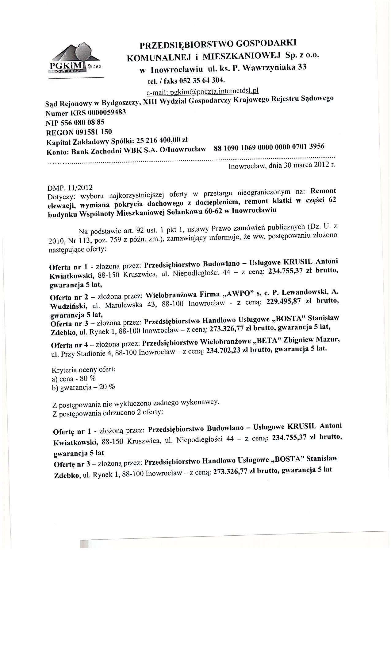 Remont elewacji, wymiana pokrycia dachowego z dociepleniem, remont klatki w cz臋艣ci 62 budynku Wsp贸艂noty Mieszkaniowej Solanka 60-62 w Inowroc艂awiu