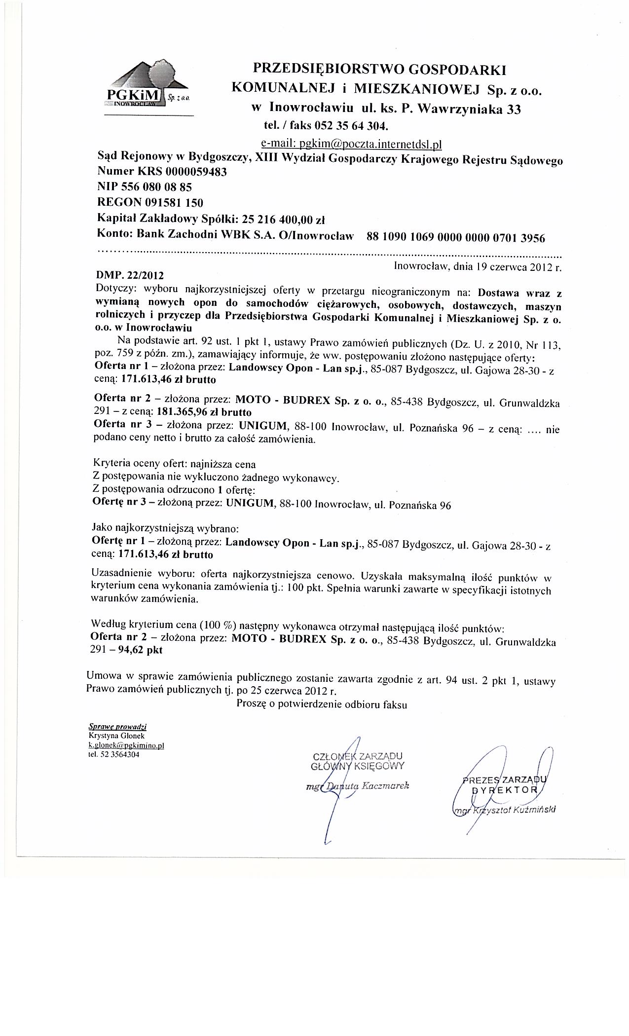 Dostawa wraz z wymianą nowych opon do samochodów ciężarowych, osobowych, dostawczych, maszyn rolniczych i przyczep dla Przedsiębiorstwa Gospodarki Komunalnej i Mieszkaniowej Sp. z o.o. w Inowrocławiu