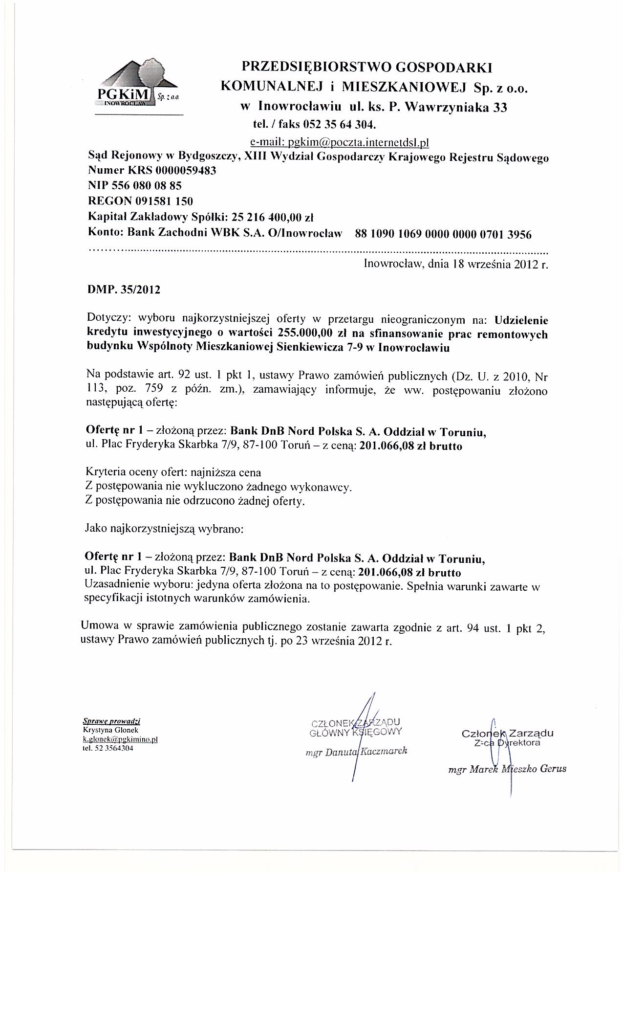 Udzielenie kredytu inwestycyjnego o warto艣ci 255.000,00 z艂 na sfinansowanie prac remontowych budynku Wsp贸lnoty Mieszkaniowej Sienkiewicza 7-9 w Inowroc艂awiu