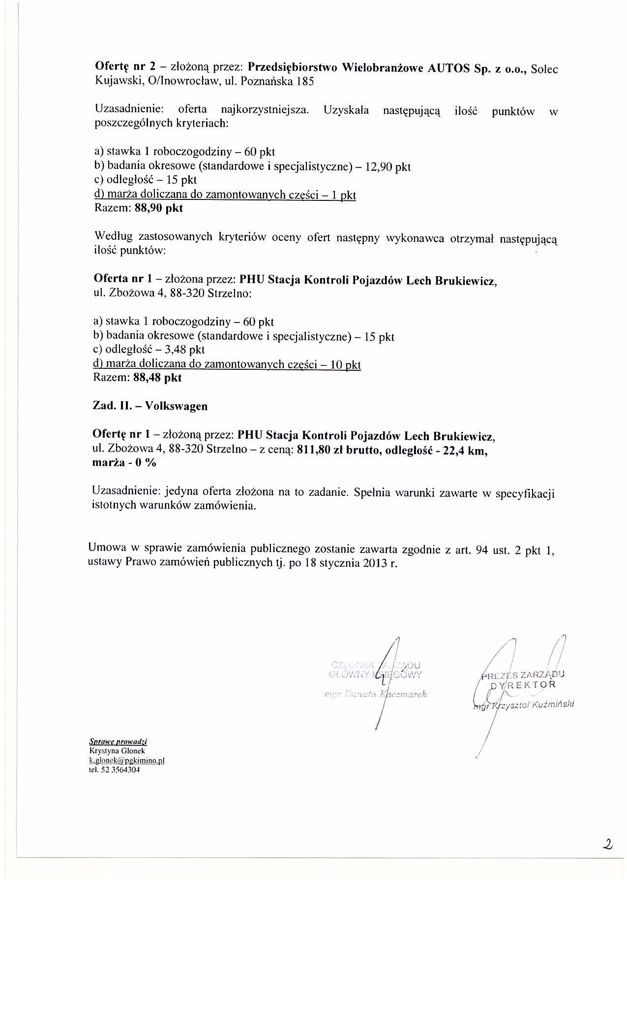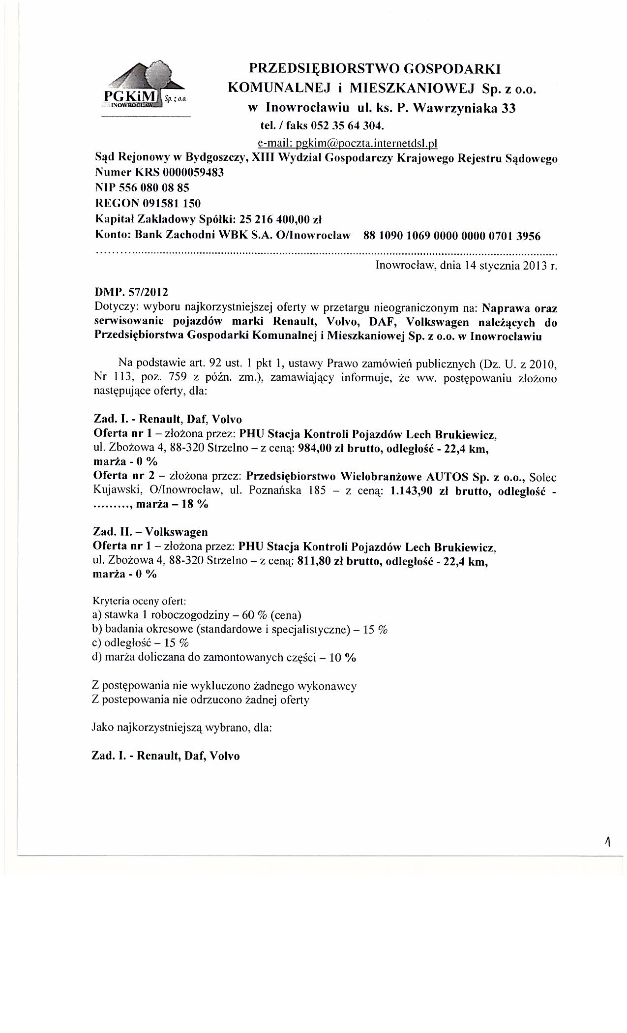 Naprawa oraz serwisowanie pojazdów marki Renault, Volvo, DAF, Volkswagen należących do Przedsiębiorstwa Gospodarki Komunalnej i Mieszkaniowej Sp. z o.o. w Inowrocławiu