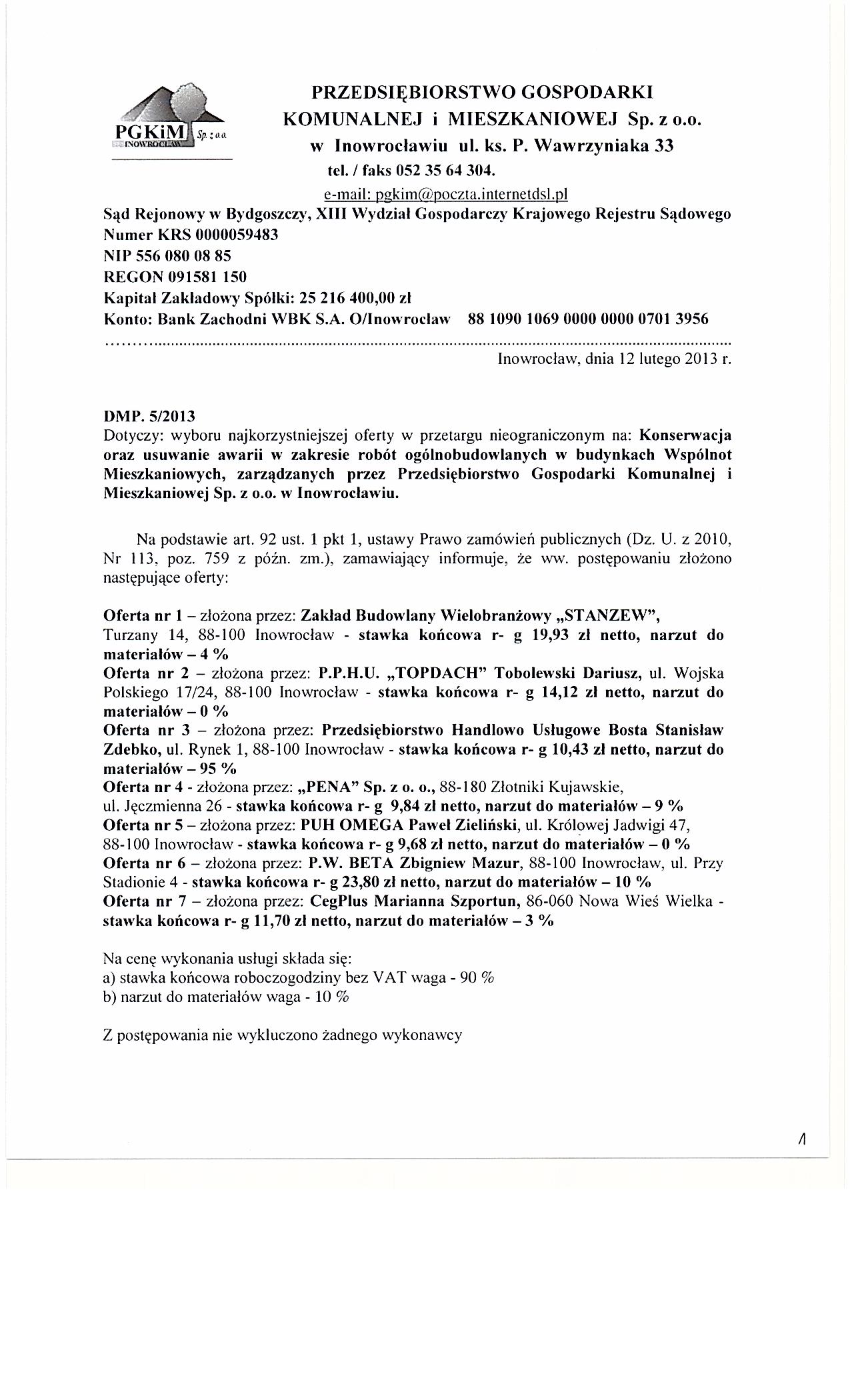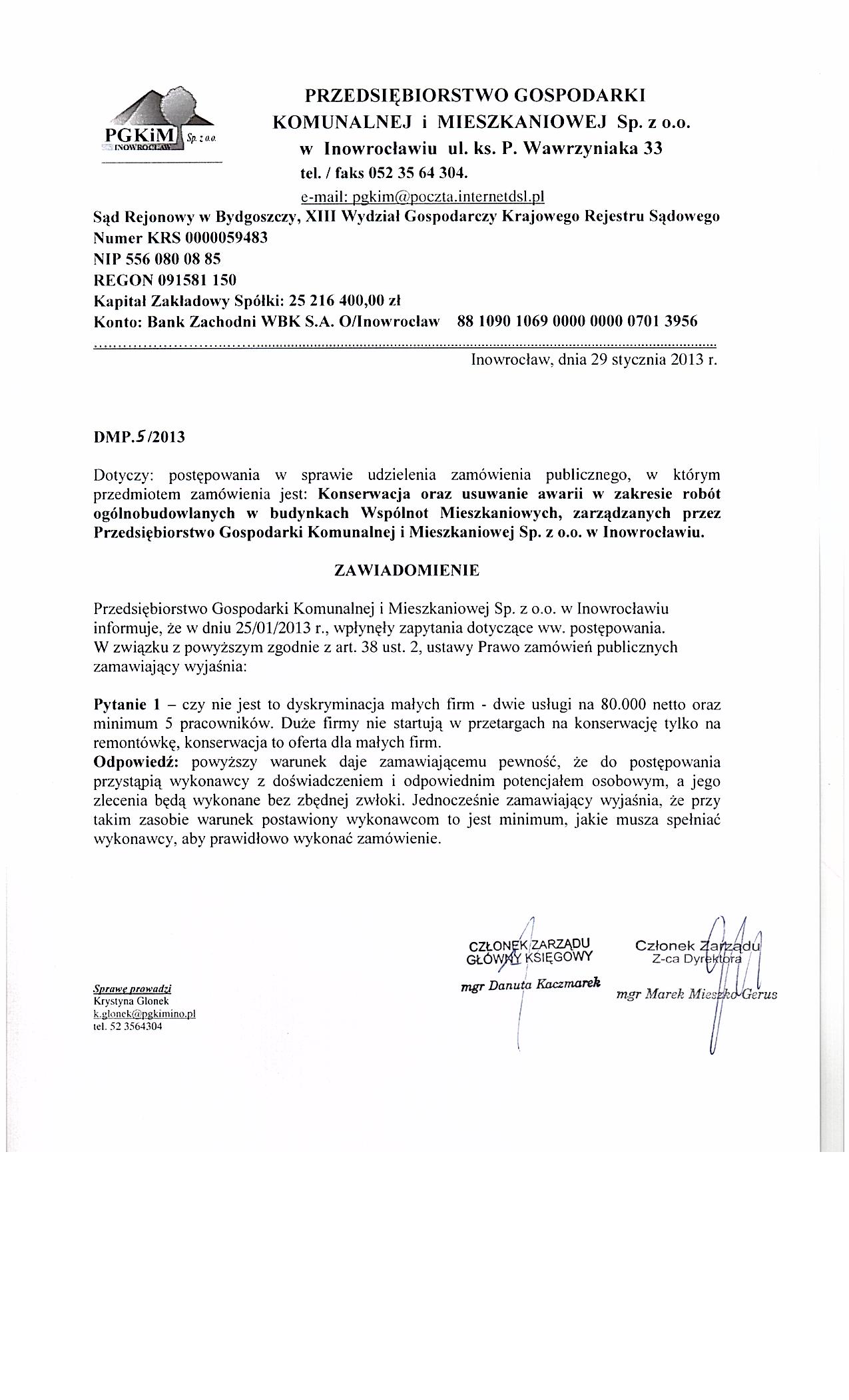 Konserwacja oraz usuwanie awarii w zakresie rob贸t og贸lnobudowlanych w budynkach Wsp贸lnot Mieszkaniowych, zarz膮dzanych przez Przedsi臋biorstwo Gospodarki Komunalnej i Mieszkaniowej Sp. z o.o. w Inowroc艂awiu