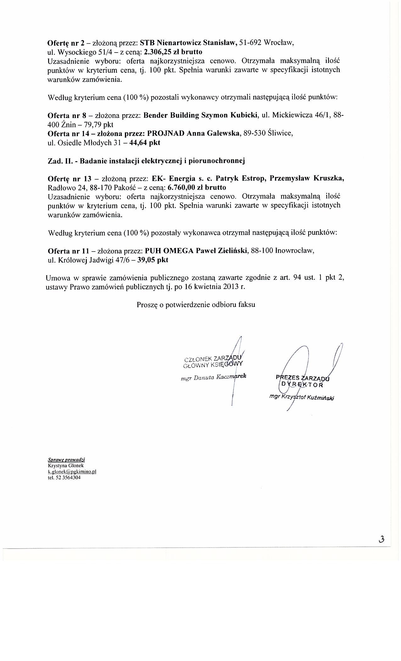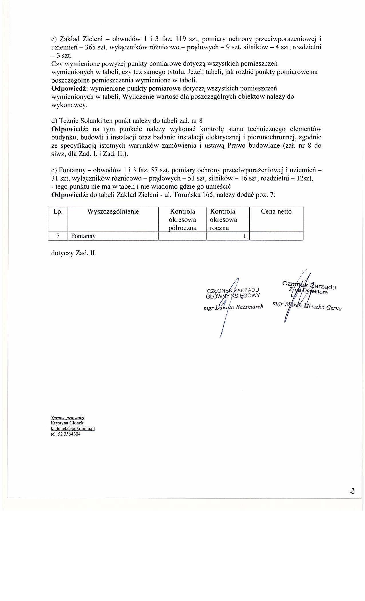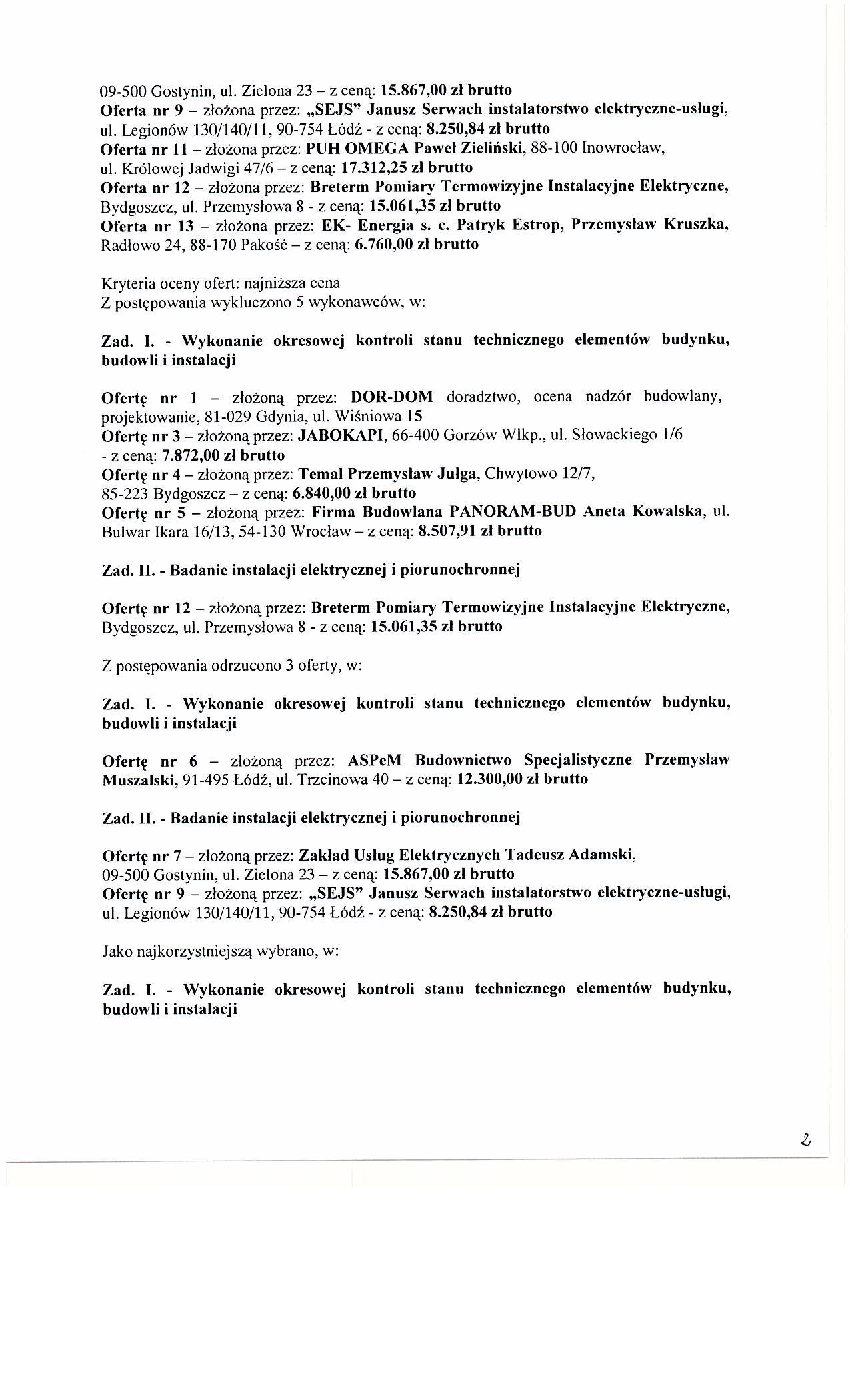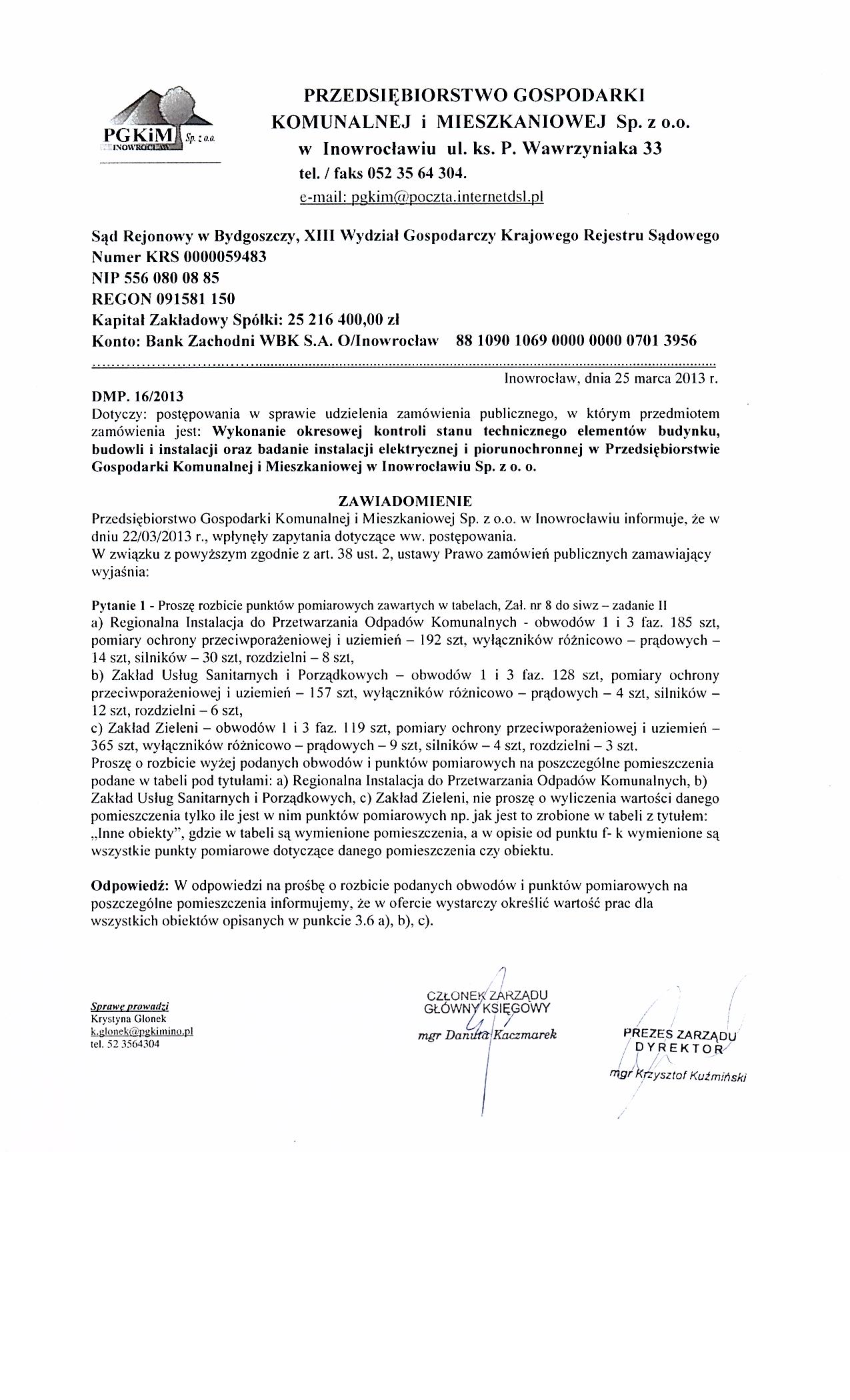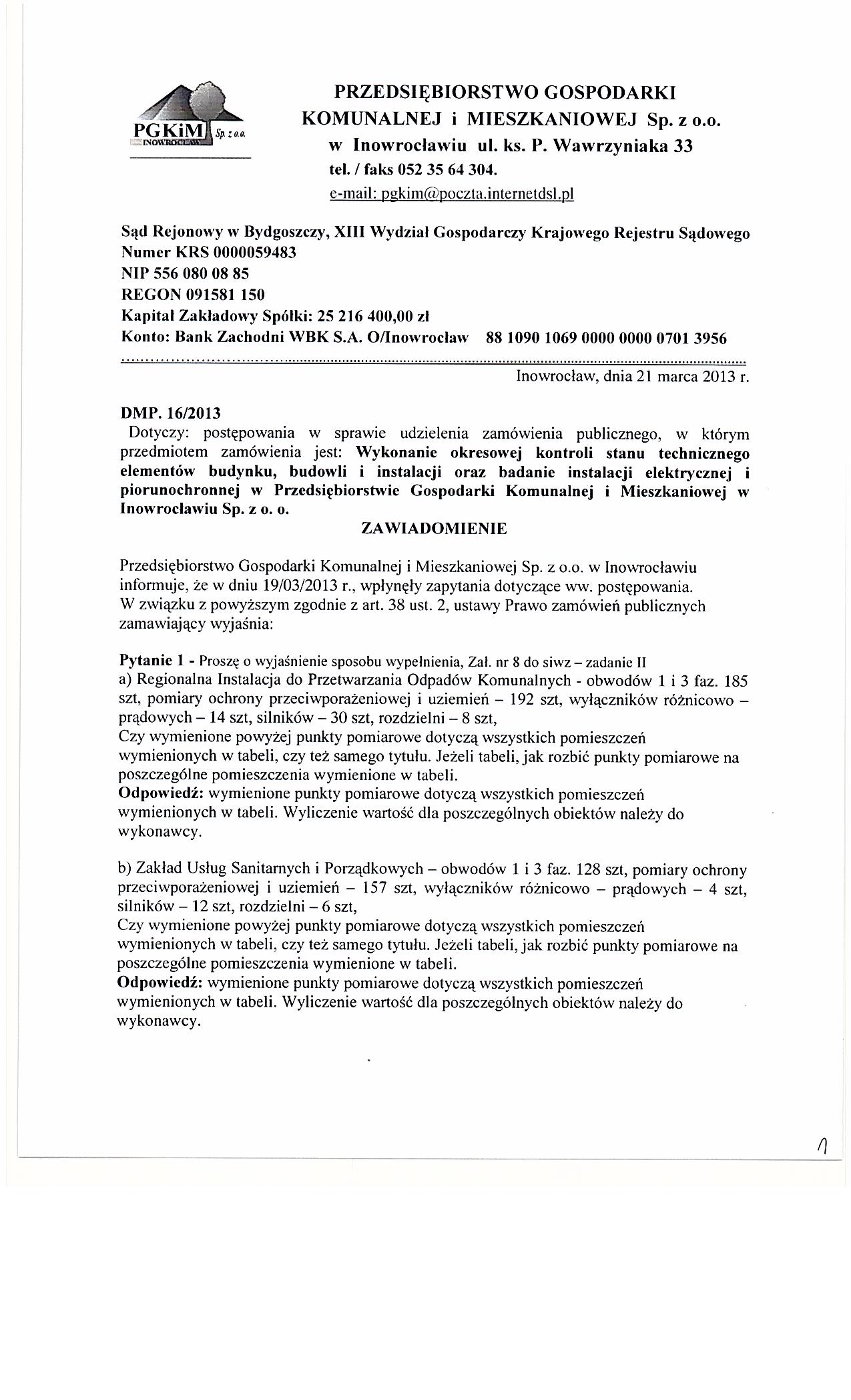 Wykonanie okresowej kontroli stanu technicznego elementów budynku, budowli i instalacji oraz badanie instalacji elektrycznej i piorunochronnej w Przedsiębiorstwie Gospodarki Komunalnej i Mieszkaniowej w Inowrocławiu Sp. z o.o.