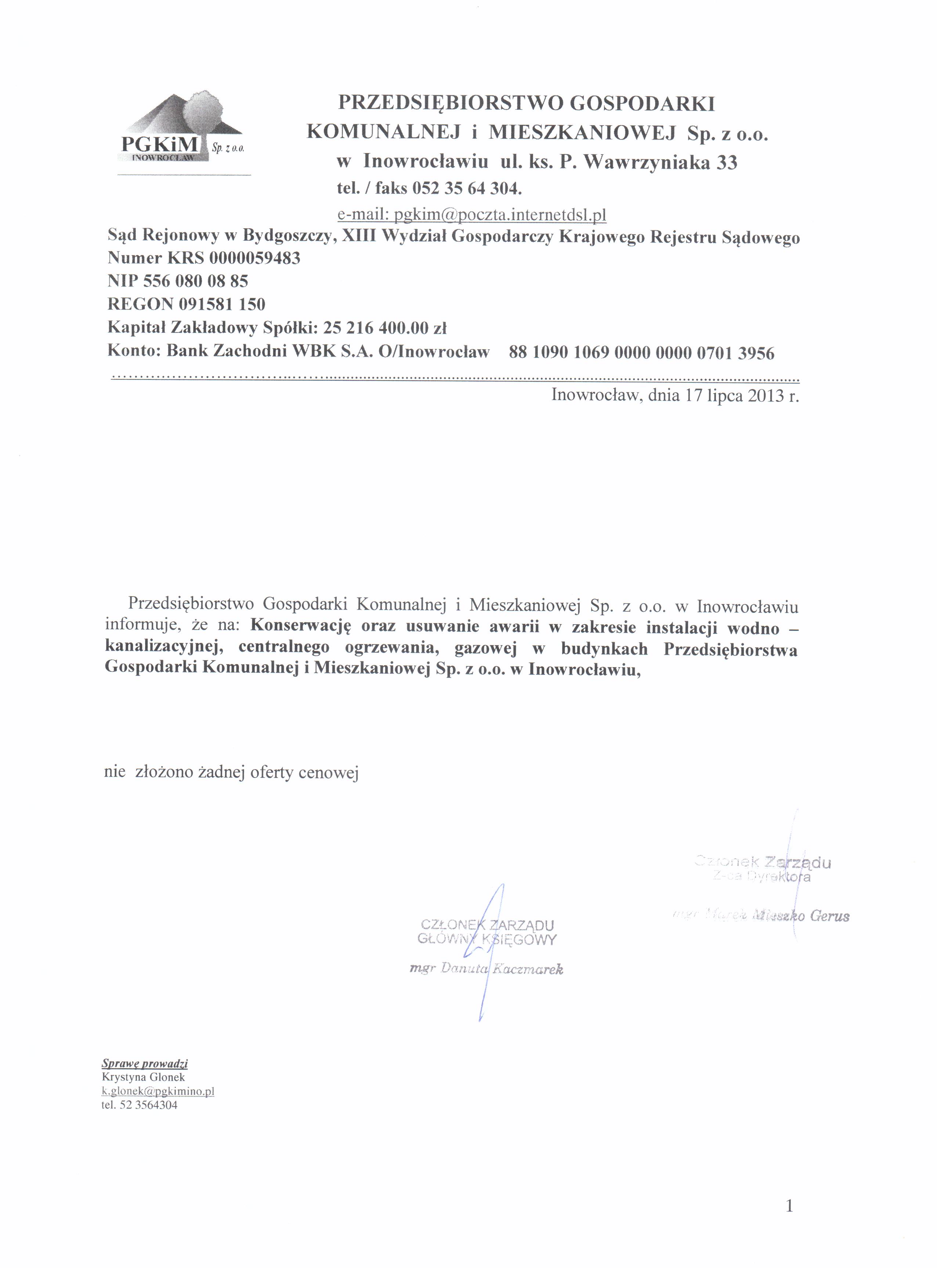 Konserwacja oraz usuwanie awarii w zakresie instalacji wodno-kanalizacyjnej, centralnego ogrzewania, gazowej w budynkach Przedsiębiorstwa Gospodarki Komunalnej i Mieszkaniowej Sp. z o. o. w Inowrocławiu