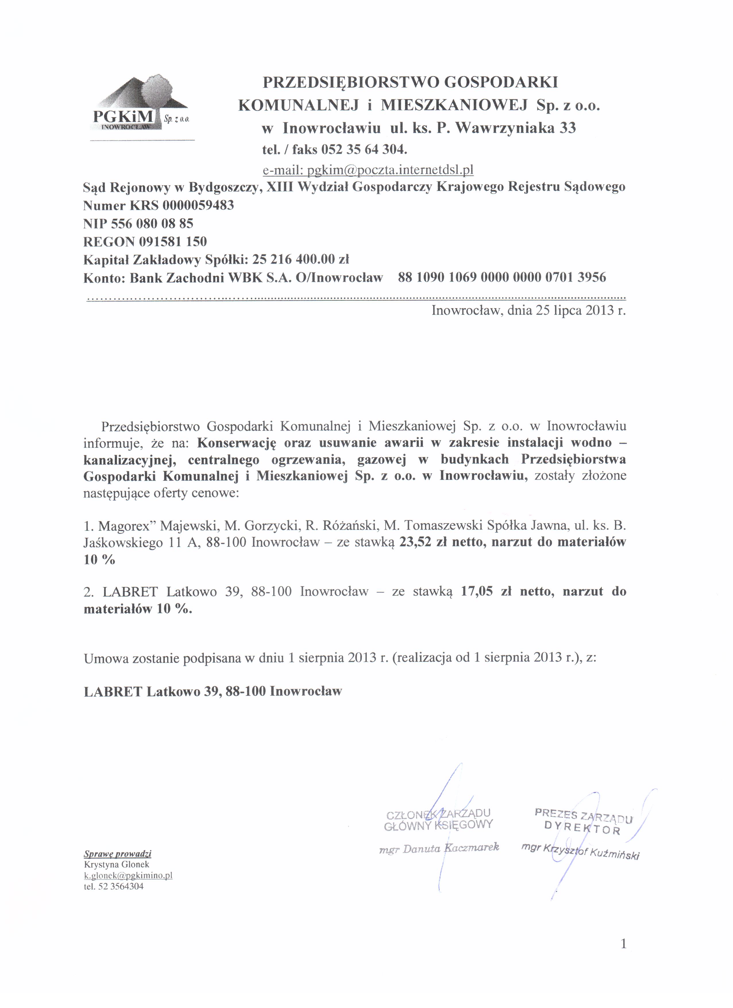 Konserwacja oraz usuwanie awarii w zakresie instalacji wodno-kanalizacyjnej, centralnego ogrzewania, gazowej w budynkach Przedsiębiorstwa Gospodarki Komunalnej i Mieszkaniowej Sp. z o. o. w Inowrocławiu