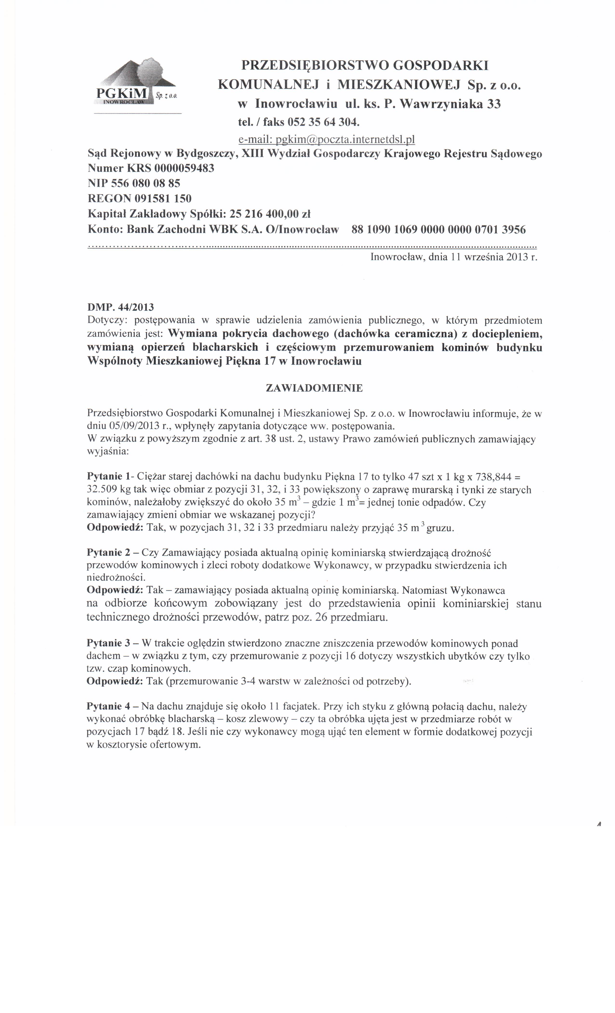 Wymiana pokrycia dachowego (dach贸wka ceramiczna) z dociepleniem, wymian膮 opierze艅 blacharskich i cz臋艣ciowym przemurowaniem komin贸w budynku Wsp贸lnoty Mieszkaniowej Pi臋kna 17 w Inowroc艂awiu