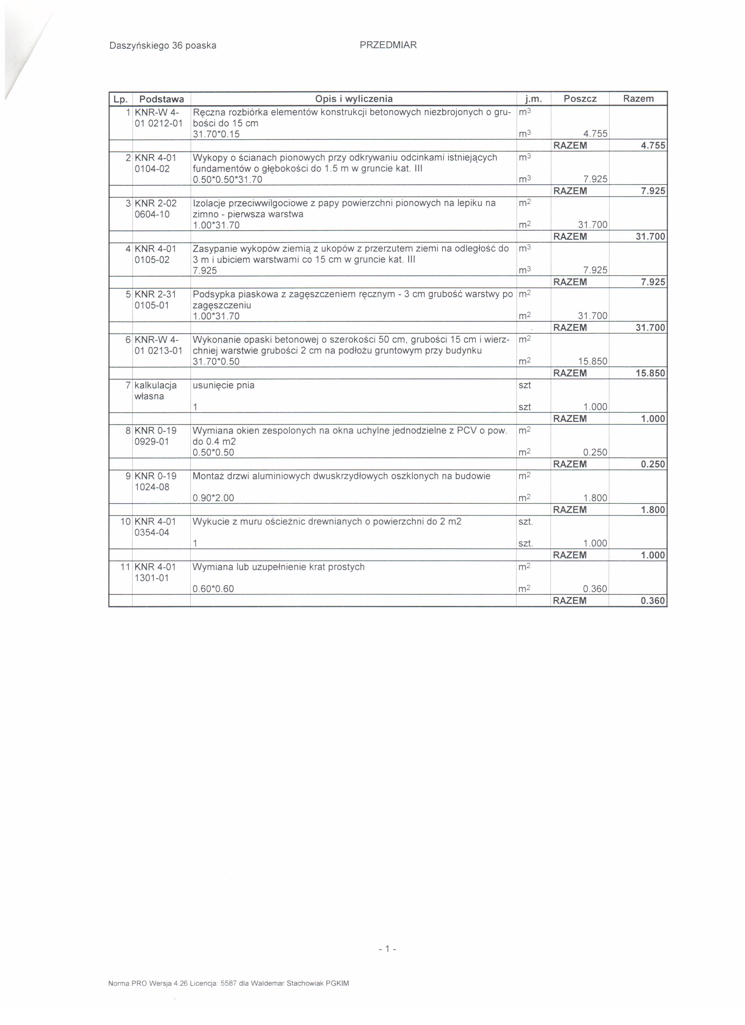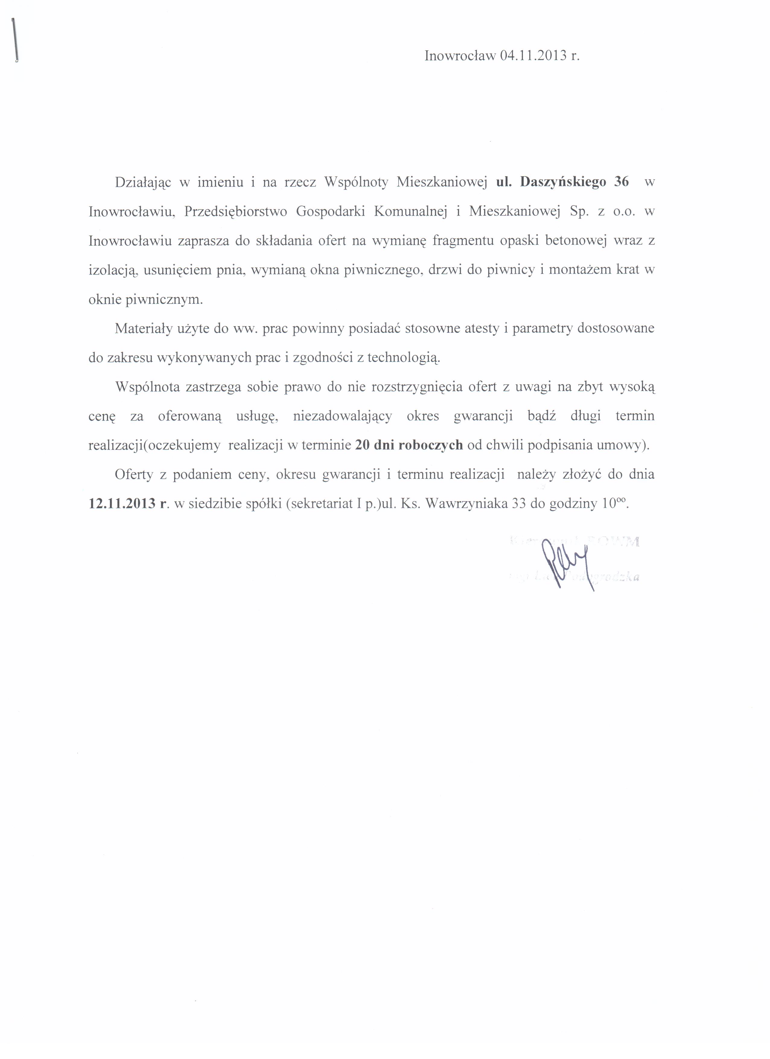 Wymiana fragmentu opaski betonowej wraz z izolacją, usunięciem pnia, wymianą okna piwnicznego, drzwi do piwnicy i montażem krat w budynku Wspólnoty Mieszkaniowej Daszyńskiego 36 w Inowrocławiu