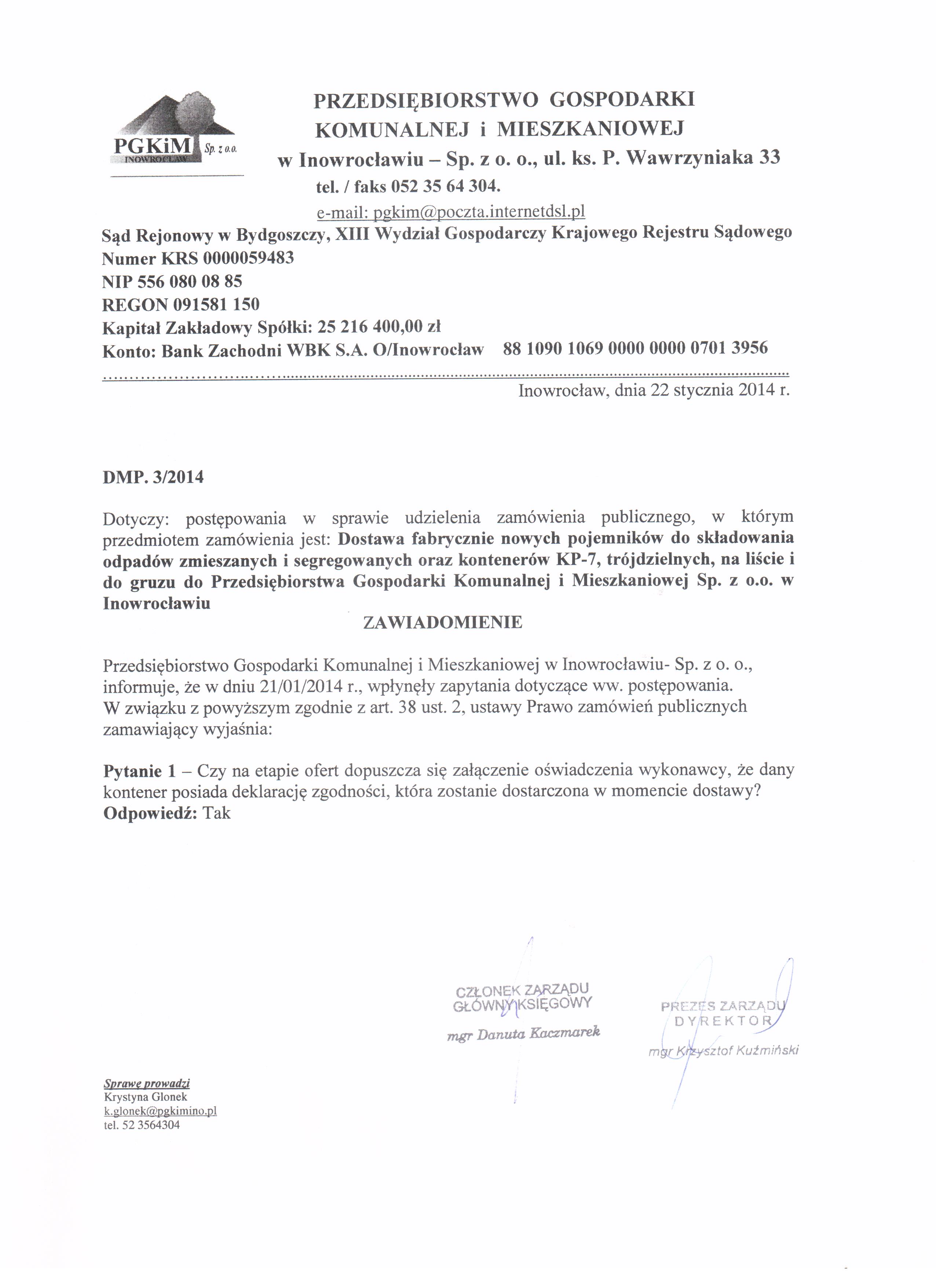 Dostawa fabrycznie nowych pojemnik贸w do sk艂adowania odpad贸w zmieszanych i segregowanych oraz kontener贸w KP-7, tr贸jdzielnych, na li艣cie i do gruzu do Przedsi臋biorstwa Gospodarki Komunalnej i Mieszkaniowej Sp. z o. o. w Inowroc艂awiu