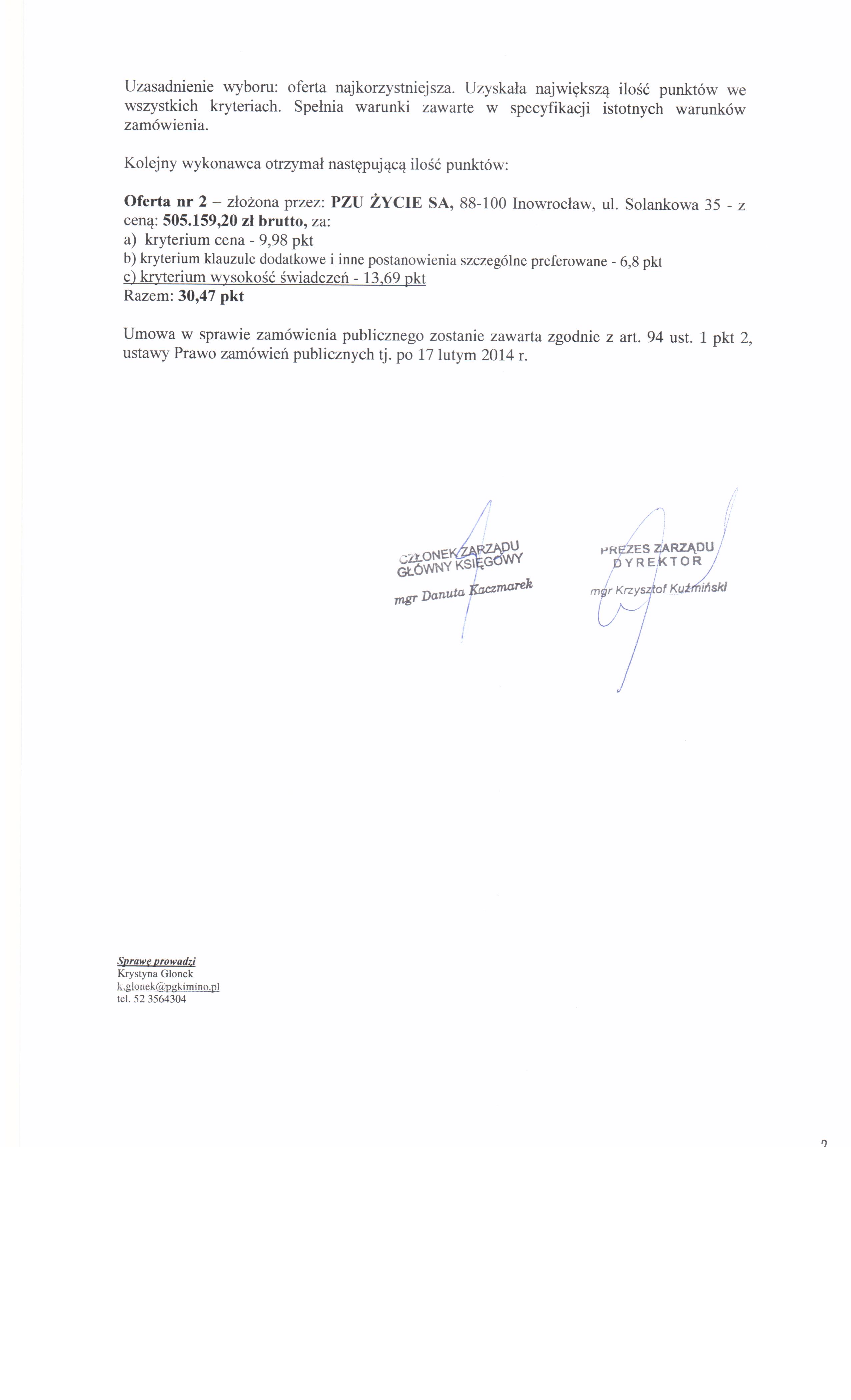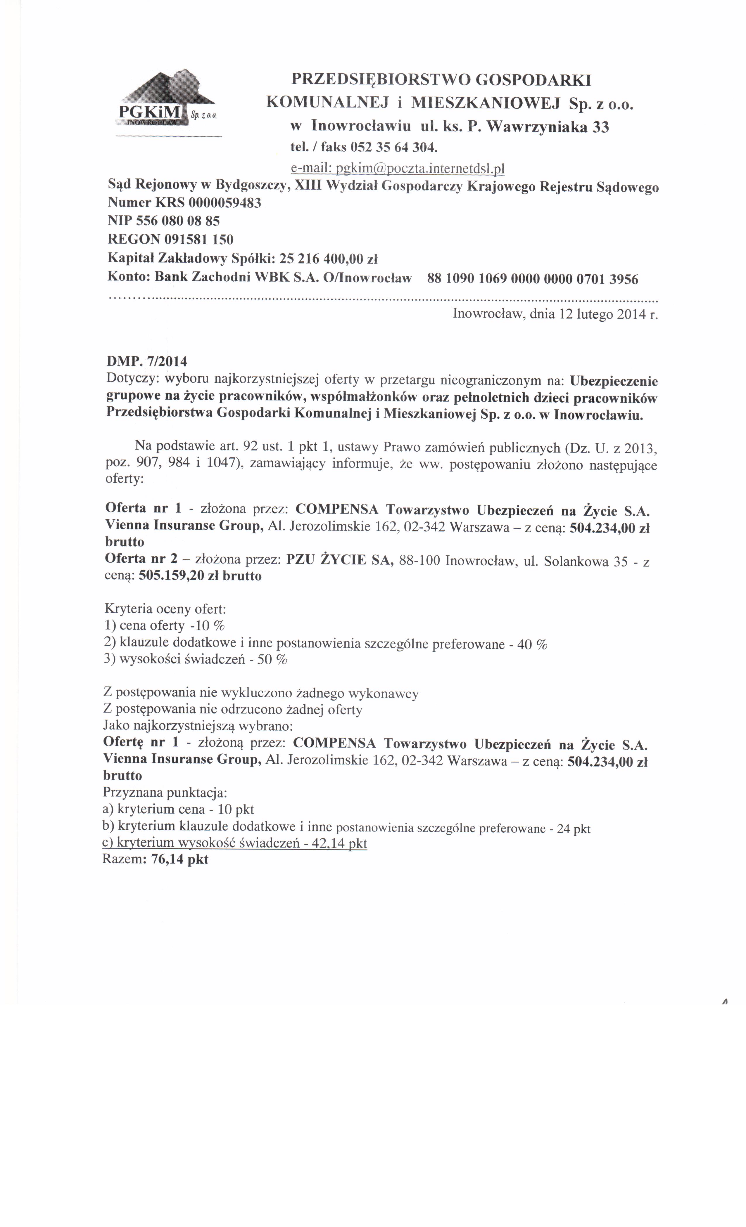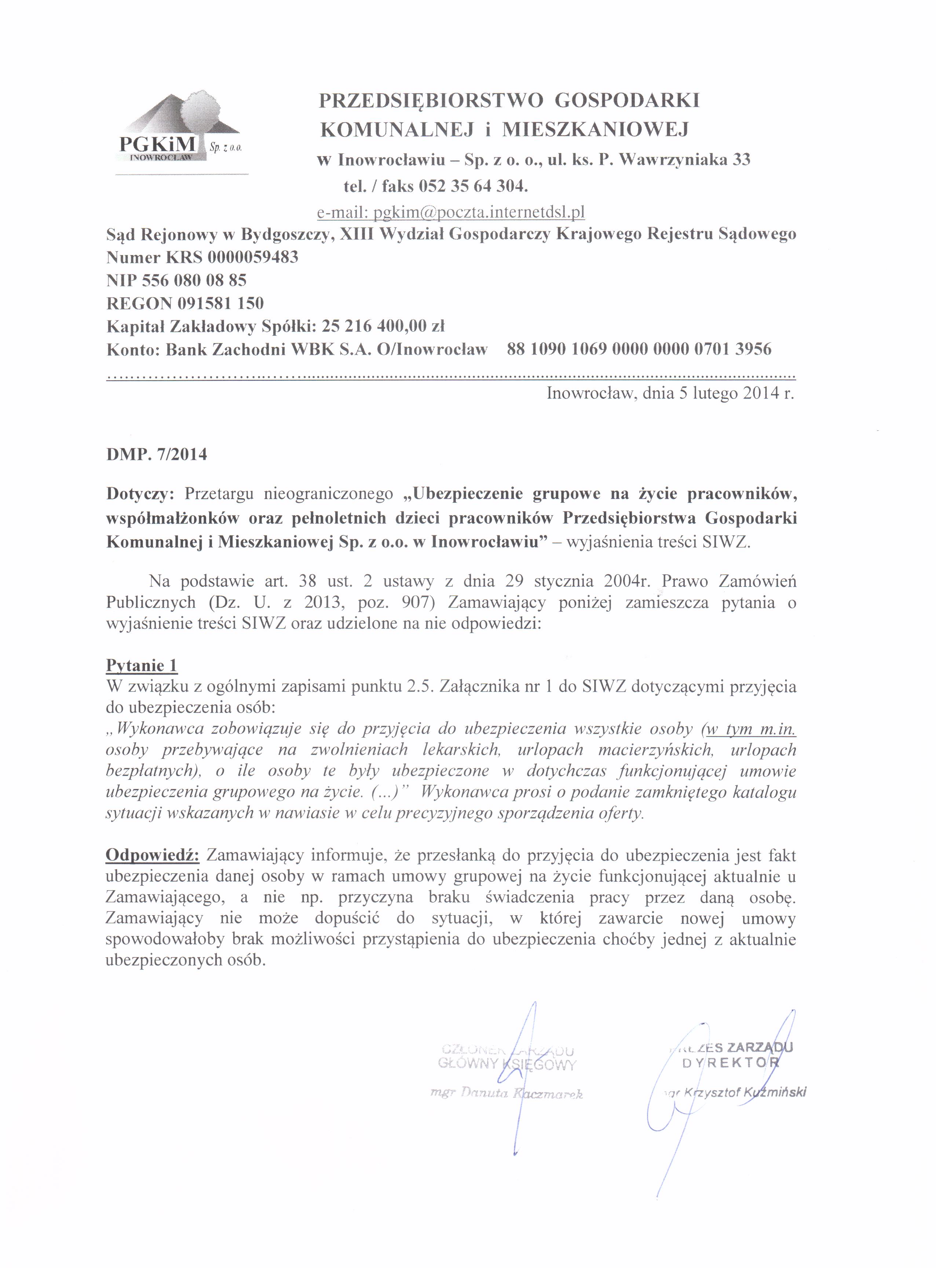 Ubezpieczenie grupowe na 偶ycie pracownik贸w, wsp贸艂ma艂偶onk贸w oraz pe艂noletnich dzieci pracownik贸w Przedsi臋biorstwa Gospodarki Komunalnej i Mieszkaniowej Sp. z o. o. w Inowroc艂awiu