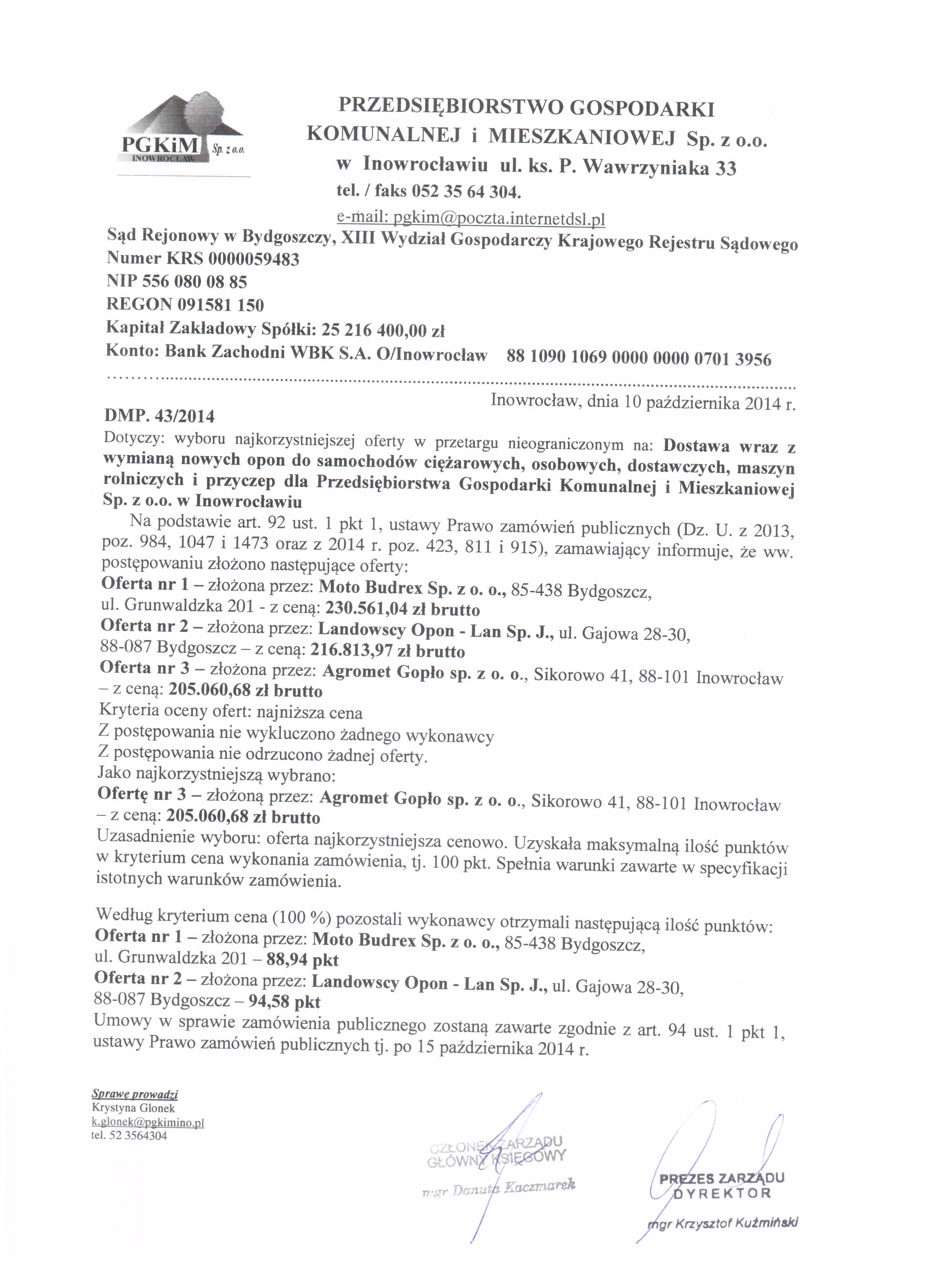 Dostawa wraz z wymianą nowych opon do samochodów ciężarowych, osobowych, dostawczych, maszyn rolniczych i przyczep dla Przedsiębiorstwa Gospodarki Komunalnej i Mieszkaniowej Sp. z o. o. w Inowrocławiu