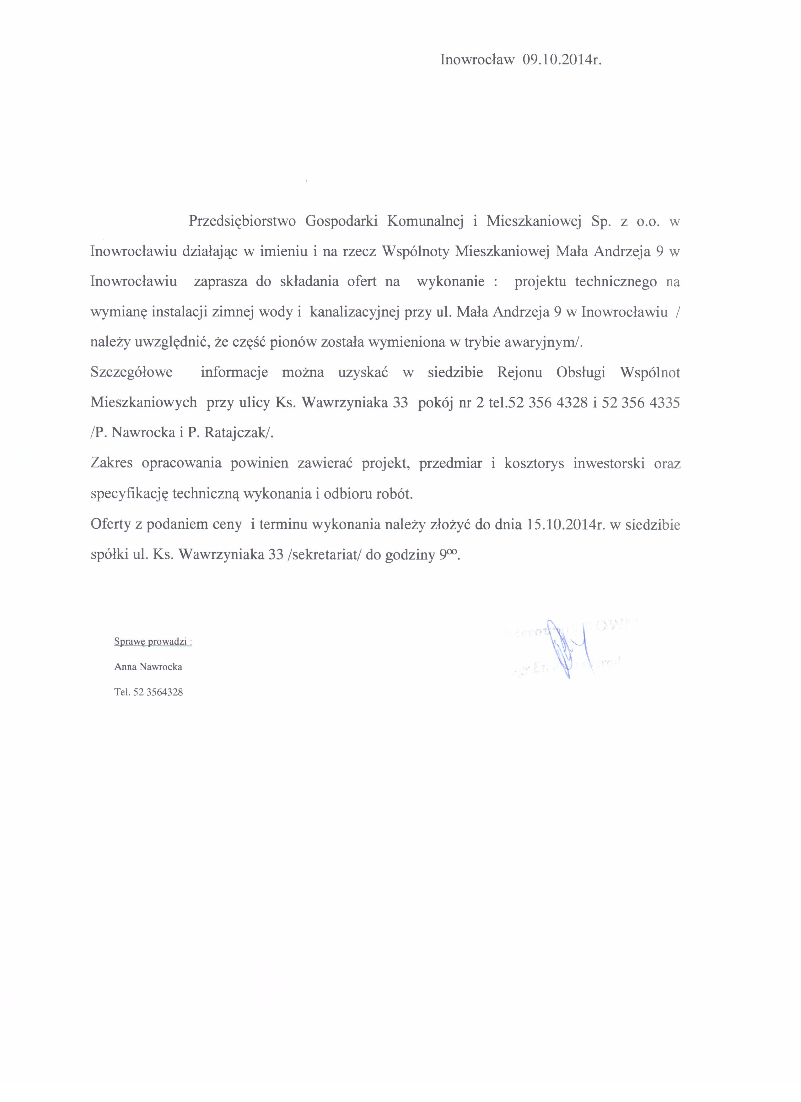Wykonanie projektu technicznego na wymianę instalacji zimnej wody i kanalizacyjnej w budynku Wspólnoty Mieszkaniowej Mała Andrzeja 9 w Inowrocławiu
