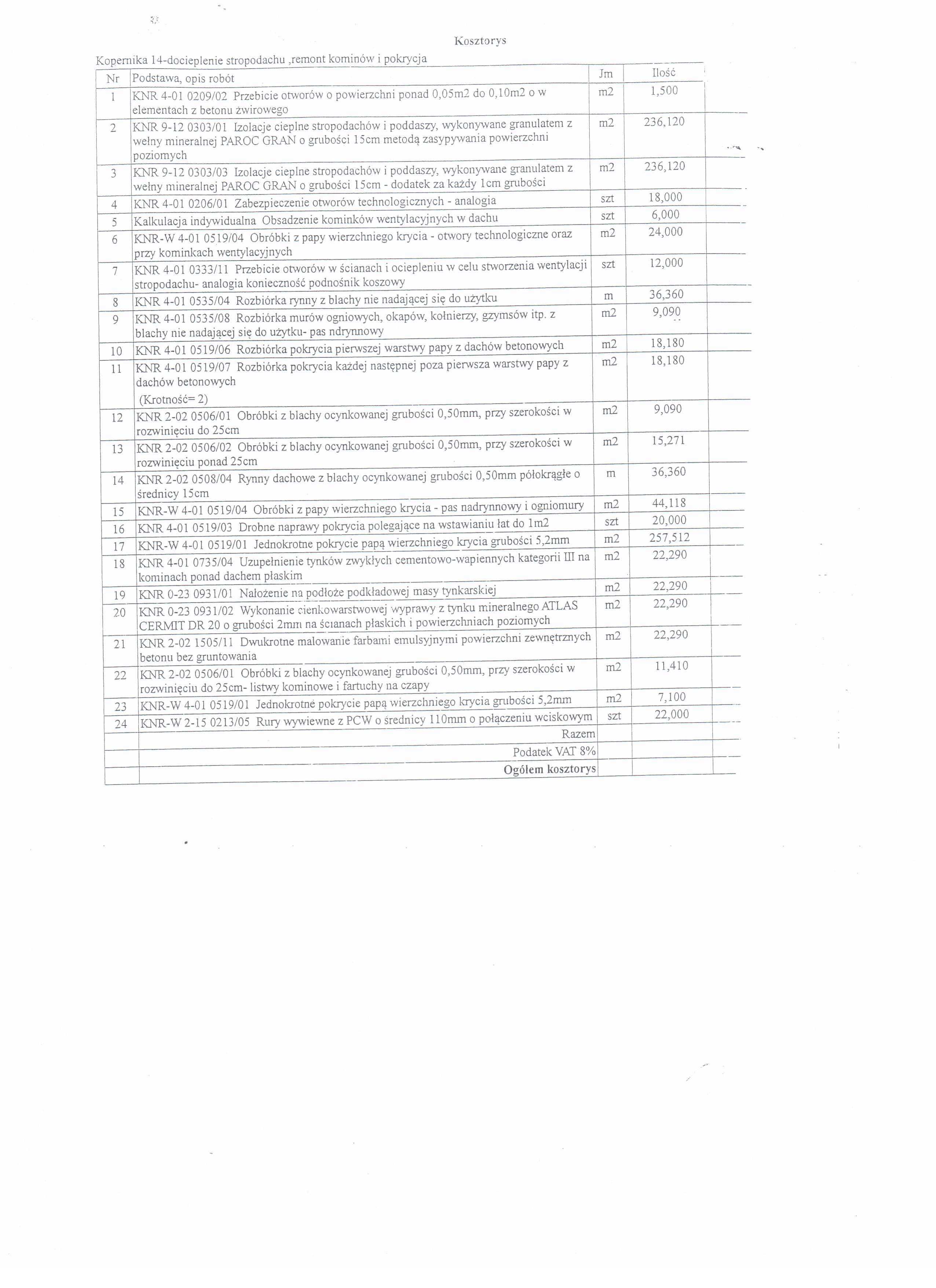 Docieplenie dachu granulatem z wełny mineralnej, wymiana rynien, obróbki blacharskie, naprawa kominów, pokrycie dachu papą w budynku Wspólnoty Mieszkaniowej Kopernika 14 w Inowrocławiu