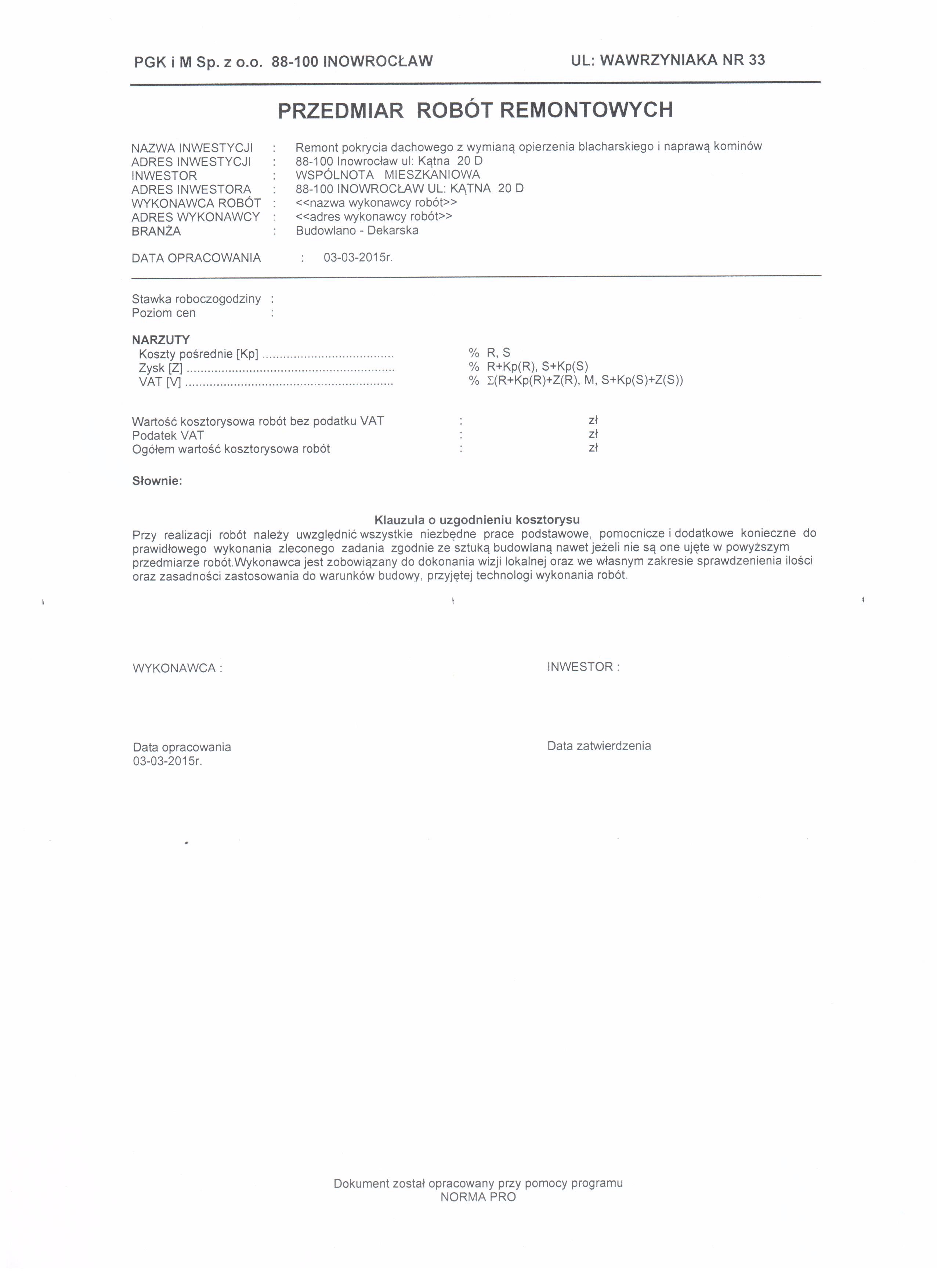 Wymiana pokrycia dachowego, naprawa kominów oraz wymiana obróbek blacharskich w budynku Wspólnoty Mieszkaniowej Kątna 20D w Inowrocławiu