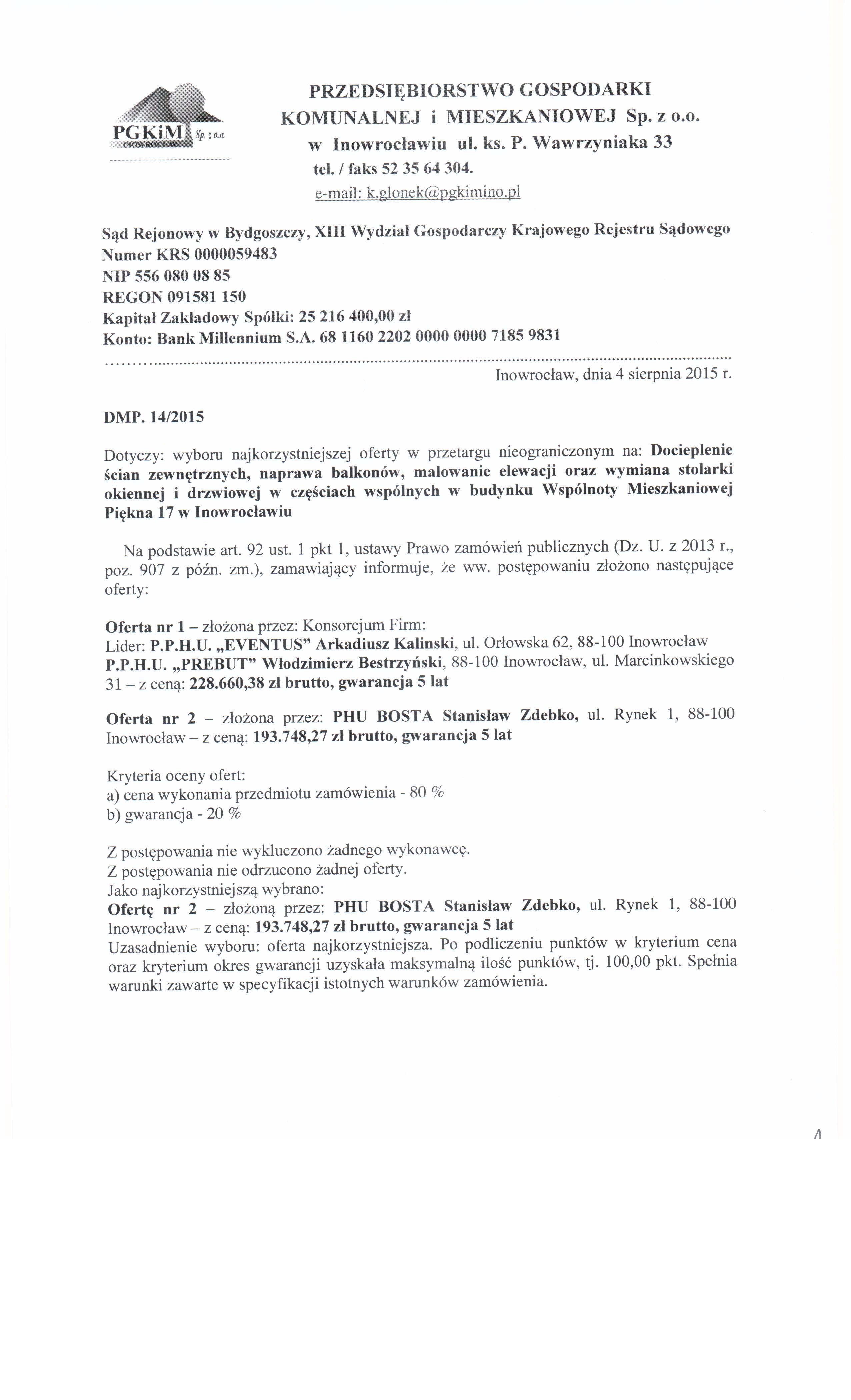 Docieplenie 艣cian zewn臋trznych, naprawa balkon贸w, malowanie elewacji oraz wymiana stolarki okiennej i drzwiowej w cz臋艣ciach wsp贸lnych w budynku Wsp贸lnoty Mieszkaniowej Pi臋kna 17 w Inowroc艂awiu