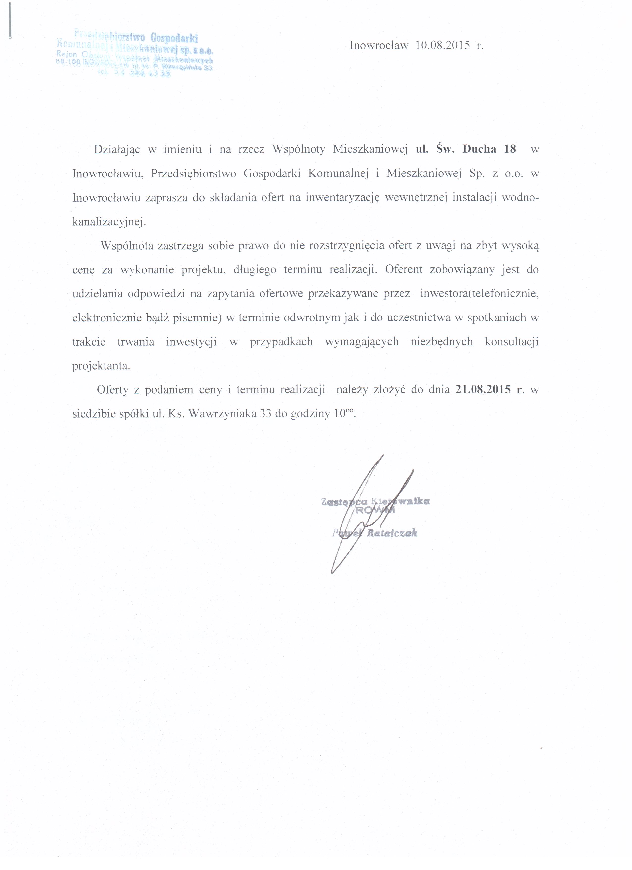 Inwentaryzacja wewnętrznej instalacji wodno-kanalizacyjnej w budynku Wspólnoty Mieszkaniowej Św. Ducha 18 w Inowrocławiu