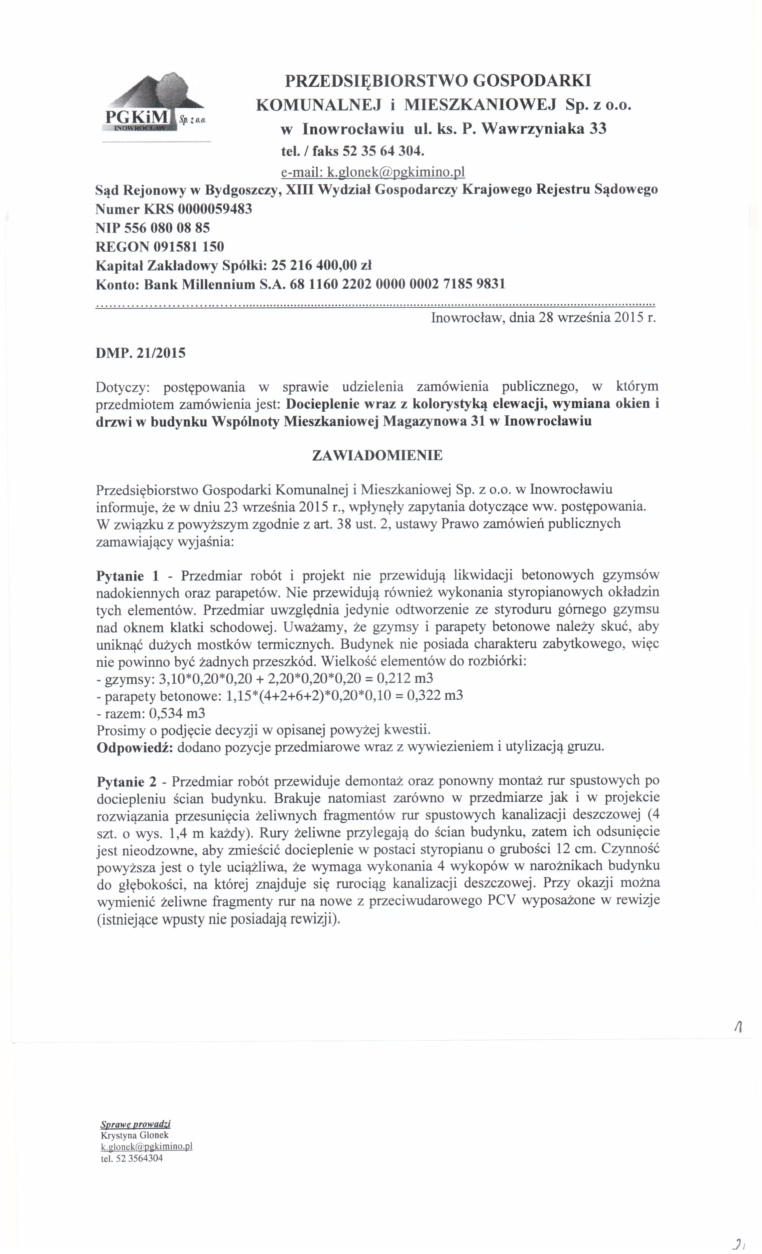 | Typ | Rozmiar | Pobierz | Komentarz | Data dodania | Licznik | ? | 23.3 KB | POBIERZ | Og艂oszenie | 2015-09-17 12:05:22 | 387 | .DOC | 315.5 KB | POBIERZ | Specyfikacja istotnych warunk贸w zam贸wienia | 2015-09-17 12:05:32 | 459 | .PDF | 50.6 KB | POBIERZ | Za艂. nr 8 do siwz - STWiOR | 2015-09-17 12:06:04 | 483 | graf. | 754.7 KB | POBIERZ | Za艂. nr 9 do siwz- przedmiar | 2015-09-17 12:06:22 | 486 | graf. | 751.1 KB | POBIERZ | s.2 | 2015-09-17 12:06:30 | 449 | graf. | 433.1 KB | POBIERZ | s.3 | 2015-09-17 12:06:39 | 476 | .PDF | 121.3 KB | POBIERZ | Za艂. nr 10 do siwz -PB | 2015-09-17 12:06:57 | 748 | .PDF | 195.9 KB | POBIERZ | Rys. 1 | 2015-09-17 12:07:12 | 443 | .PDF | 196.4 KB | POBIERZ | Rys. 2 | 2015-09-17 12:07:22 | 461 | .PDF | 105.9 KB | POBIERZ | Rys. 3 | 2015-09-17 12:07:31 | 442 | .PDF | 107.2 KB | POBIERZ | Rys. 4 | 2015-09-17 12:07:40 | 490 | graf. | 794.1 KB | POBIERZ | Odpowiedzi na zapytania | 2015-09-28 13:33:11 | 391 | graf. | 527.4 KB | POBIERZ | s.2 | 2015-09-28 13:33:23 | 367 | graf. | 460.2 KB | POBIERZ | Dodatkowy przedmiar | 2015-09-28 13:33:41 | 376 | graf. | 647.8 KB | POBIERZ | Wyb贸r | 2015-10-23 14:03:20 | 399 | graf. | 325.2 KB | POBIERZ | s.2 | 2015-10-23 14:03:32 | 361 | ? | 17.1 KB | POBIERZ | Og艂oszenie o udzieleniu zam贸wienia BZP 156835-2015 | 2015-10-28 10:27:56 | 397 |