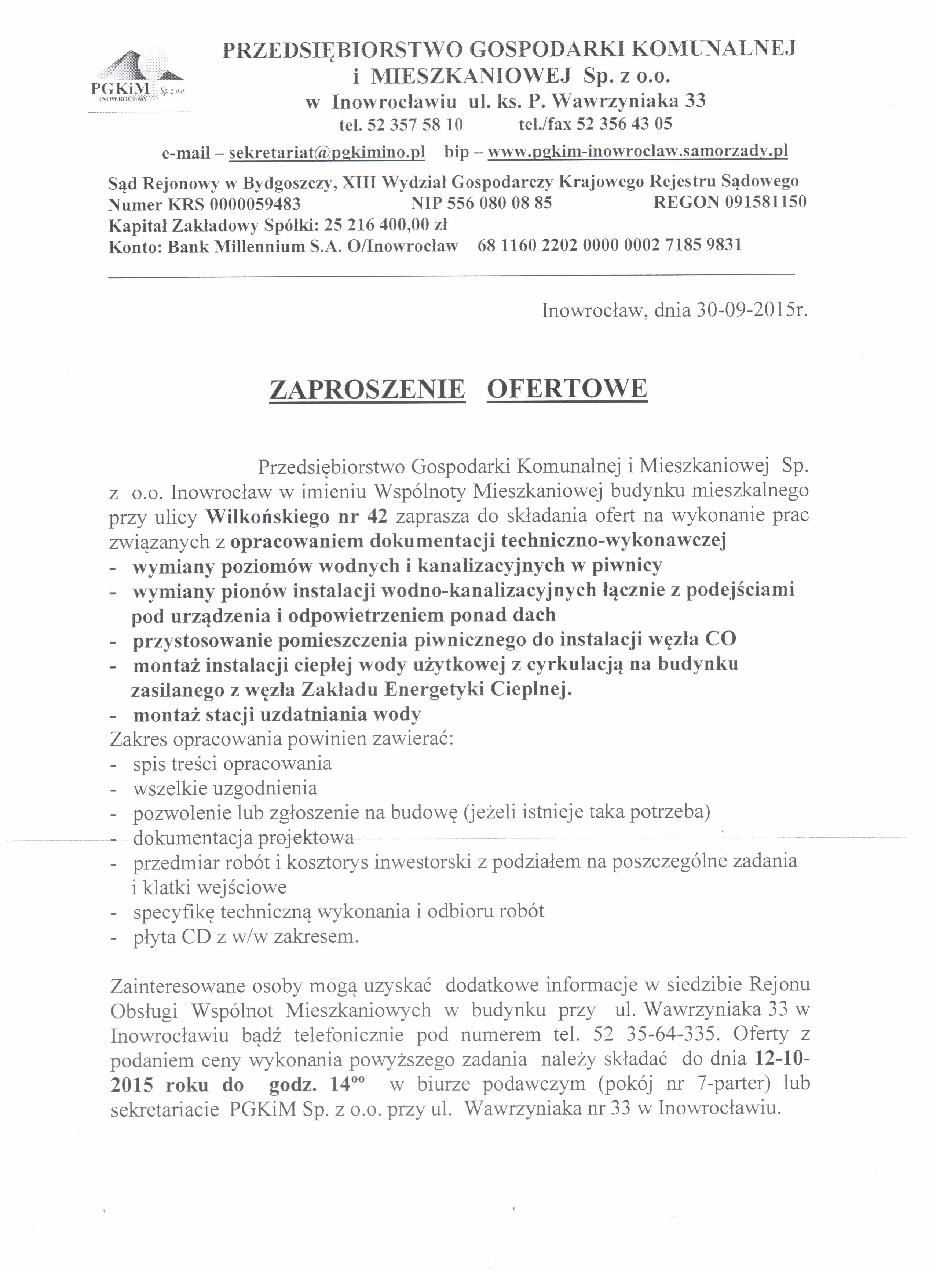Opracowanie dokumentacji techniczno-wykonawczej na wymianę instalacji wodno-kanalizacyjnej, CO w budynku Wspólnoty Mieszkaniowej Wilkońskiego 42 w Inowrocławiu