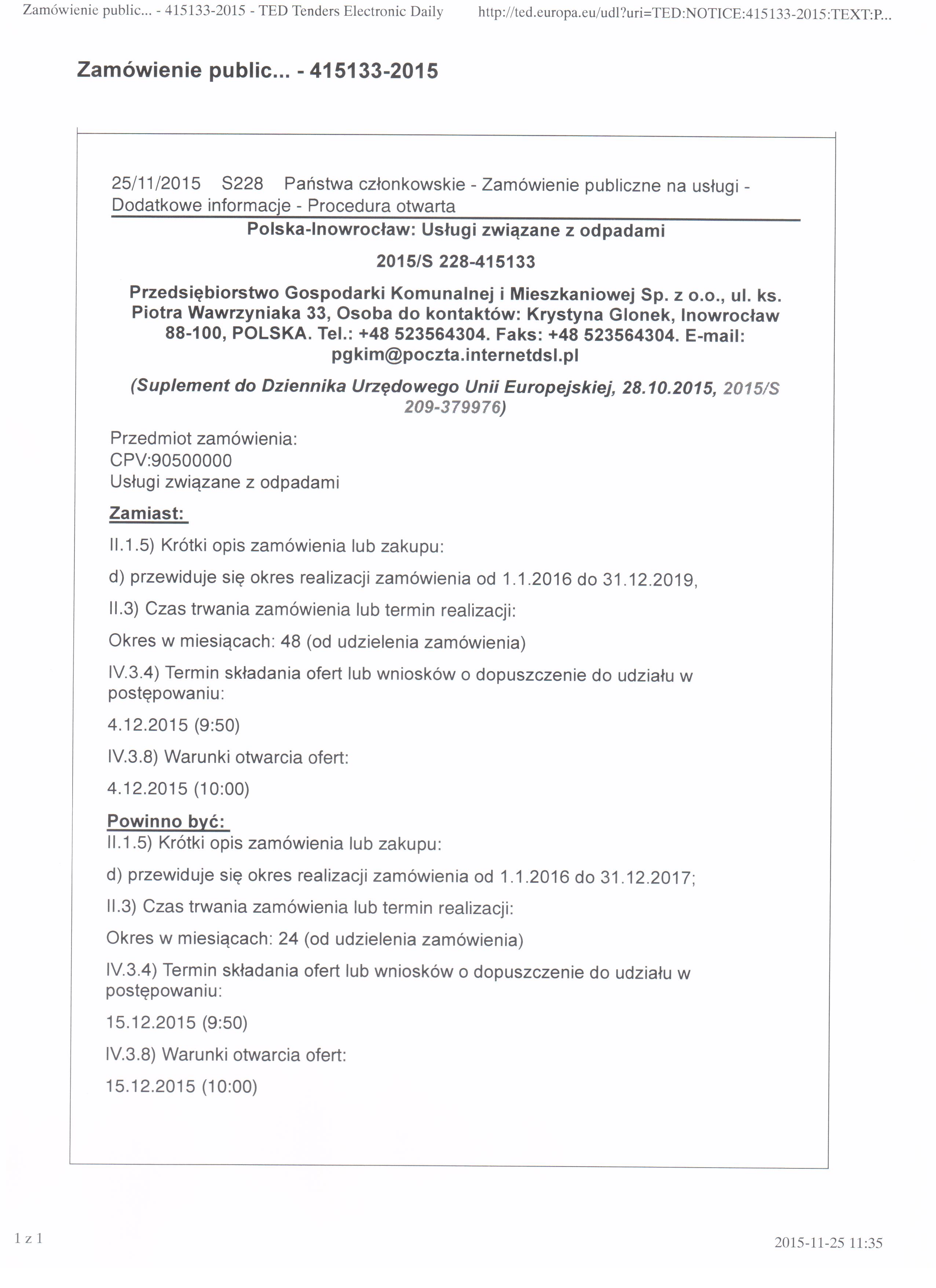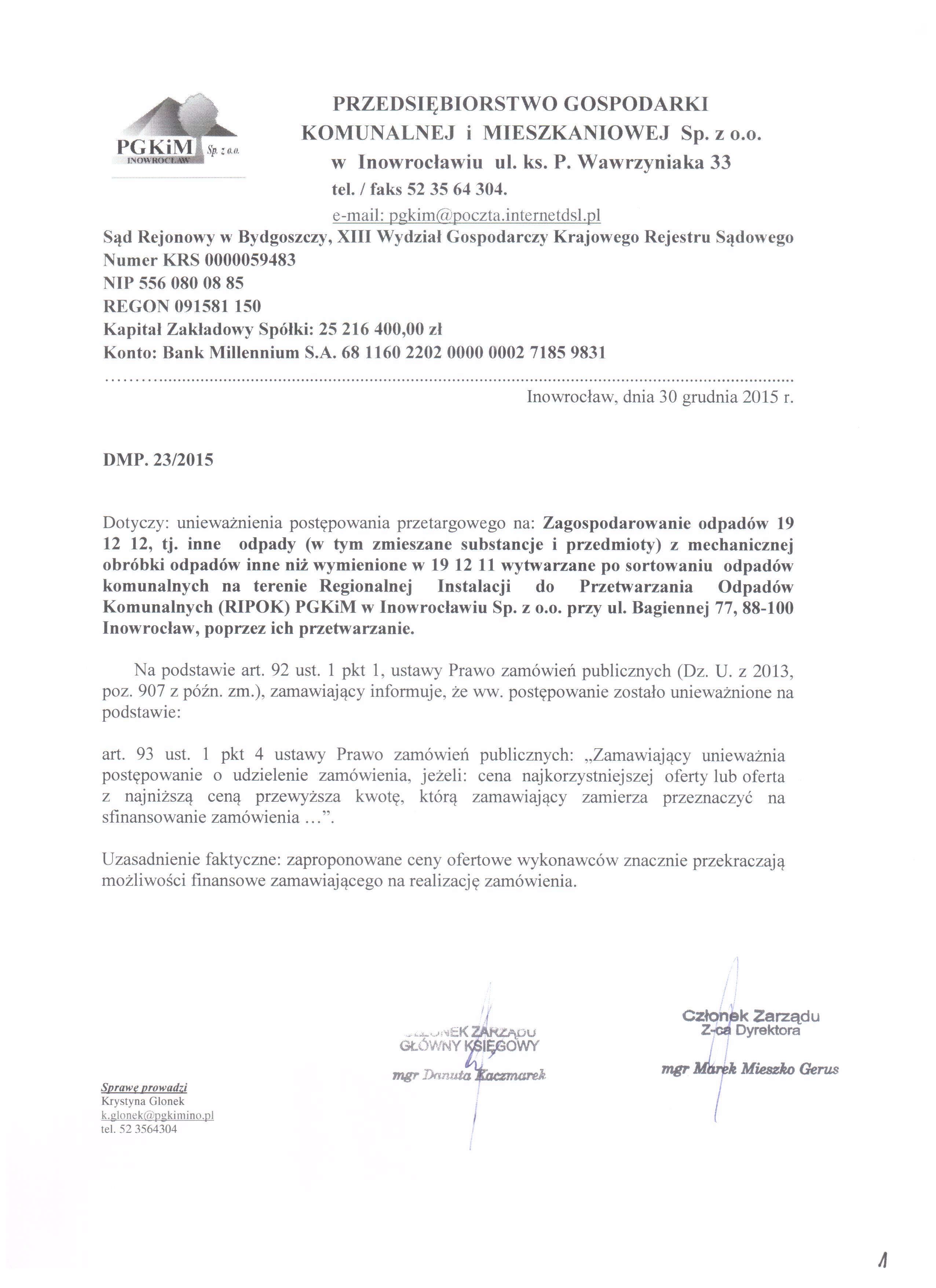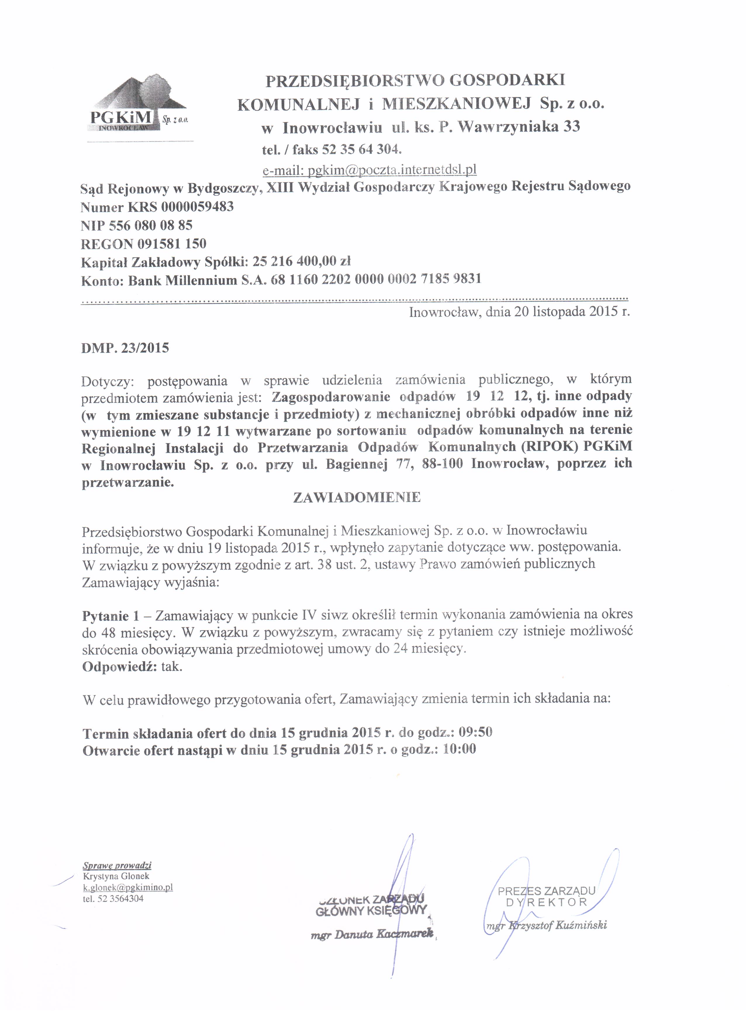 Zagospodarowanie odpad贸w 19 12 12, tj. inne odpady (w tym zmieszane substancje i przedmioty) z mechanicznej obr贸bki odpad贸w inne ni偶 wymienione w 19 12 11 wytwarzane po sortowaniu odpad贸w komunalnych na terenie Regionalnej Instalacji do Przetwarzania Odpad贸w Komunalnych (RIPOK) PGKiM w Inowroc艂awiu Sp. z o. o. przy ul. Bagiennej 77, 88-100 Inowroc艂aw, poprzez ich przetwarzanie
