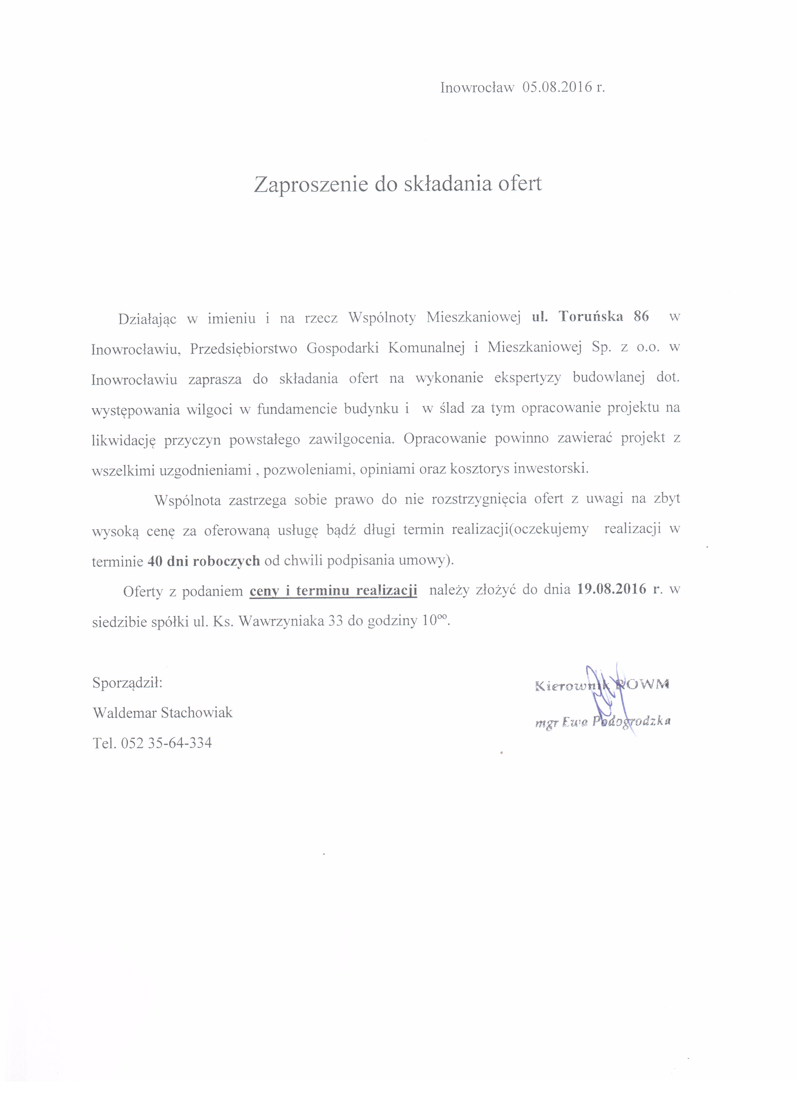 Wykonanie ekspertyzy budowlanej w zakresie występowania wilgoci dla budynku Wspólnoty Mieszkaniowej Toruńska 86 w Inowrocławiu