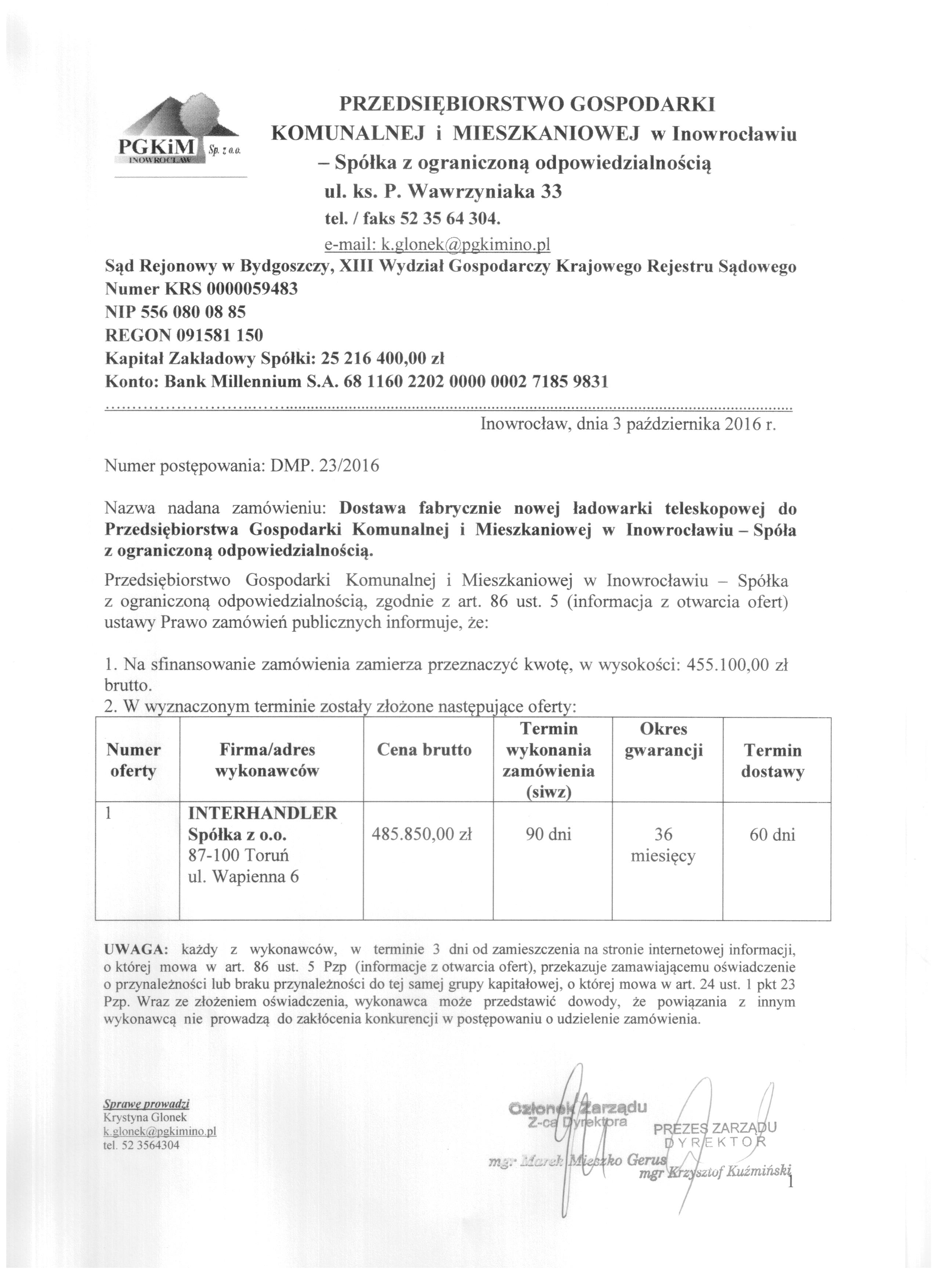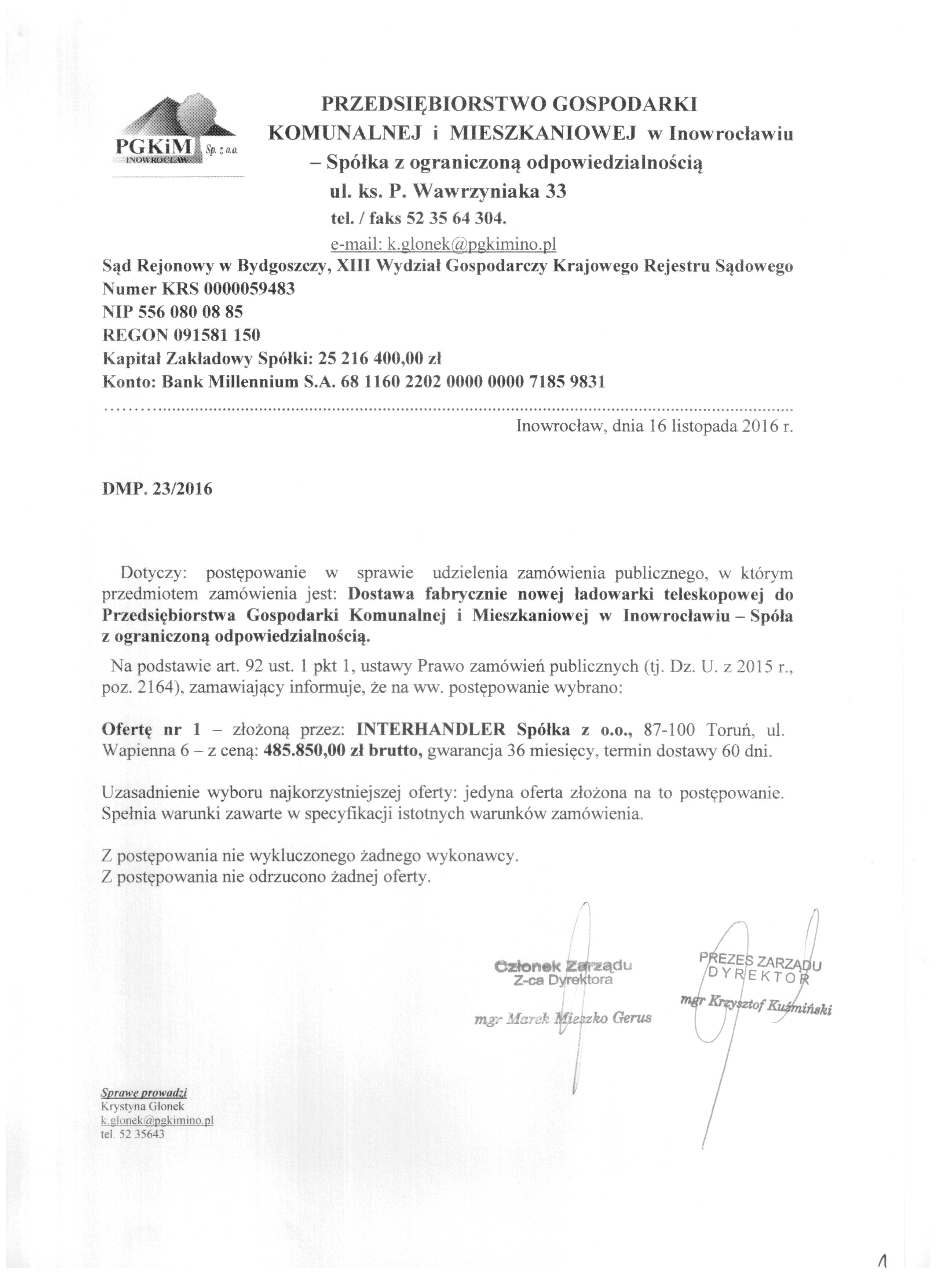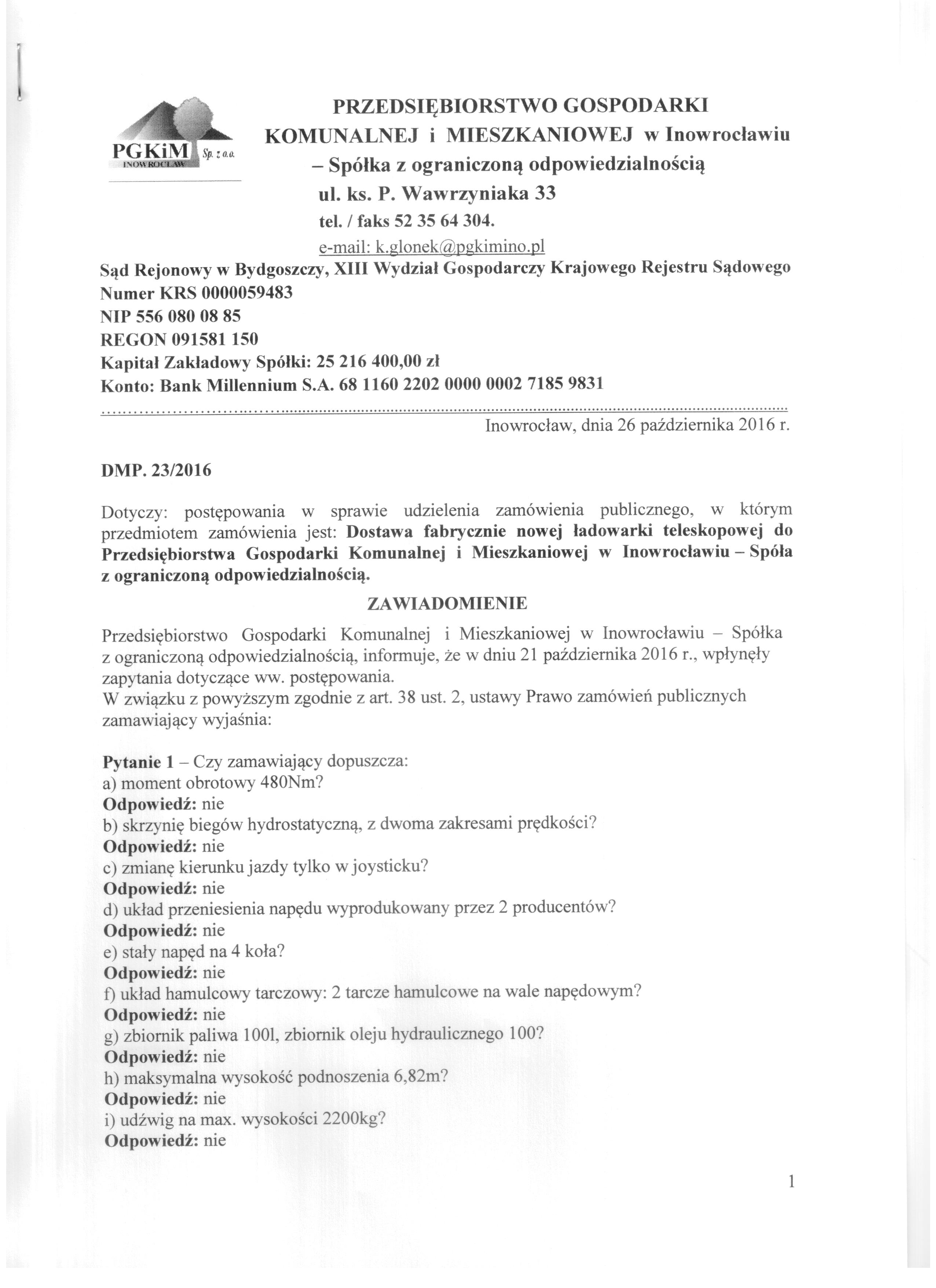 | Typ | Rozmiar | Pobierz | Komentarz | Data dodania | Licznik | ? | 23 KB | POBIERZ | Og艂oszenie o zam贸wieniu nr 326566-2016 | 2016-10-19 12:26:38 | 397 | ? | 147.1 KB | POBIERZ | Specyfikcja istotnych warunk贸w zam贸wienia | 2016-10-19 12:26:49 | 430 | graf. | 559.3 KB | POBIERZ | Odpowiedzi na zapytania | 2016-10-26 13:54:18 | 394 | graf. | 360.8 KB | POBIERZ | s.2 | 2016-10-26 13:54:32 | 377 | graf. | 609.9 KB | POBIERZ | Informacja z otwarcia ofert | 2016-11-03 10:33:39 | 379 | graf. | 540 KB | POBIERZ | Wyb贸r | 2016-11-16 10:30:29 | 367 | ? | 10.4 KB | POBIERZ | Og艂oszenie o udzieleniu zam贸wienia BZP nr 355401-2016 | 2016-11-30 13:49:03 | 347 |