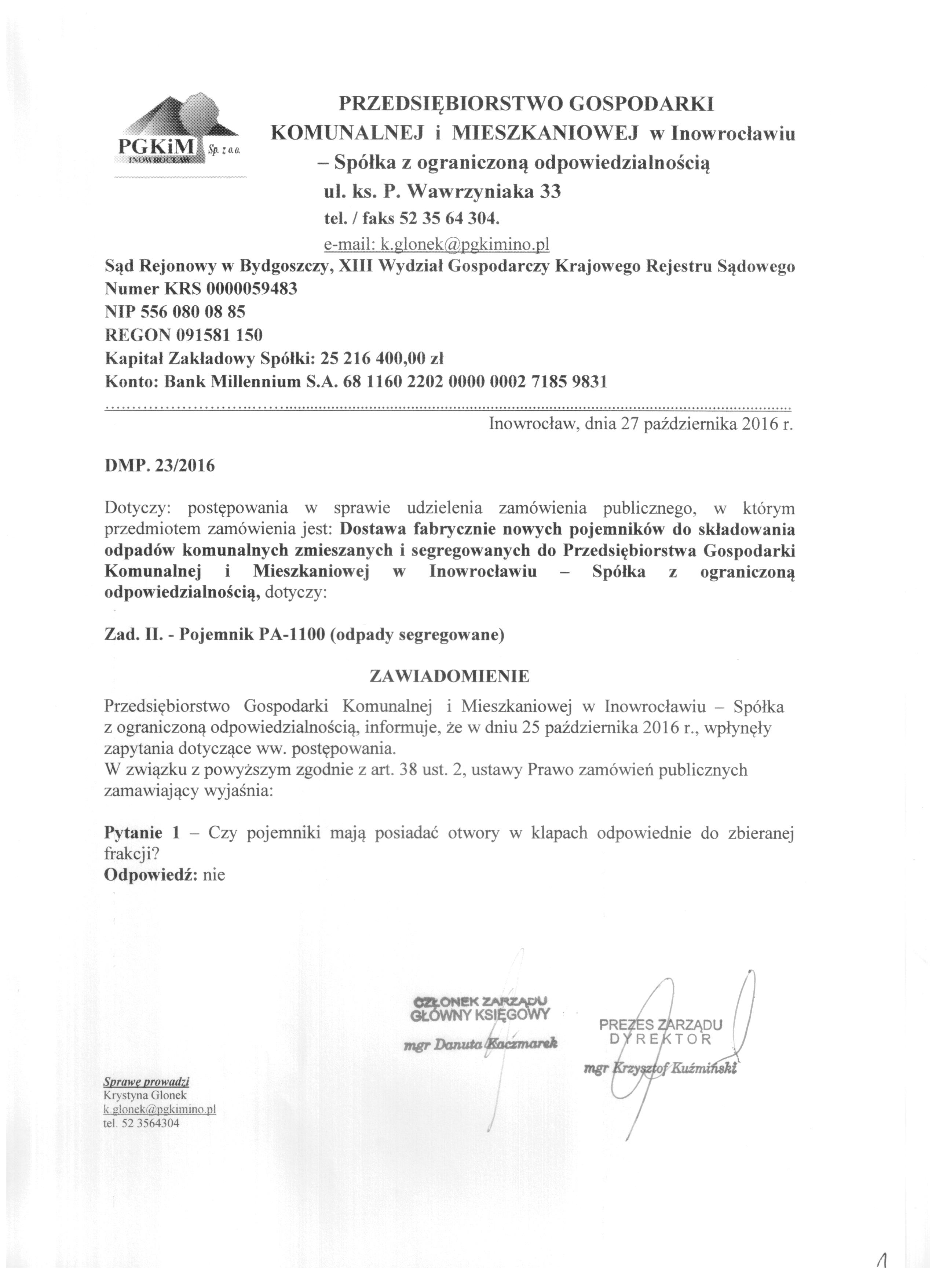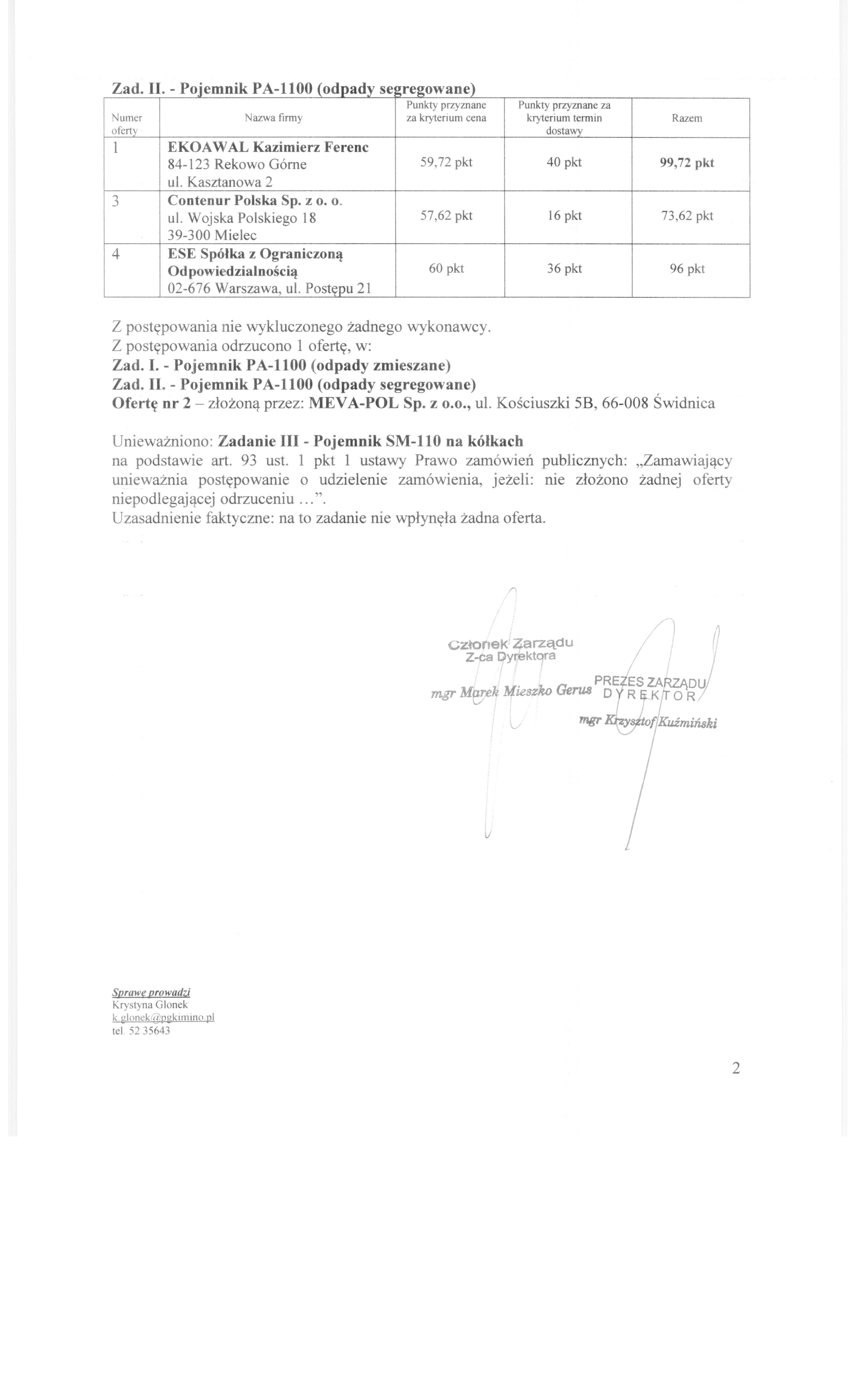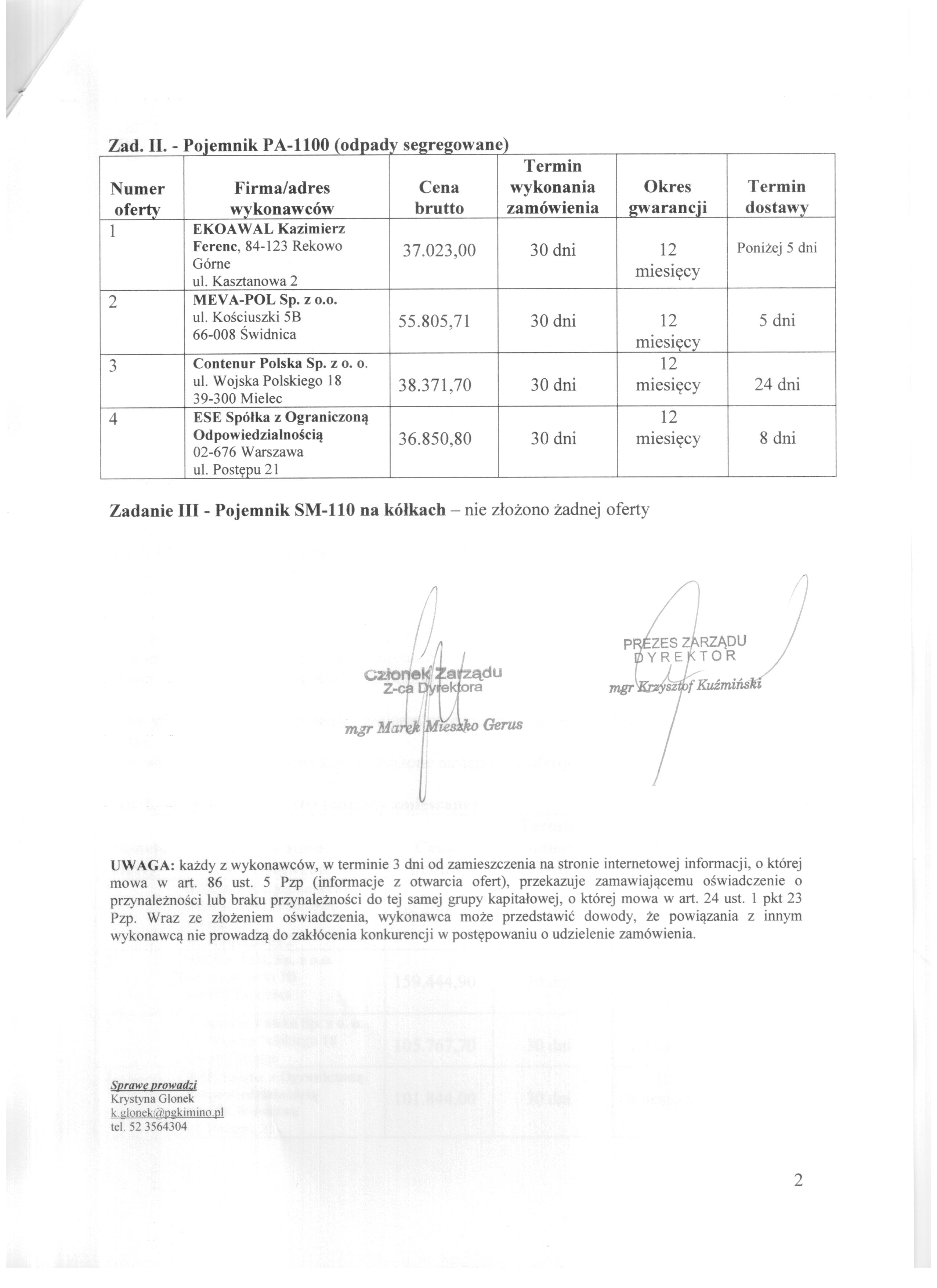 | Typ | Rozmiar | Pobierz | Komentarz | Data dodania | Licznik | ? | 26.5 KB | POBIERZ | Og艂oszenie o zam贸wieniu nr 329180-2016 | 2016-10-24 12:33:02 | 360 | ? | 145 KB | POBIERZ | Specyfikcja istotnych warunk贸w zam贸wienia | 2016-10-24 12:33:12 | 365 | graf. | 523.2 KB | POBIERZ | Odpowiedzi na zapytania | 2016-10-27 13:56:14 | 387 | graf. | 580.4 KB | POBIERZ | Informacja z otwarcia ofert | 2016-11-07 13:11:56 | 343 | graf. | 446.1 KB | POBIERZ | s.2 | 2016-11-07 13:12:10 | 355 | graf. | 569.4 KB | POBIERZ | Wyb贸r | 2016-11-16 11:10:21 | 385 | graf. | 396.8 KB | POBIERZ | s.2 | 2016-11-16 11:10:32 | 332 | ? | 14.6 KB | POBIERZ | Og艂oszenie o udzieleniu zam贸wienia BZP nr 356615 - 2016 | 2016-12-01 14:32:12 | 318 |