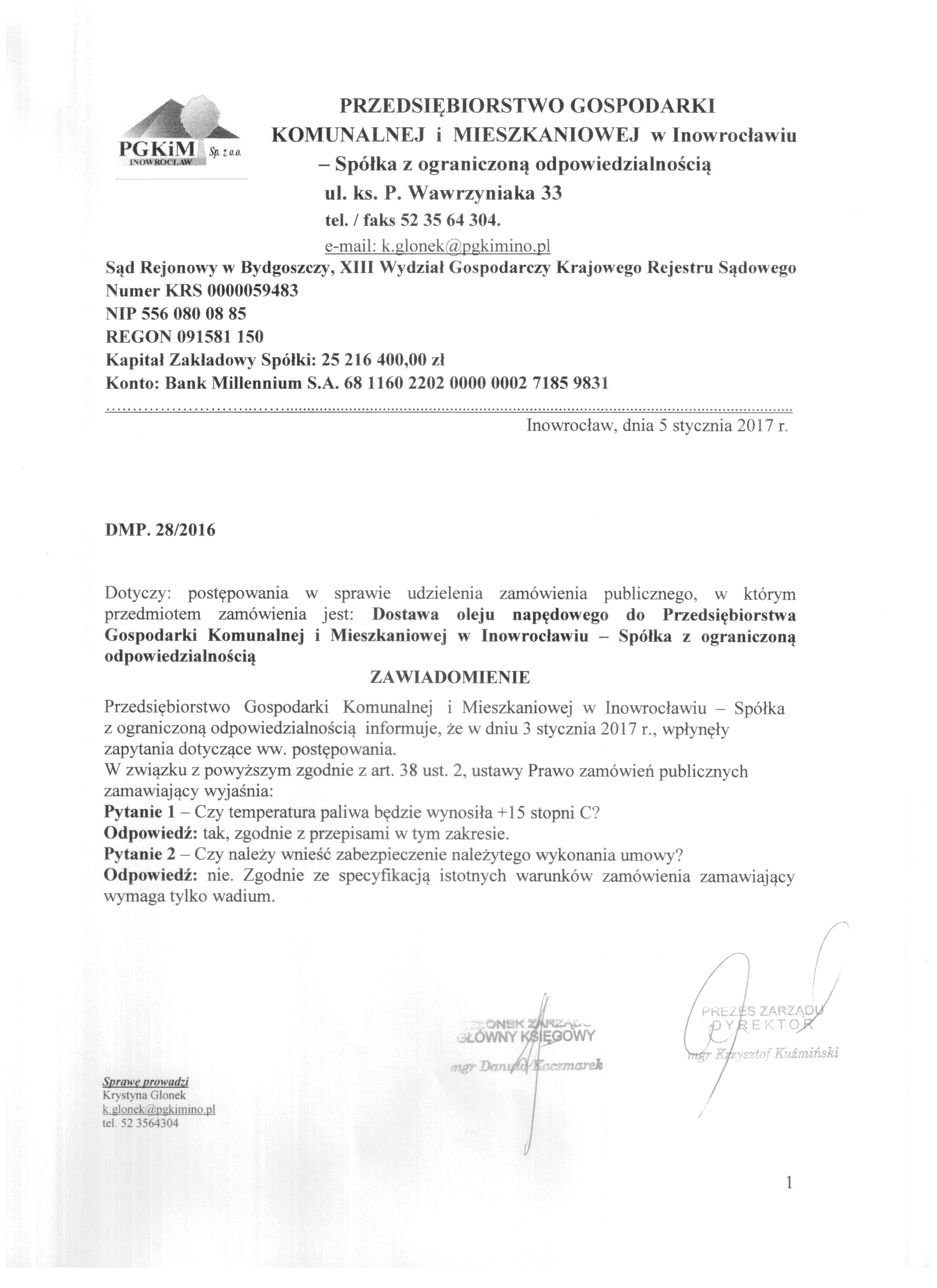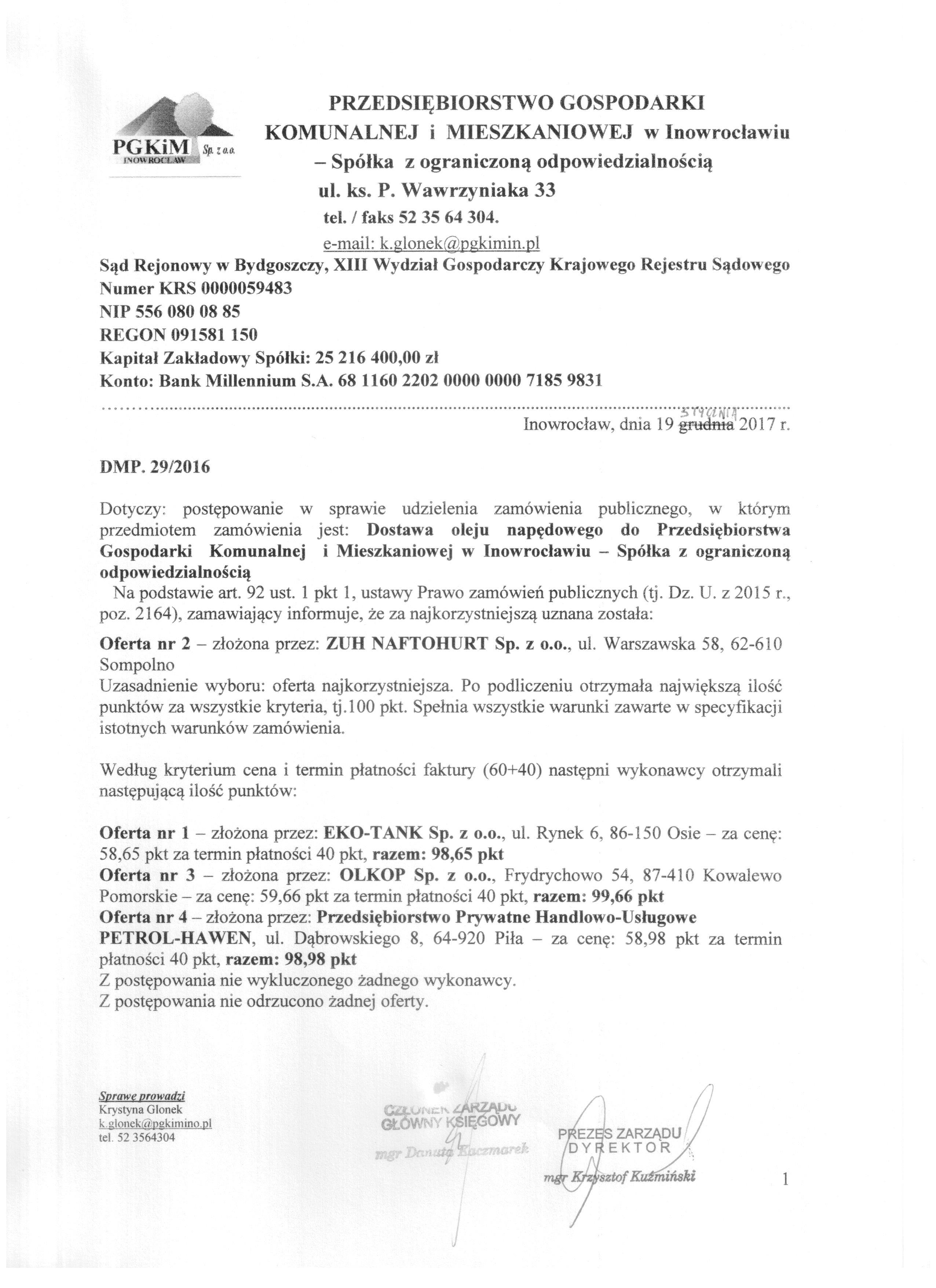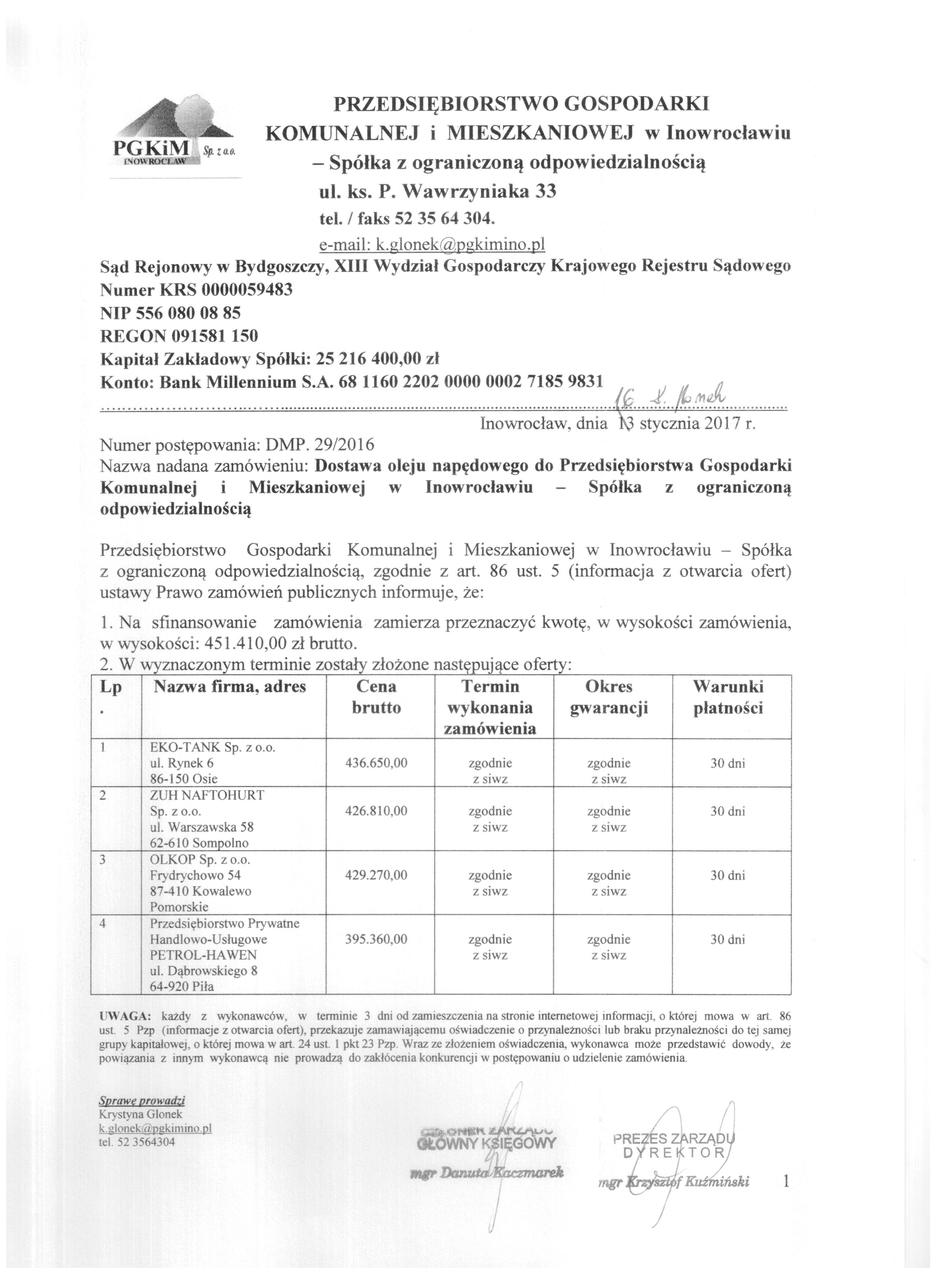 | Typ | Rozmiar | Pobierz | Komentarz | Data dodania | Licznik | ? | 24.8 KB | POBIERZ | Og艂oszenie o zam贸wieniu nr 376994-2016 | 2016-12-30 12:48:41 | 422 | ? | 145.5 KB | POBIERZ | Specyfikcja istotnych warunk贸w zam贸wienia | 2016-12-30 12:48:50 | 488 | graf. | 541.7 KB | POBIERZ | Odpowiedzi na zapytania | 2017-01-05 14:30:11 | 406 | graf. | 684.2 KB | POBIERZ | Informacja z otwarcia ofert | 2017-01-16 10:28:12 | 420 | graf. | 676.3 KB | POBIERZ | Wyb贸r | 2017-01-19 11:19:56 | 394 | ? | 13.9 KB | POBIERZ | Og艂oszenie o udzieleniu zam贸wienia nr 26243-2017 | 2017-02-16 08:28:50 | 337 |
