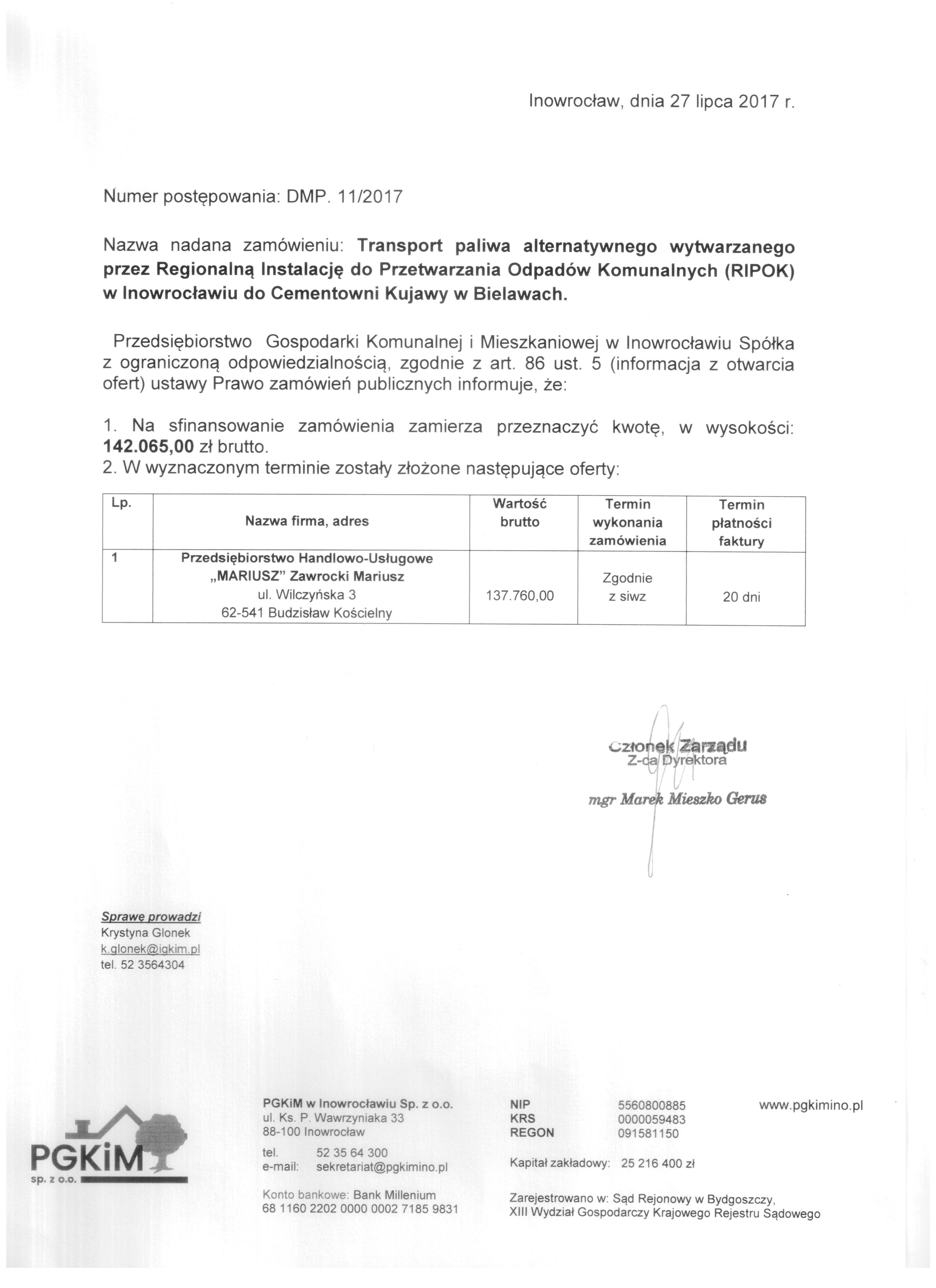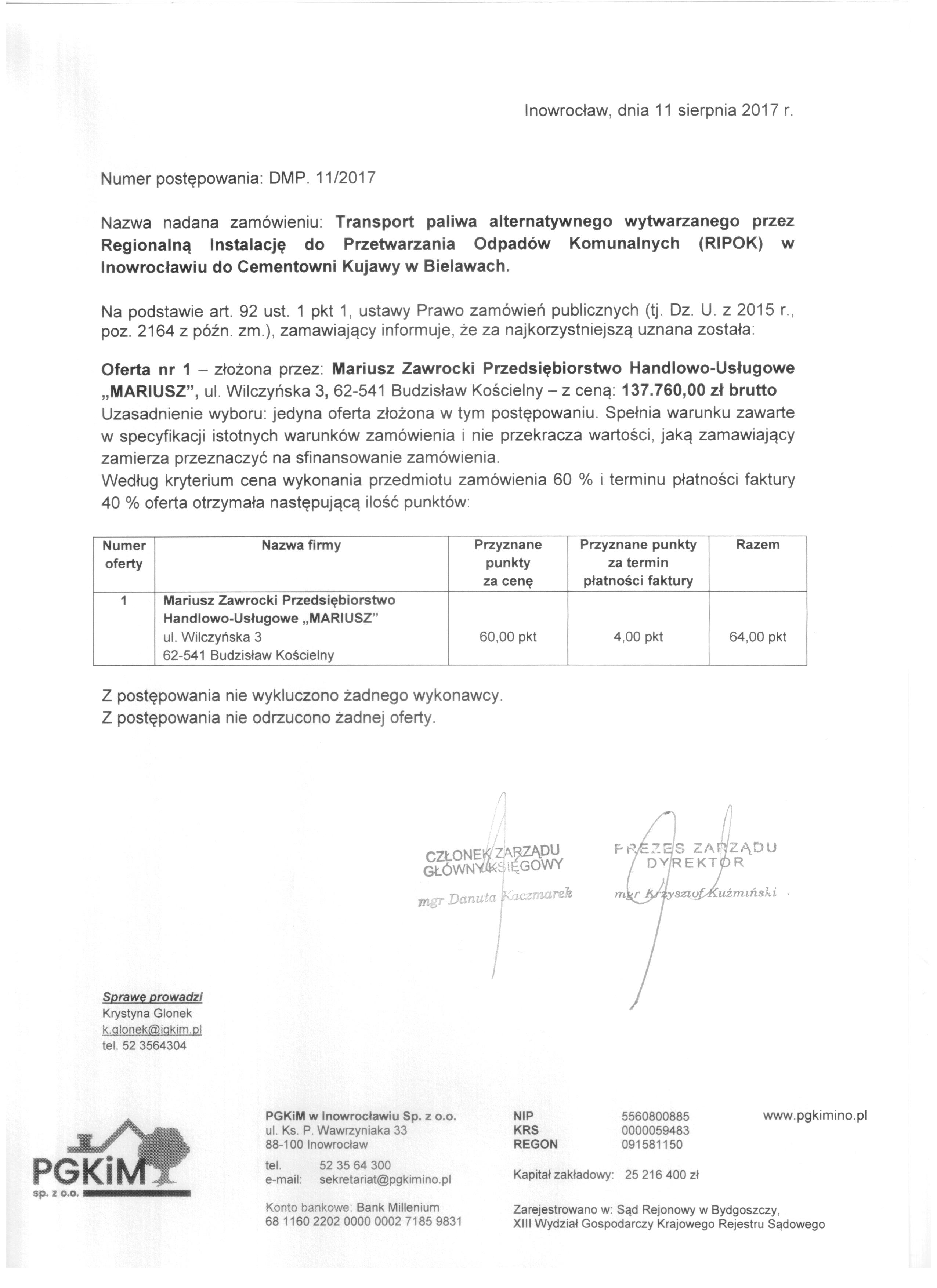 | Typ | Rozmiar | Pobierz | Komentarz | Data dodania | Licznik | ? | 20.5 KB | POBIERZ | Og艂oszenie o zam贸wieniu nr 544857-N 2017 | 2017-07-05 09:48:56 | 400 | ? | 181.7 KB | POBIERZ | Specyfikcja istotnych warunk贸w zam贸wienia | 2017-07-05 09:49:07 | 520 | graf. | 471.9 KB | POBIERZ | Informacja z otwarcia ofert | 2017-07-27 09:24:18 | 401 | graf. | 525.6 KB | POBIERZ | Wyb贸r | 2017-08-11 11:51:22 | 421 | ? | 10.4 KB | POBIERZ | Og艂oszenie o udzieleniu zam贸wienia nr 500018836-N-2017 | 2017-08-28 09:31:50 | 361 |